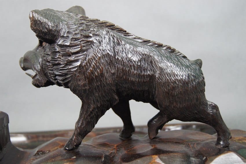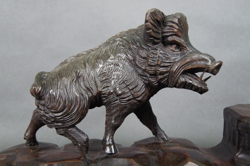 Duża, pełnoplastyczna figura przedstawiająca dzika umiejscowionego na kałamarzu. Jest to przedwojenna rzeźba ręcznie wykonana w drewnie olchowym lub lipowym. Niespotykany piękny egzemplarz, wykonany z dużą znajomością kunsztu i dbałością o szczegóły. Rzeźba wykończona politurą i woskiem. Zapraszamy do zapoznania się ze zdjęciami, na żywo obiekt prezentuje się jeszcze lepiej. Idealna jako ozdoba biurka w gabinecie lub kancelarii.