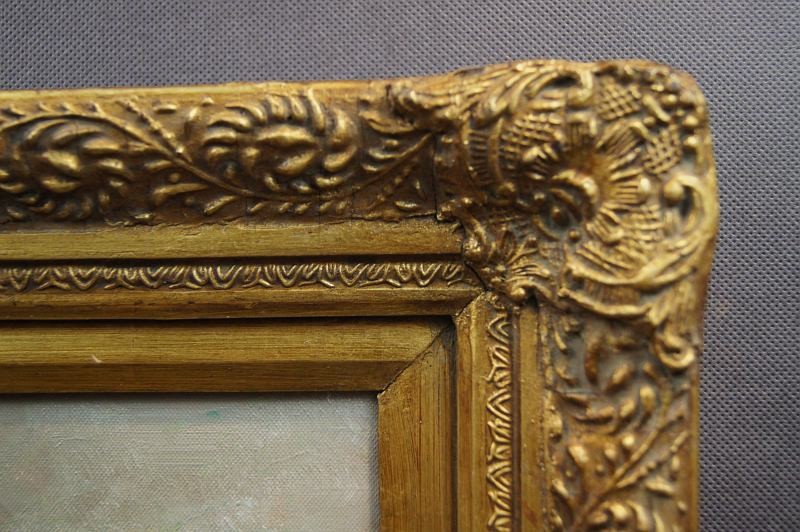Całość oprawiona w oryginalną, przestrzenną narożnikową ramę okresu powstania obrazu w kolorze złotym. Dzieło przedstawia duże walory dekoracyjne idealne do dekoracji salonu lub kuchni.
