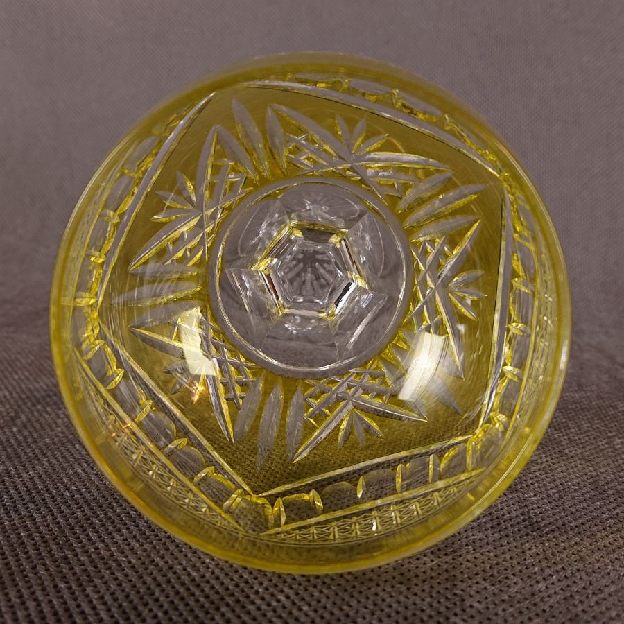 Kielich jest wykonany z wysokiej jakości szkła kryształowego. Jego najbardziej wyróżniającą cechą jest piękna, transparentna cytrynowa barwa czaszy, która świadczy o użyciu techniki szkła barwionego w masie lub nakładanego (overlay). W połączeniu z bezbarwną, krystaliczną nogą i stopą, tworzy elegancki kontrast. Kielich ma klasyczną, lecz bogato zdobioną formę, typową dla luksusowych wyrobów szklarskich z okresu przedwojennego.
