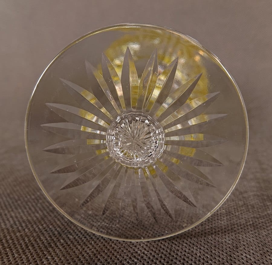 Stopa kielicha jest okrągła i solidna, zapewniająca stabilność. Wykonana z bezbarwnego szkła, jest ozdobiona promienistymi szlifami, które rozchodzą się od centrum na zewnątrz, tworząc efekt gwiazdy lub promienistego słońca. Te szlifowania są wyraźne i estetycznie współgrają z resztą kielicha.