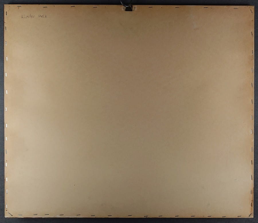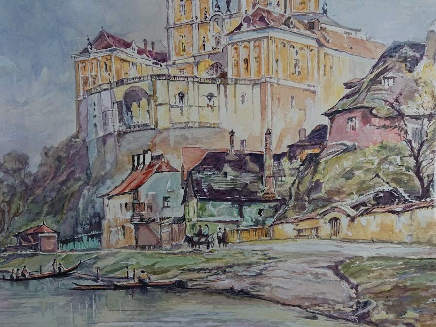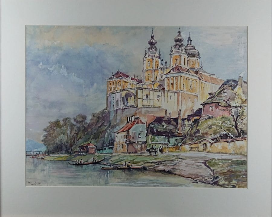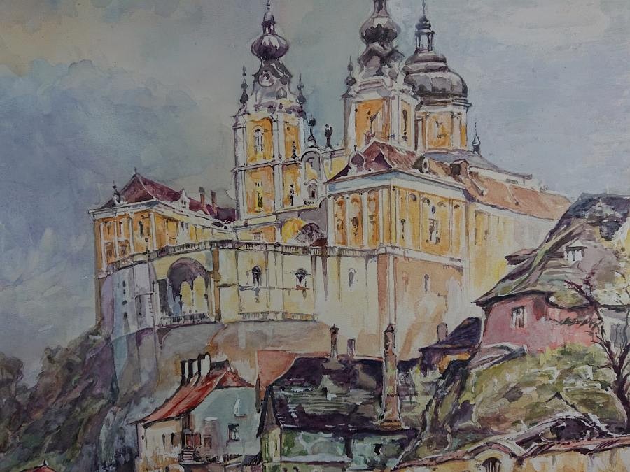 Duża akwarela z terenów Austrii przedstawia klasztor Melk leżący nad Dunajem. Wspaniała gra kolorów obraz namalowany z niezwykłą precyzją i artyzmem. Obraz malowany w technice akwareli na specjalnym papierze przeznaczonym do tego typu malarstwa. Sygnowana w lewej dolnej części odręcznie przez artystę: Benno Danitz 1987. Akwarela oprawiona jest w passe-partout, zabezpieczona szybą, i drewnianą ramę w kolorze brązu. Całość nie wymaga ingerencji, do powieszenia na ścianie. Dzieło polecamy koneserom cennego i dekoracyjnego malarstwa.