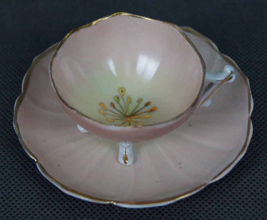Wytworna stara przedwojenna filiżanka ze spodkiem do ekspozycji w witrynie o ciekawej formie i zdobnictwie to wielkie atuty tego zestawu. Wykonana z białej porcelany o nieregularnych kształtach, udekorowana pudrowego różu i delikatnymi złoceniami. Została wyprodukowana w nieznanej wytwórni porcelany przed drugą wojną światową.