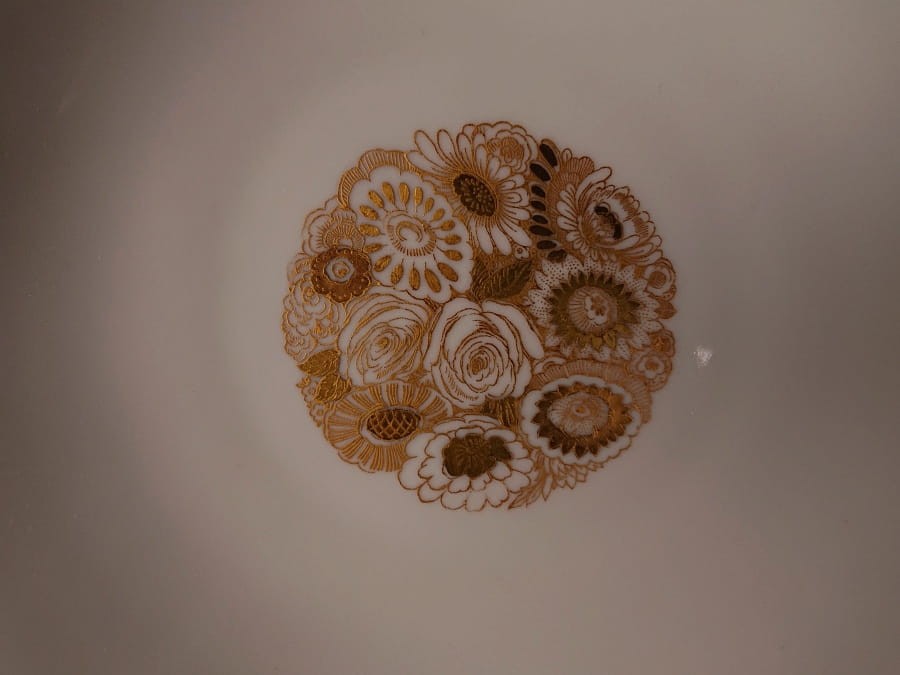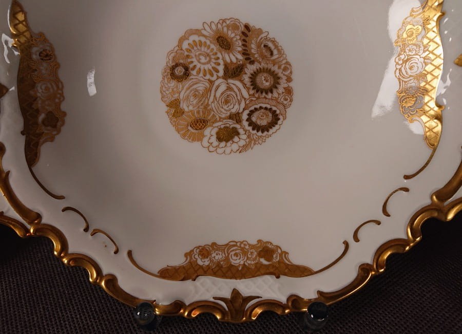Patera, ma lekko falowany brzeg, podkreślony szerokim, złoconym pasem. Po obu stronach znajdują się dekoracyjne, ażurowe uchwyty, również złocone. Wnętrze naczynia zdobi centralnie umieszczony, okrągły motyw kwiatowy w odcieniach złota, otoczony delikatnymi, złoconymi ornamentami. Dodatkowe, mniejsze motywy kwiatowe znajdują się również bliżej krawędzi naczynia.