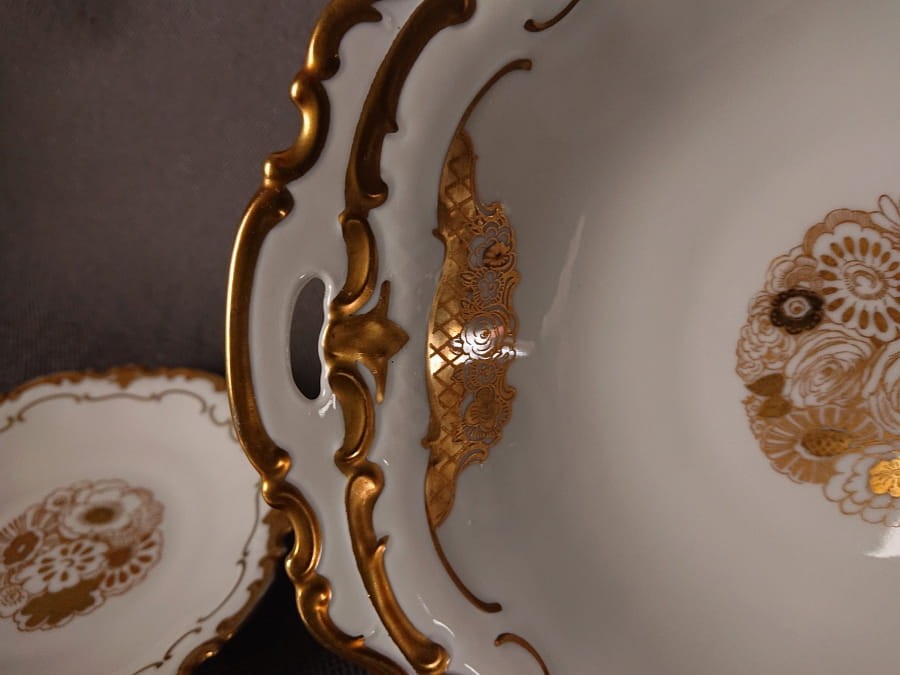 Cały komplet charakteryzuje się elegancją i bogatym zdobieniem, typowym dla wyrobów marki Reichenbach. Zastosowanie złota na białym tle porcelany tworzy luksusowy i wyrafinowany efekt. Komplet idealnie nadaje się do serwowania różnorodnych przystawek podczas eleganckich przyjęć.