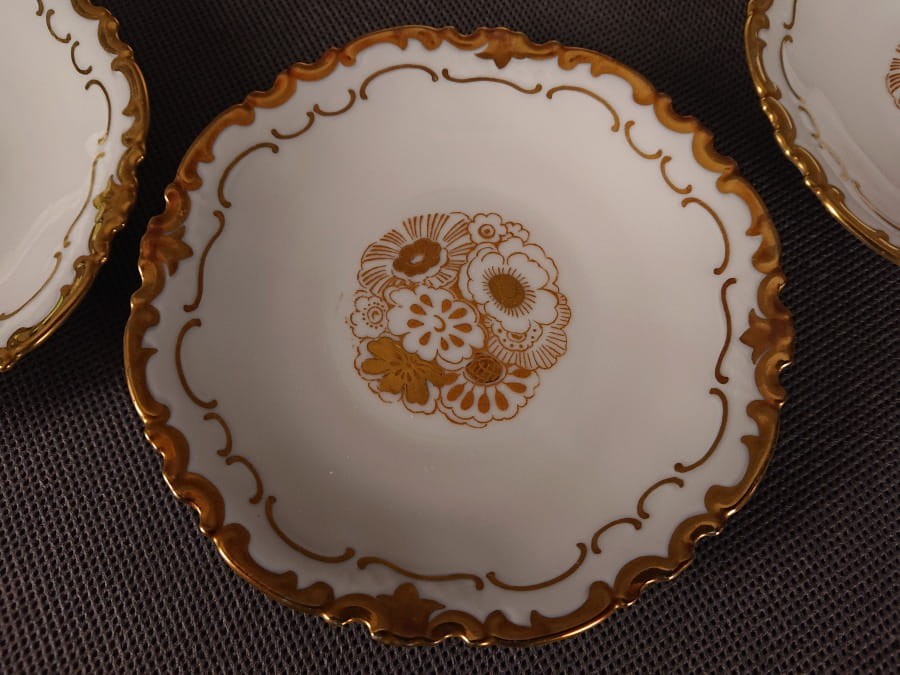 Sześć talerzyków, ma okrągły kształt z falowanym brzegiem, identycznie zdobionym złoconym pasem. Na każdym z talerzyków znajduje się centralnie umieszczony, mniejszy wariant motywu kwiatowego z większego naczynia, również w odcieniach złota.