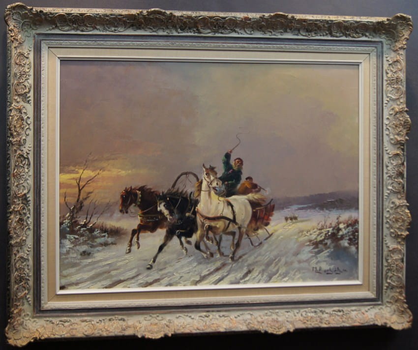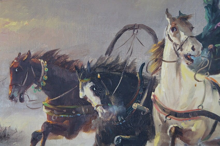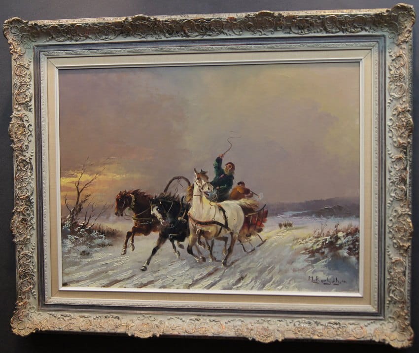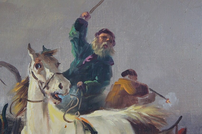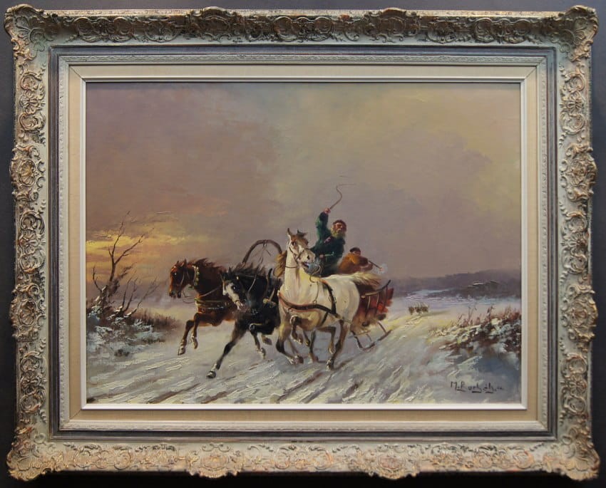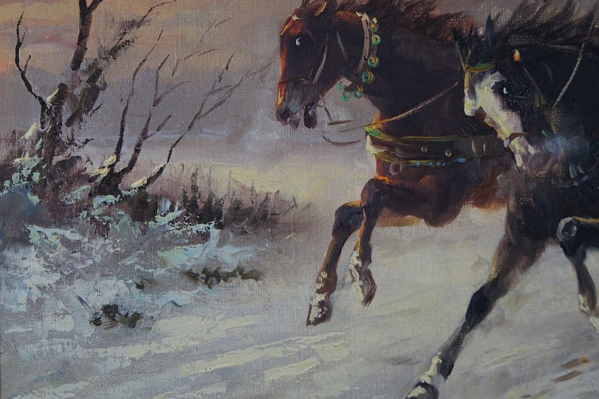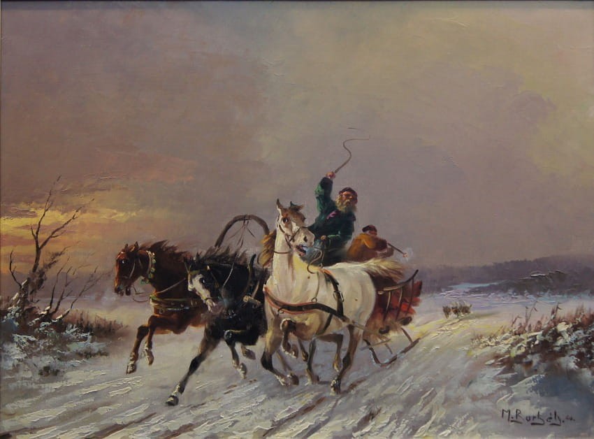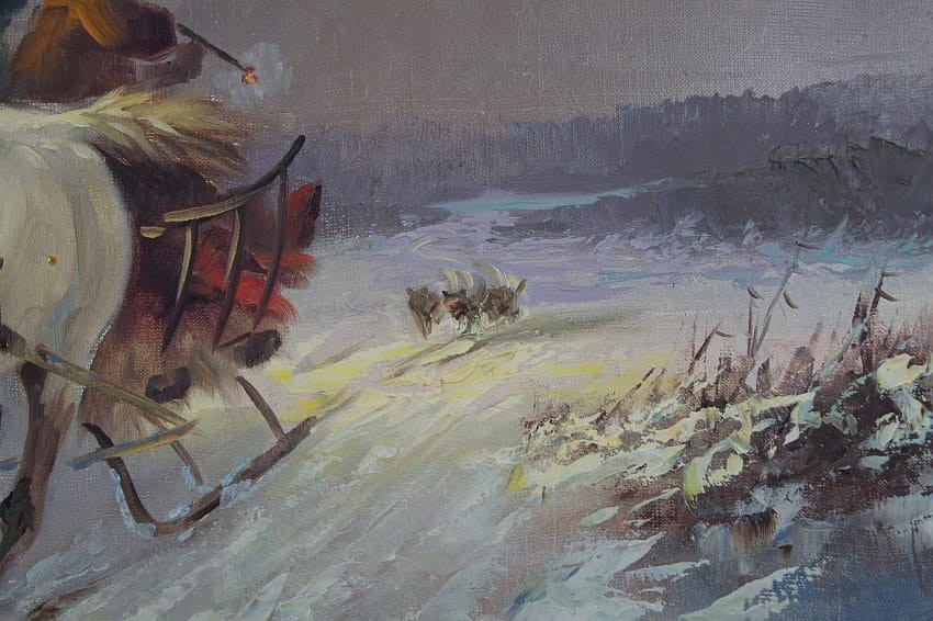Zachwycający obraz olejny, cenionego węgierskiego artysty Michaela Borbley. Dekoracyjne, profesjonalne malarstwo stworzone z dbałością o szczegóły. Obraz olejny namalowany na płótnie naciągniętym na drewniane krosno. Jest to typowy temat dla twórczości malarza, przedstawiający srogą zimę ze stadem wilków które gonią sanie zaprzęgnięte w trójkę konną.