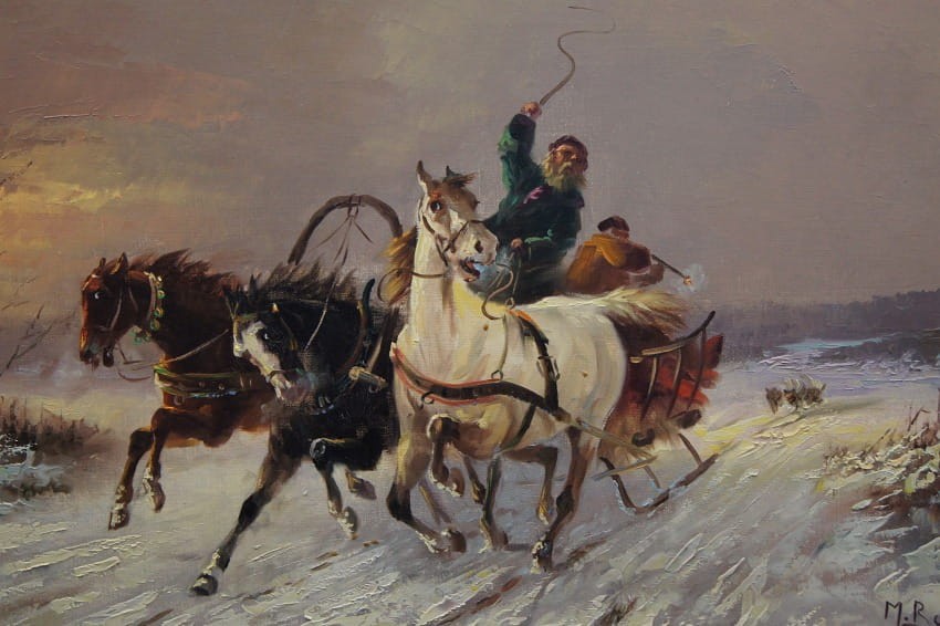 Konna trojka ścigana przez wilki w zimowej scenerii | obraz olejny Michael Borbely