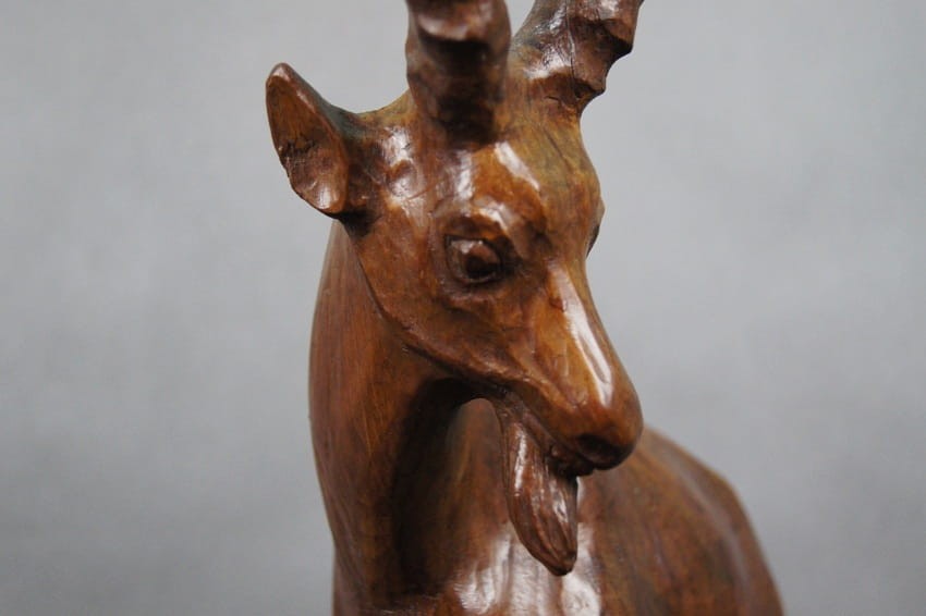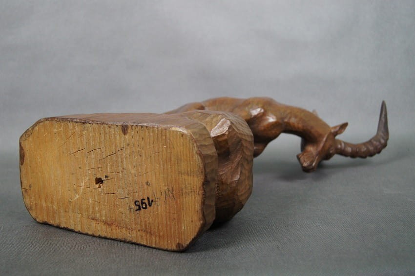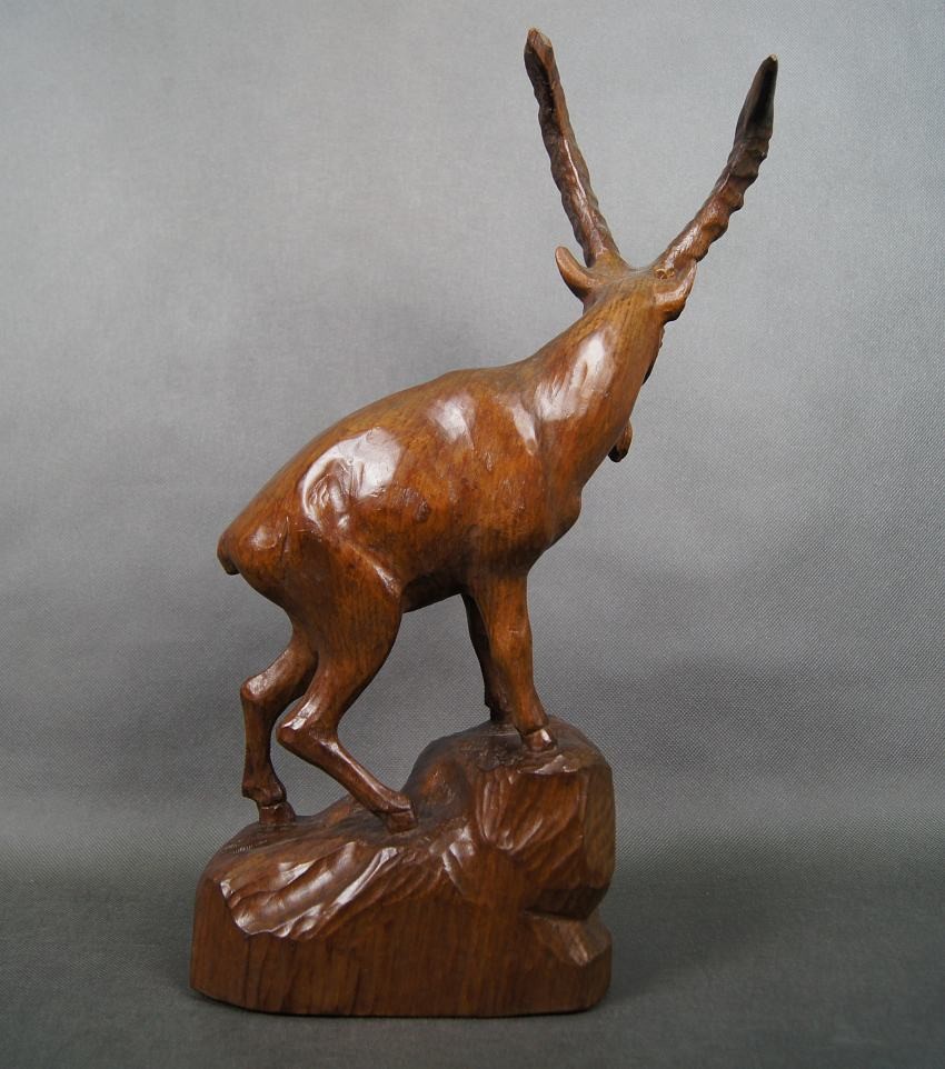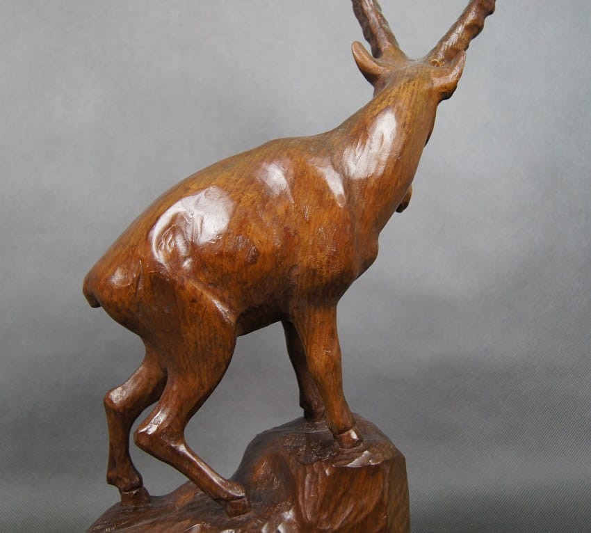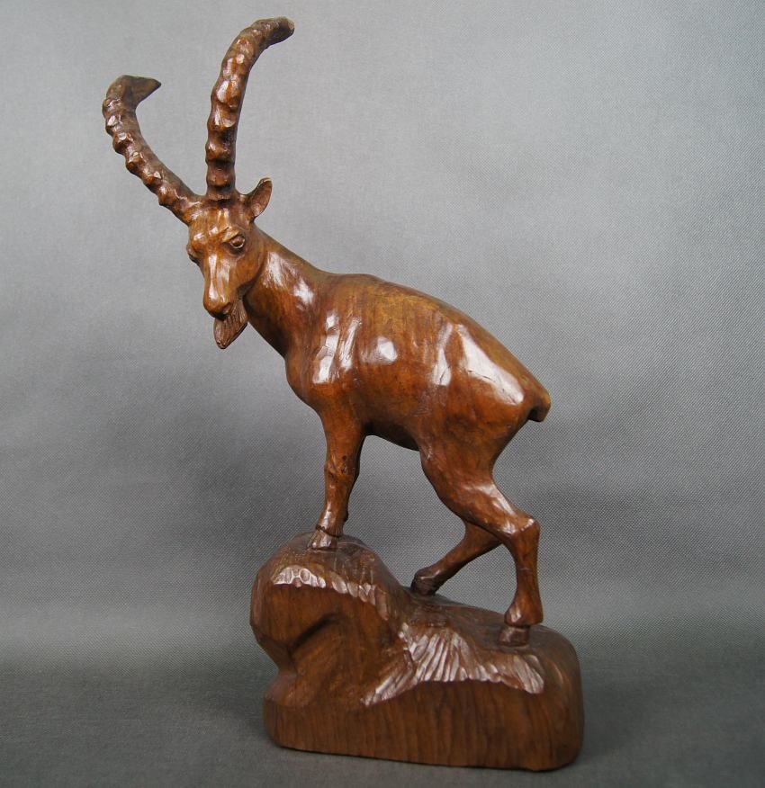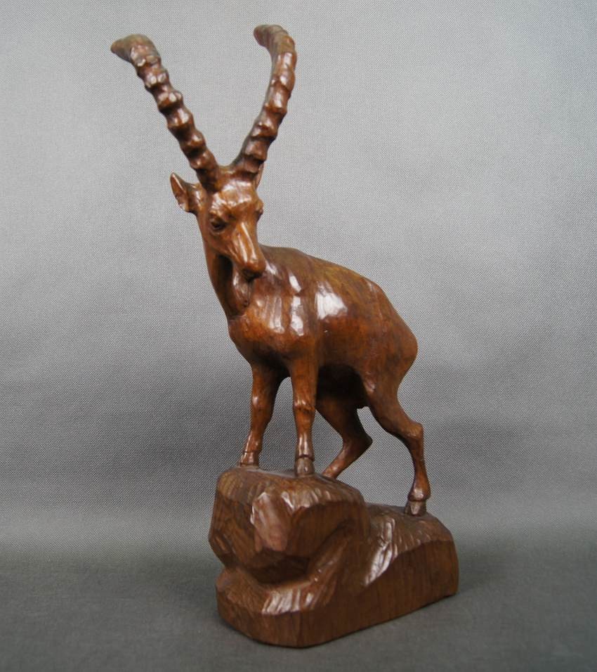 Duża, pełnoplastyczna figura przedstawiająca kozice górską. Jest to rzeźba wykonana w drewnie olchowym lub lipie. Niespotykany piękny egzemplarz, wykonany ręcznie z dużą znajomością kunsztu i dbałością o szczegóły. Rzeźba wykończona politurą. Zapraszamy do zapoznania się ze zdjęciami, na żywo obiekt prezentuje się jeszcze lepiej. Idealna jako ozdoba gabinetu lub kancelarii.