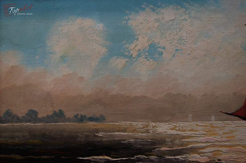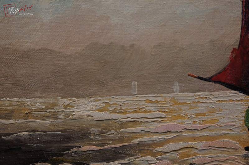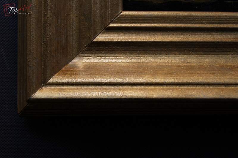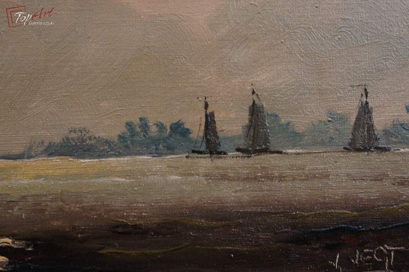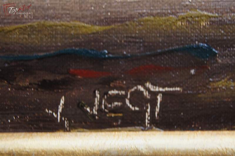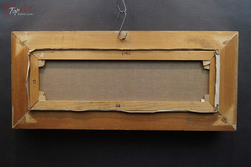 Niezwykle dekoracyjny, oryginalny obraz, o ciekawych wymiarach tak zwany format ręcznika. Obraz malowany farbami olejnymi na płótnie. Zastosowana techniką malarska: pędzel, szpachla. Sygnowany prawy dół: V. Vegt. Obraz wyróżnia się przede wszystkim zastosowaniem techniki szpachlowej, która uwypukla kładzioną fakturę farby. Bardzo dobrze zachowana kolorystyka. Całość oprawiona w oryginalną, starą, okazałą przestrzenną ramę. Stan zachowania bardzo dobry nie wymaga jakichkolwiek interwencji. Wymiary: całości z ramą 42 cm x 96 cm, płótno 25 cm x 80 cm.