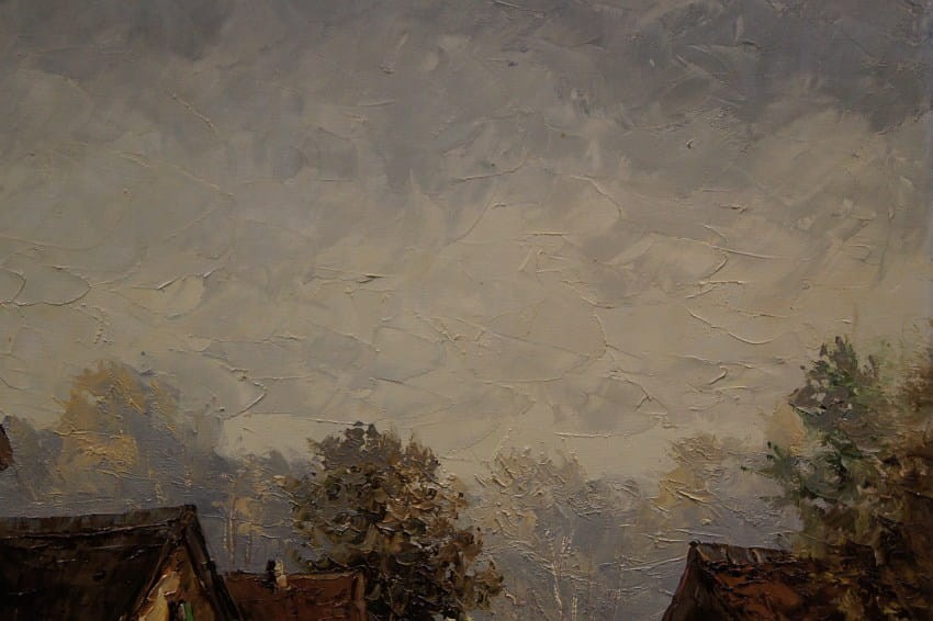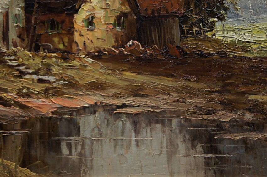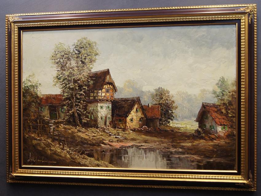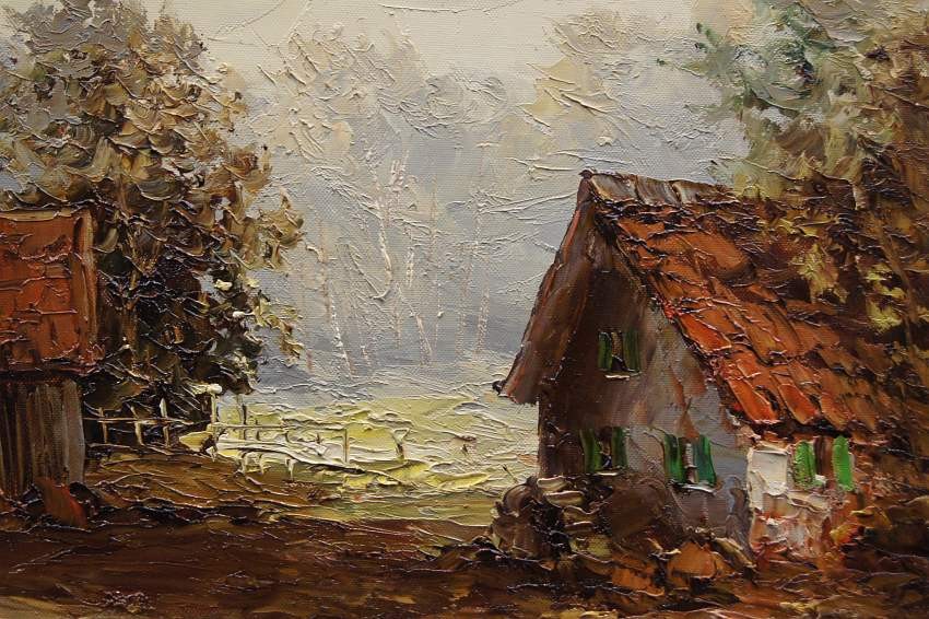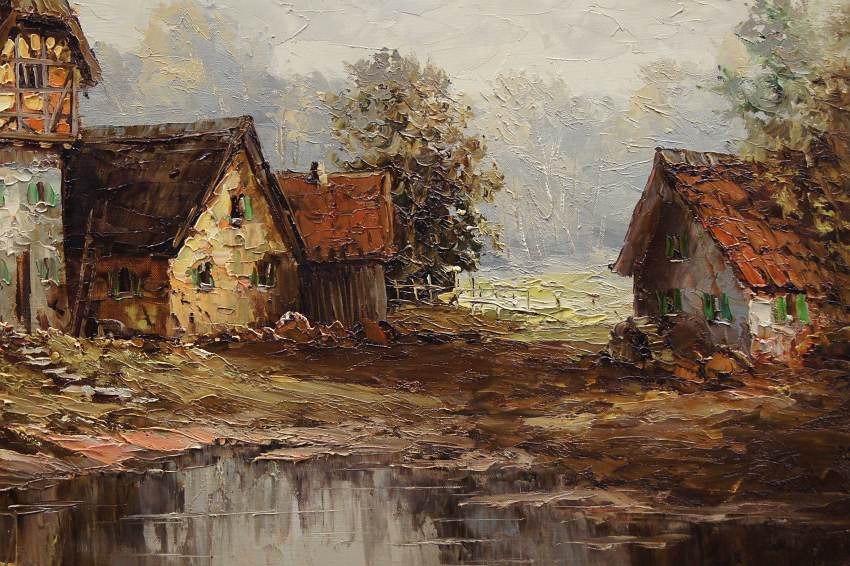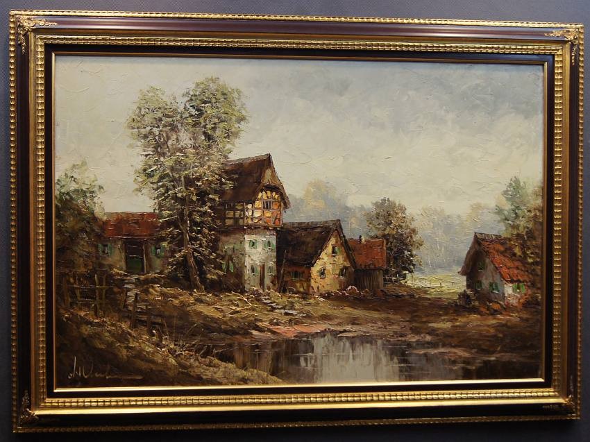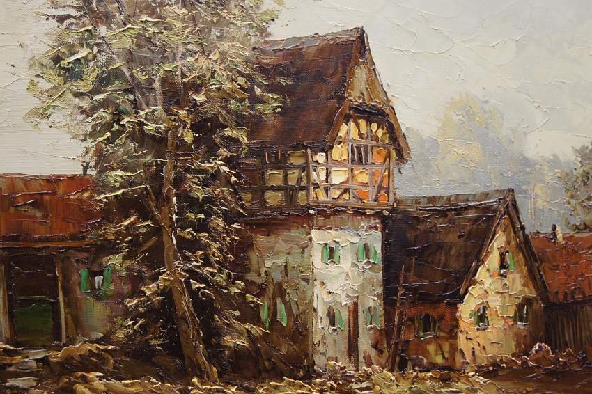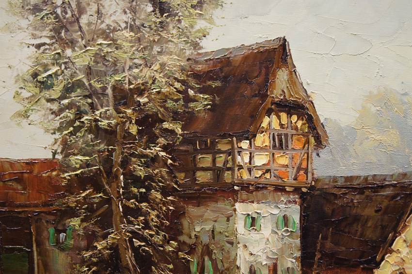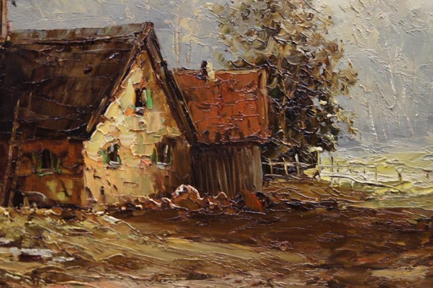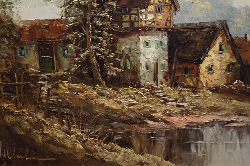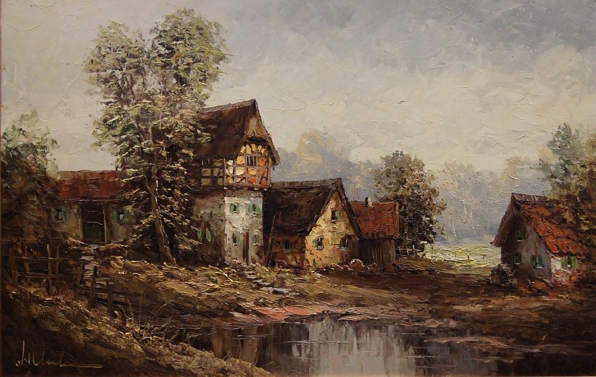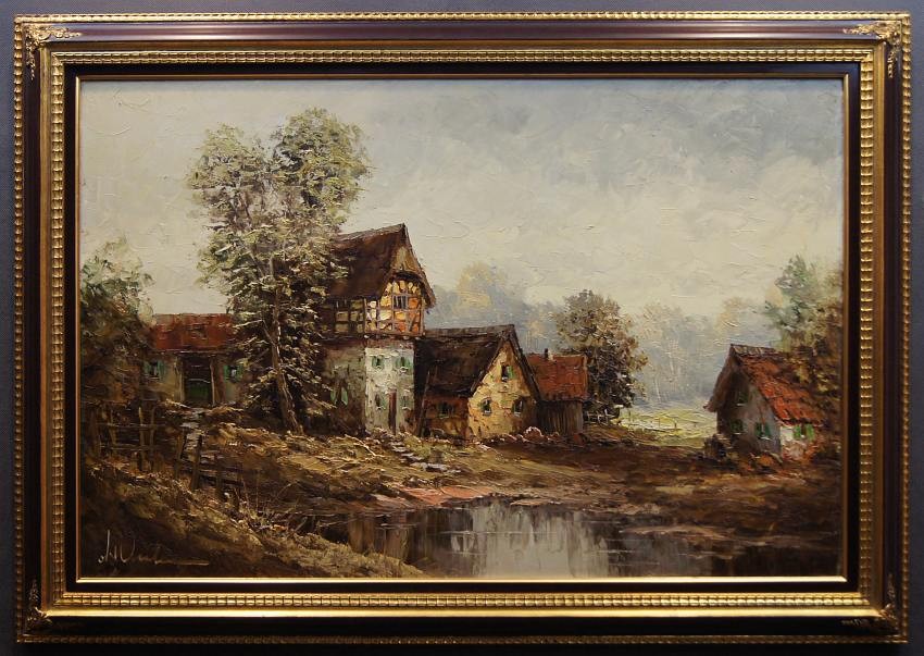 Bardzo dobra, perfekcyjnie wykonana praca jedna z lepszych tego artysty. Obraz olejny namalowany na płótnie rozciągniętym na drewnianym krośnie. Jest to oryginalne dzieło przedstawiające wiejskie zabudowania w letnie ciepłe popołudnie. Praca tętniąca życiem, emanująca ciepłymi kolorami w jakich została wykonana. Obraz został namalowany w drugiej połowie XX wieku. Struktura nałożonej farby jest mocno uwypuklona i wyczuwalna pod palcami. Sygnowany odręcznie przez twórcę w lewym dolnym narożniku: A. Wendehals. Zdecydowane pociągnięcia pędzla i szpachli artysty, świadczą o wysokim profesorskim kunszcie malarskim.