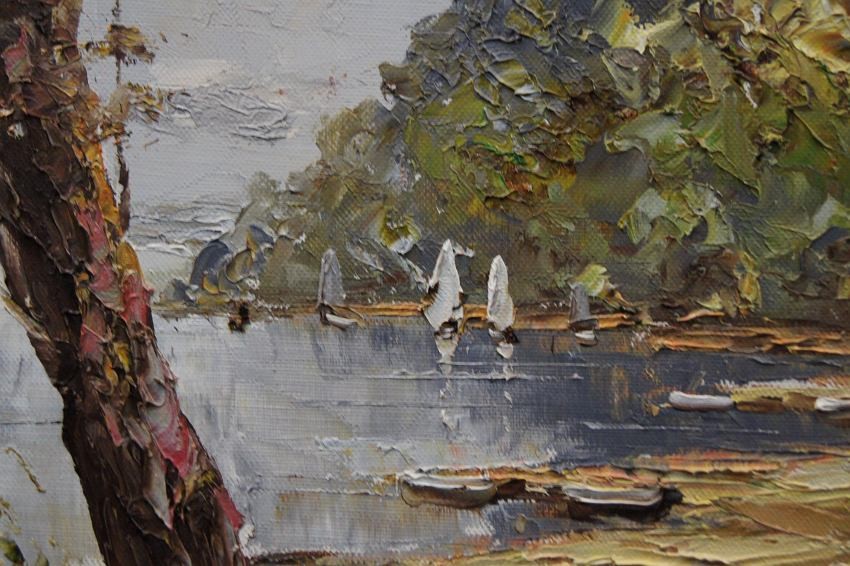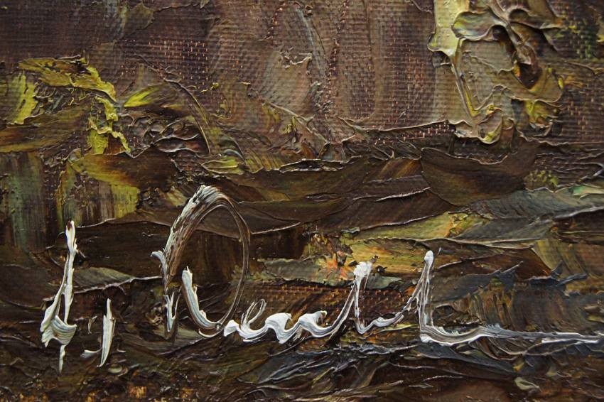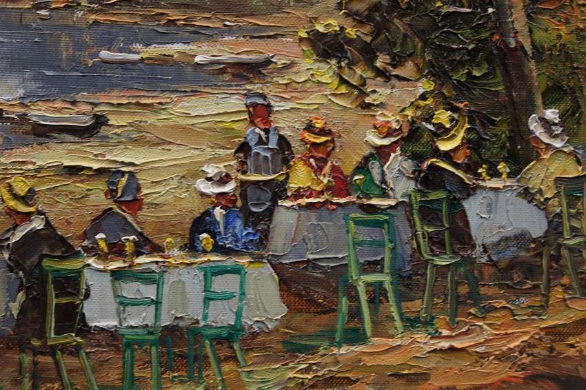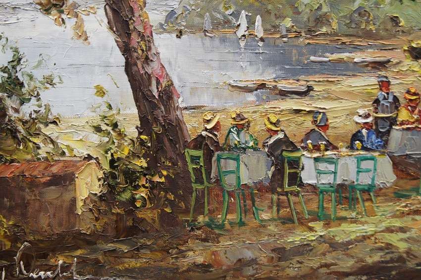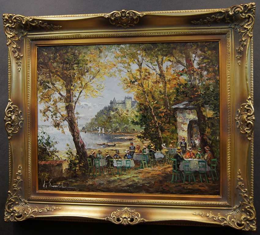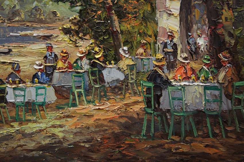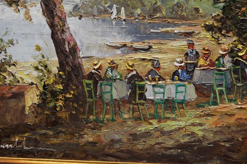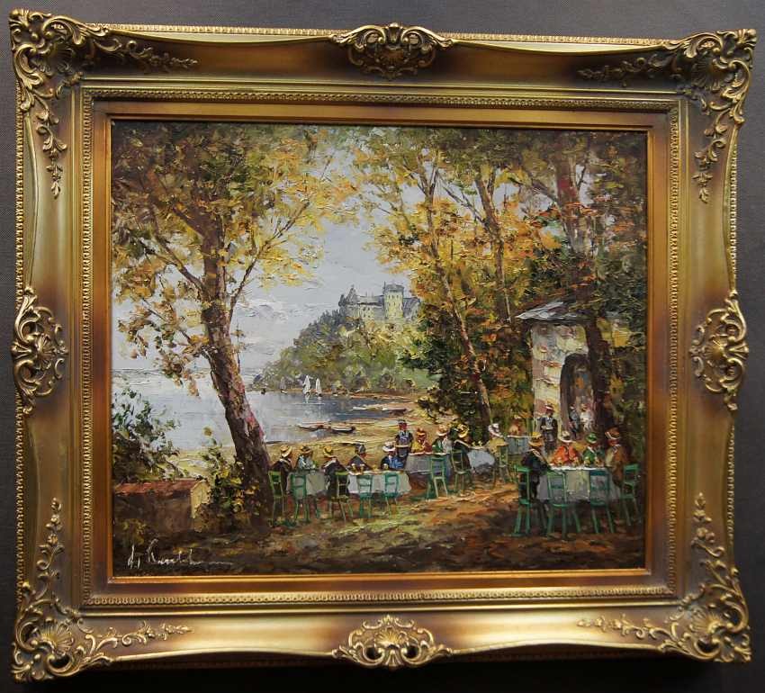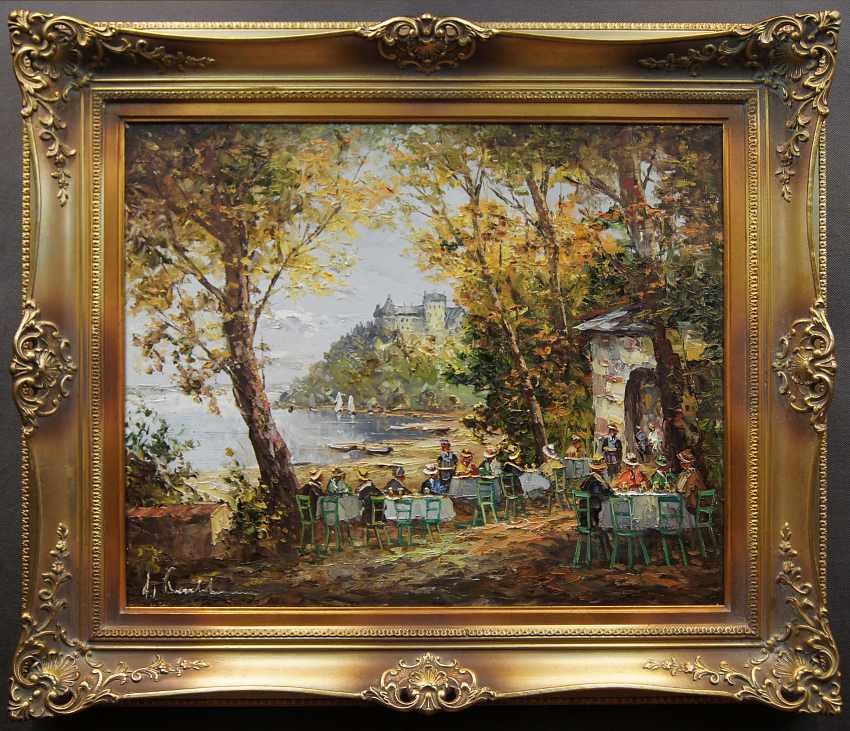 Bardzo dobra, perfekcyjnie wykonana praca jedna z lepszych tego artysty. Obraz olejny namalowany na płótnie. Jest to oryginalne dzieło przedstawiające letnią kawiarenkę położoną w lesie nad jeziorem. Praca tętniąca życiem, widzimy na niej liczne postacie . Obraz pochodzi z lat 60 - 70 XX wieku. Struktura nałożonej farby wyczuwalna jest pod palcami. Sygnowany odręcznie przez twórcę w prawym dolnym narożniku: A. Wendehals. Zdecydowane pociągnięcia pędzla i szpachli artysty, świadczą o wysokim profesorskim kunszcie malarskim.