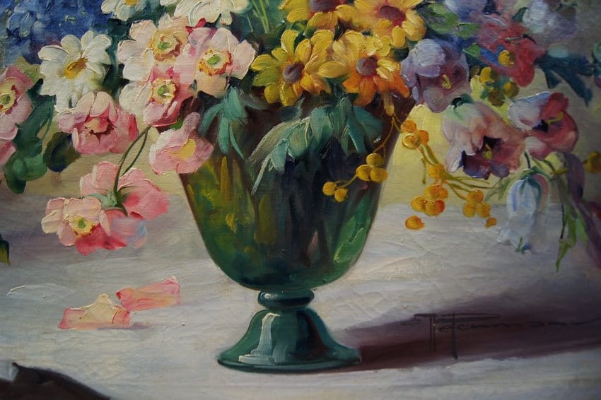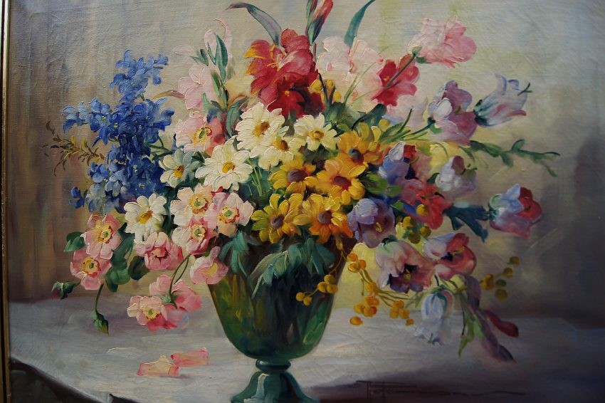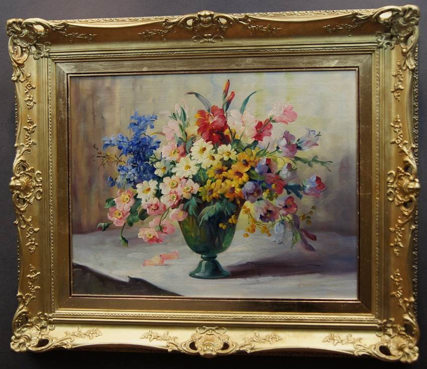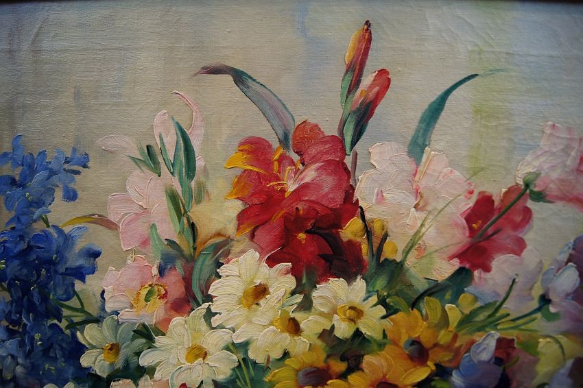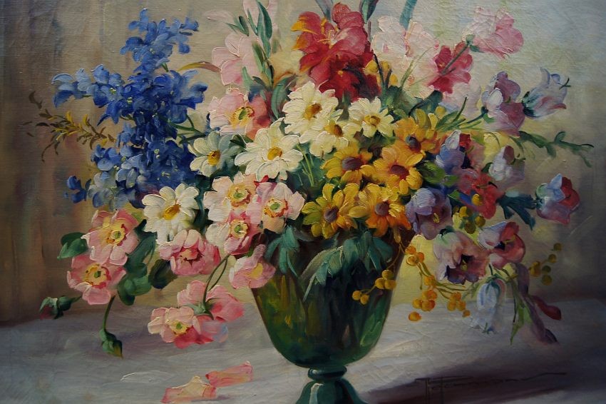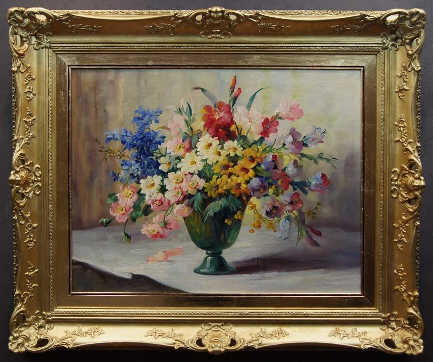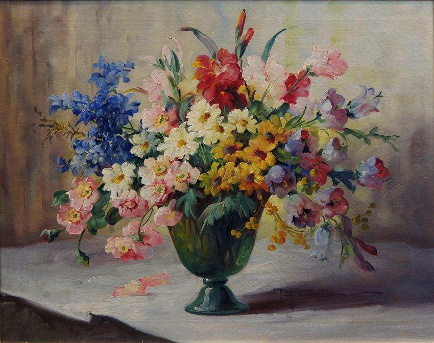 Przedstawiamy Państwu kolejny oryginalny, obraz olejny na płótnie autorstwa znakomitej niemieckiej malarki Hedwig Petermann. Dzieło charakteryzuje jak przystało na twórczość artystki, miękkość modelunku i rzeczywiste odwzorowanie piękna natury. Obraz malowany farbami olejnymi na płótnie. Przedstawia uroczy bukiet letnich ogrodowych kwiatów w wazonie.