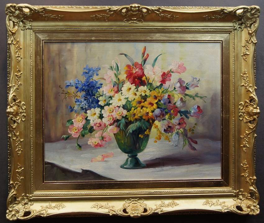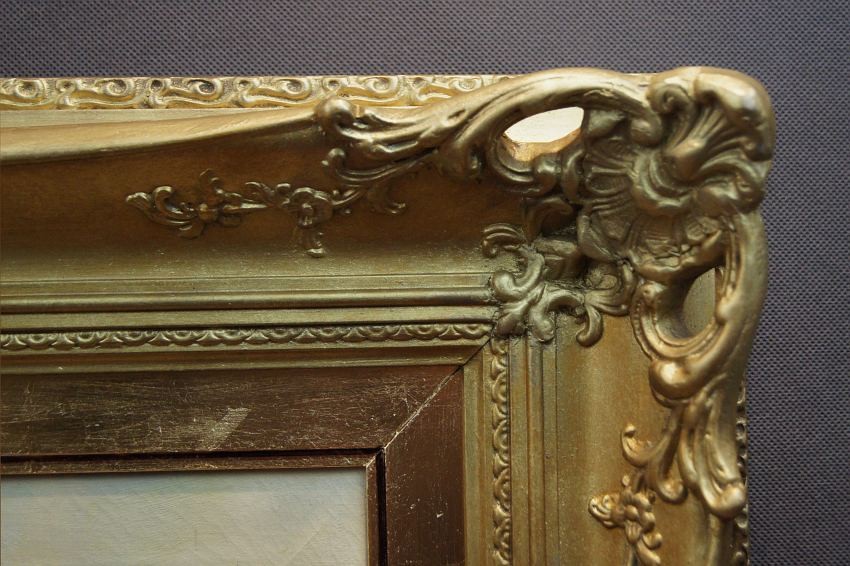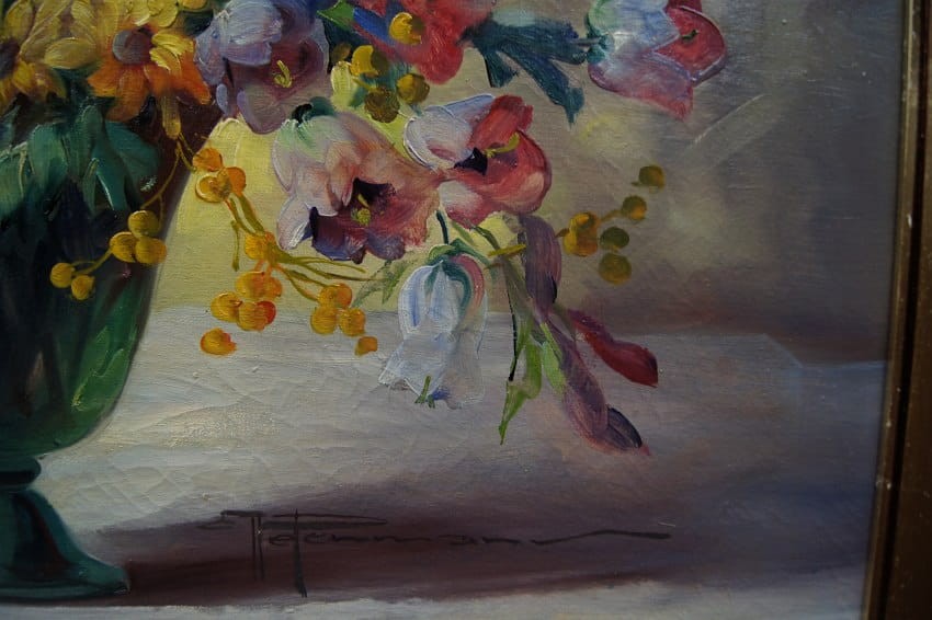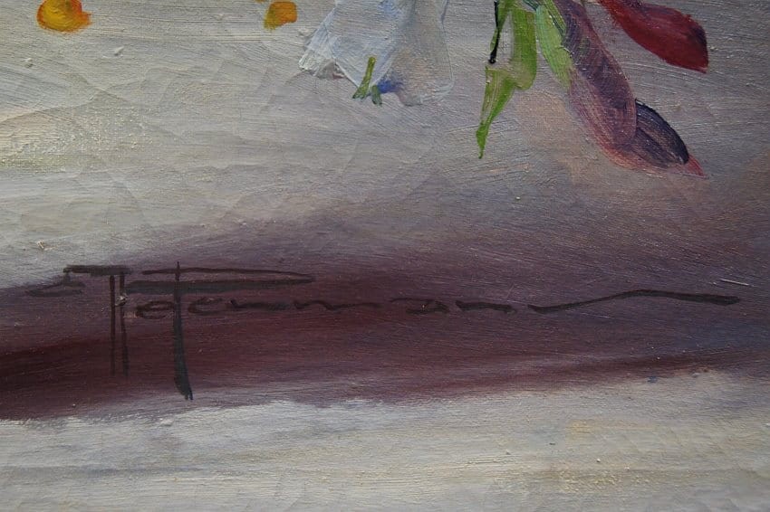 Sygnowany odręcznie przez artystkę w prawej dolnej części obrazu: H. Petermann. Płótno oprawione w oryginalną, dekoracyjną, przestrzenną szeroką ramę w kolorze złotym.