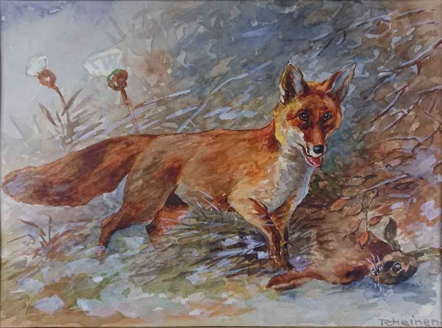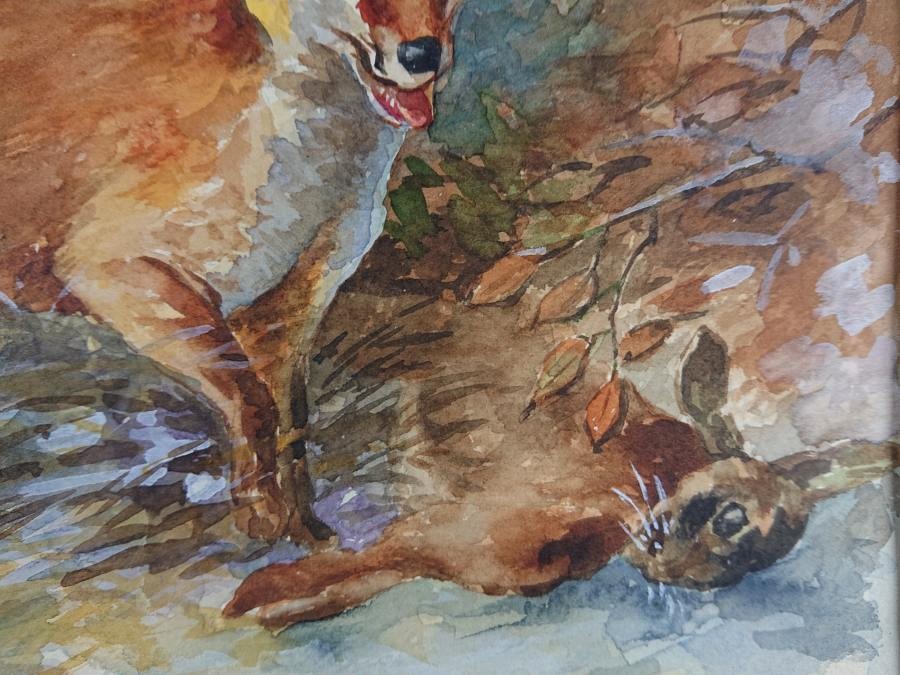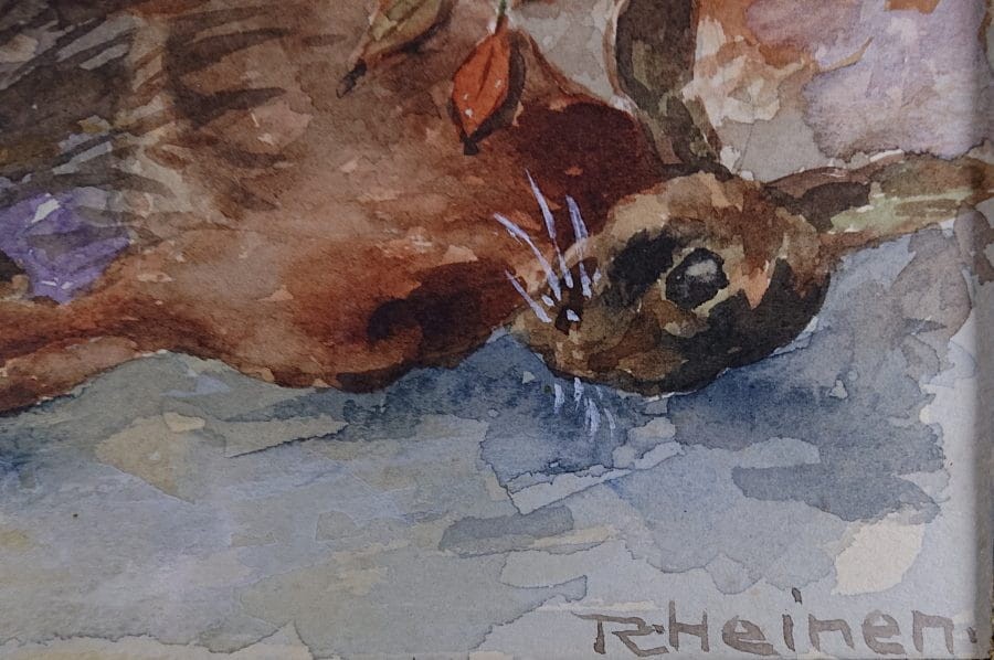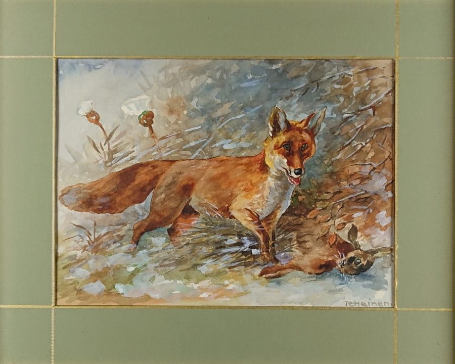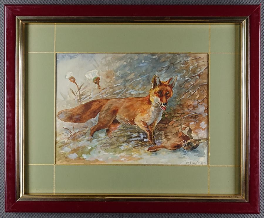 Oferujemy stary przedwojenny obraz, o tematyce animalistycznej. Uwieczniona została scena myśliwska przedstawiająca lisa ze swoją zdobyczą. Sygnowana odręcznie przez artystę w prawym narożniku: R. Heinen. Wspaniała gra pastelowych kolorów. Obraz malowany w technice akwareli na specjalnym grubym papierze przeznaczonym do tego typu malarstwa. Akwarela oprawiona jest w paspartu, zabezpieczona szybą, i ramę w kolorze czerwieni i złota. Całość nie wymaga ingerencji, do powieszenia na ścianie. Dzieło polecamy koneserom cennego i dekoracyjnego malarstwa.