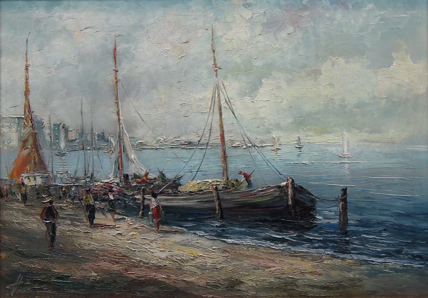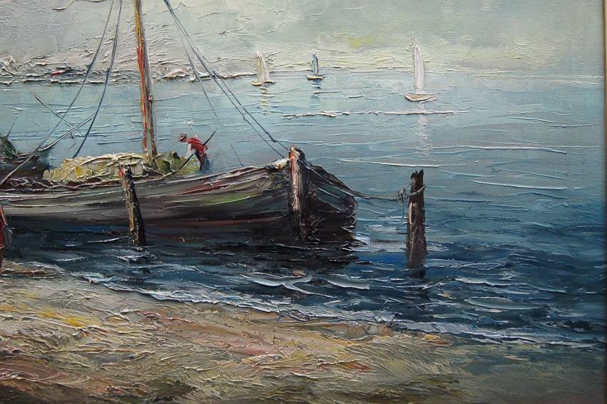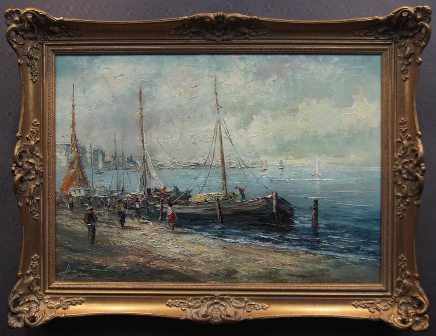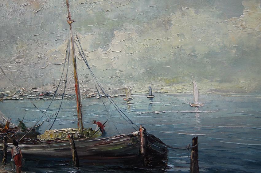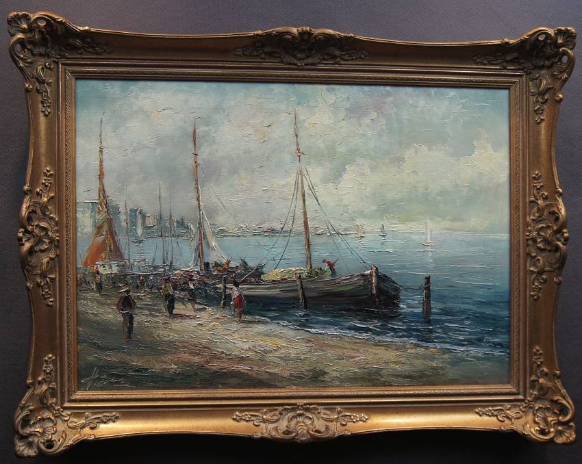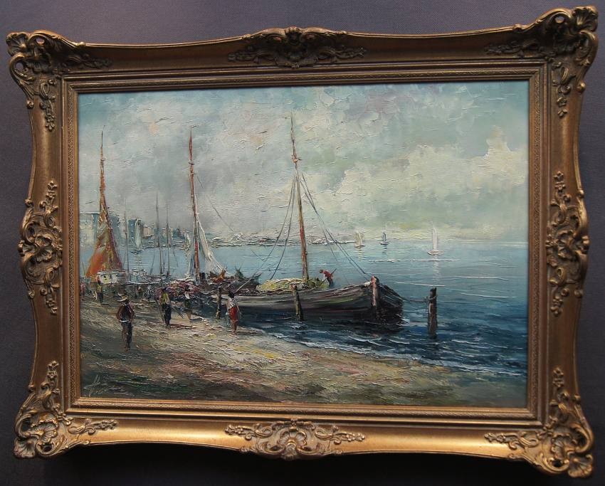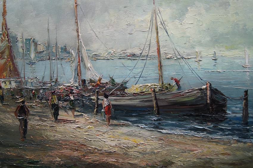 Na obrazie przedstawione jest nadbrzeże. Przy brzegu widać przycumowane łodzie oraz spacerujące postacie. Oprawą obrazu jest gustowna rama z okresu powstania płótna. Dzieło polecamy koneserom dekoracyjnego i cennego malarstwa.