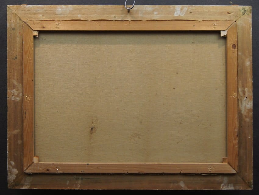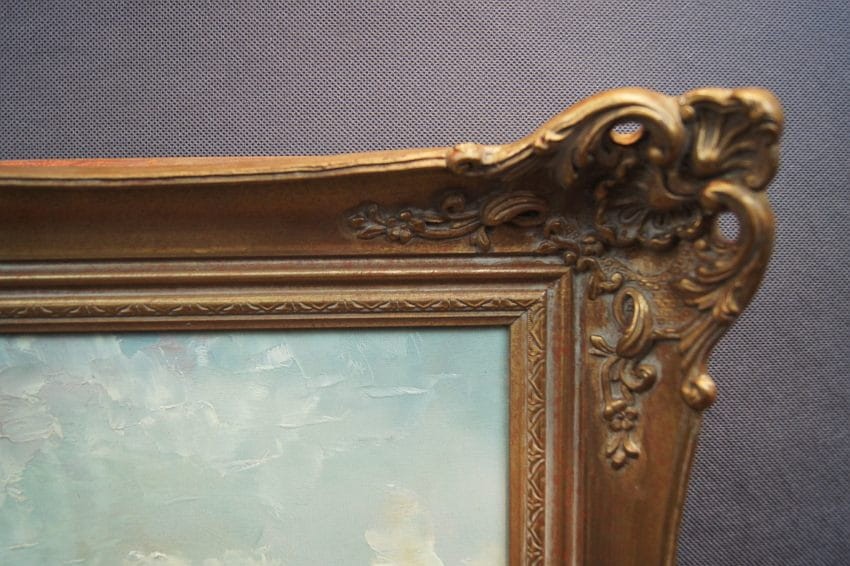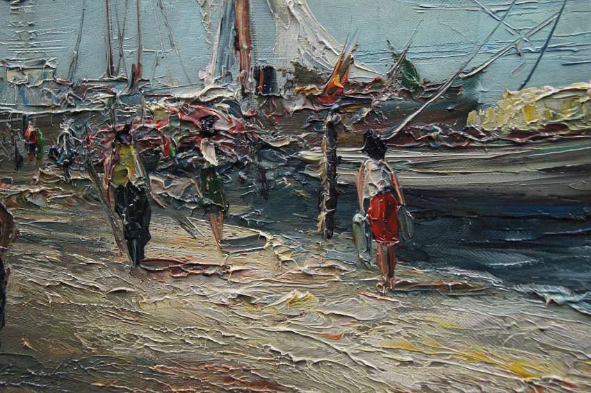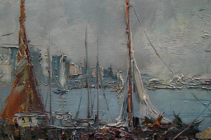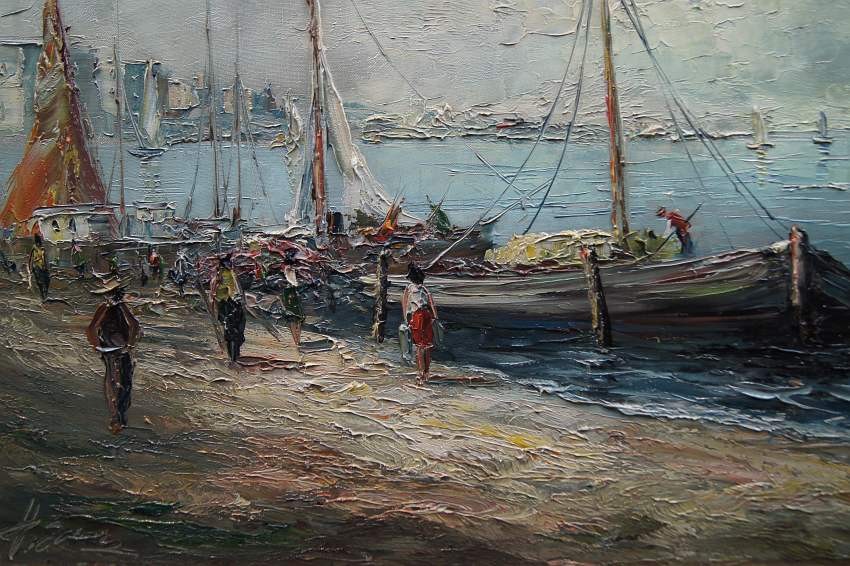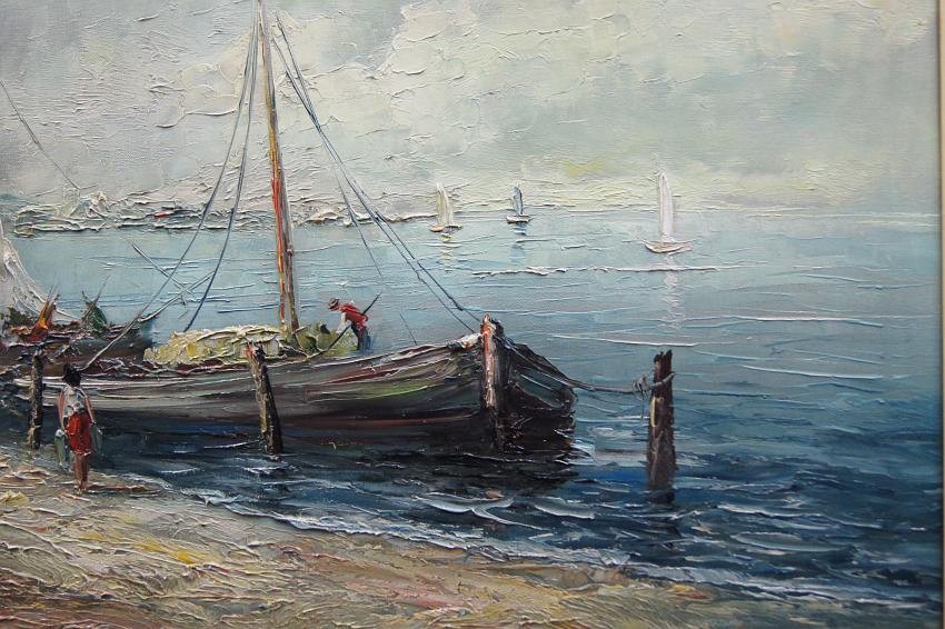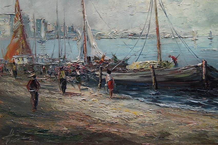 Na obrazie przedstawione jest nadbrzeże. Przy brzegu widać przycumowane łodzie oraz spacerujące postacie. Oprawą obrazu jest gustowna rama z okresu powstania płótna. Dzieło polecamy koneserom dekoracyjnego i cennego malarstwa.