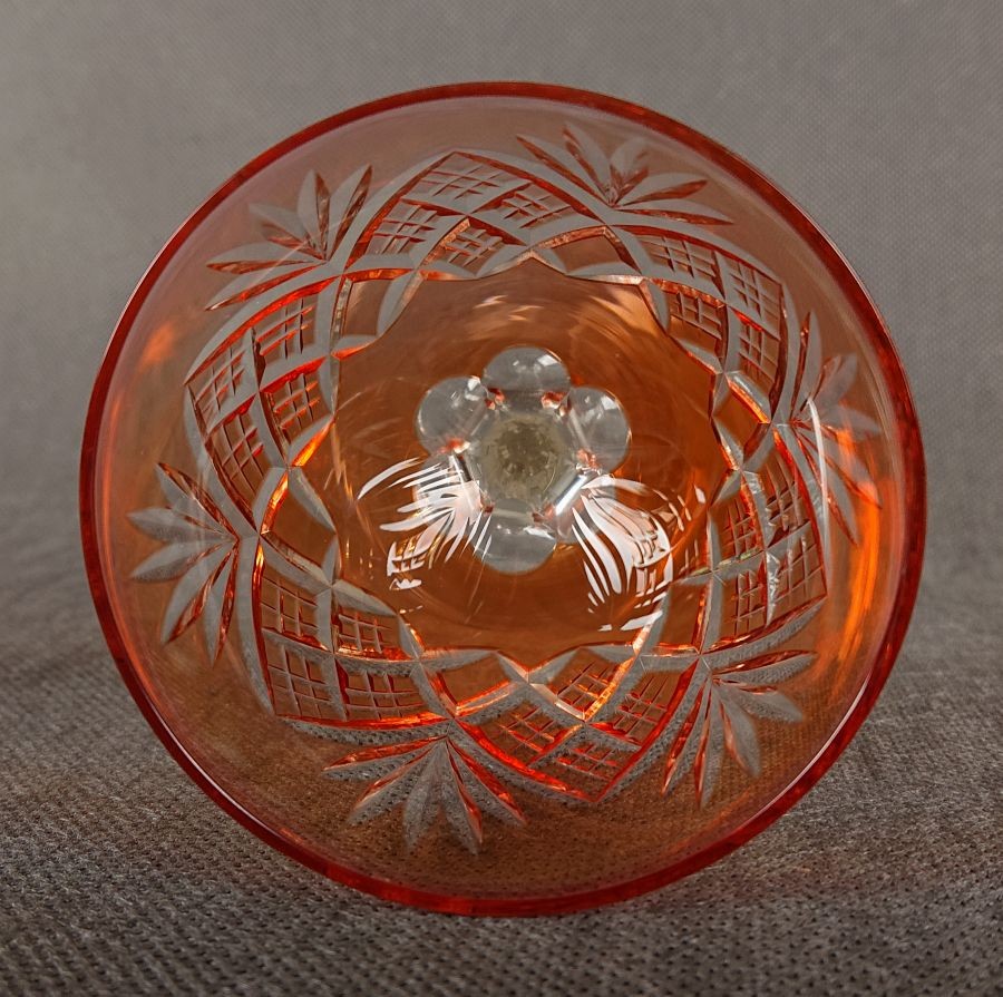 Jego czara ma klasyczny, pękaty kształt i mieni się ciepłym, transparentnym odcieniem łososiowym. Powierzchnia czaszy jest bogato zdobiona precyzyjnymi, głębokimi szlifami. Dominują tu okazałe, pionowe fasety, które efektownie rozpraszają światło. Pomiędzy nimi znajdują się delikatniejsze, pionowe linie lub drobne fasetki, potęgujące blask i dodające tekstury. U podstawy czary biegnie ozdobny, poziomy pas z misternymi, geometrycznymi szlifami, który spaja całą kompozycję.