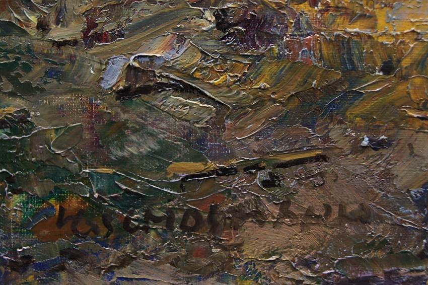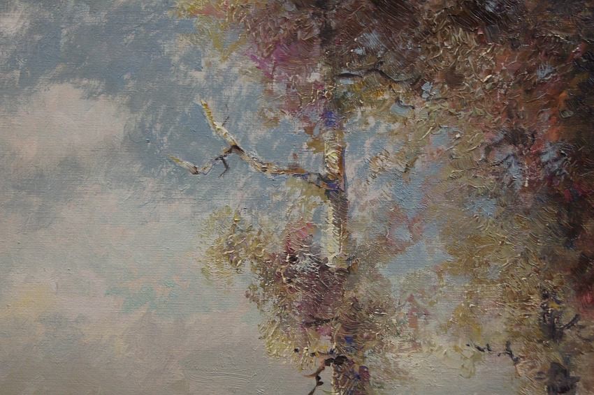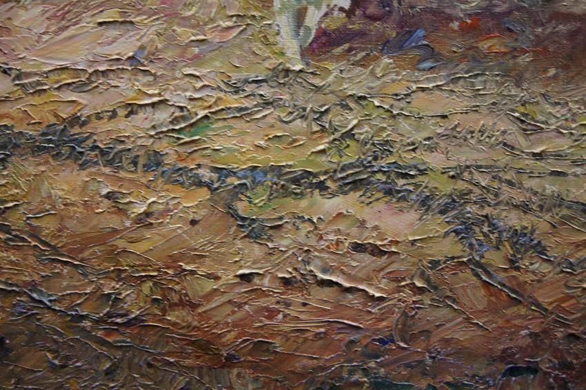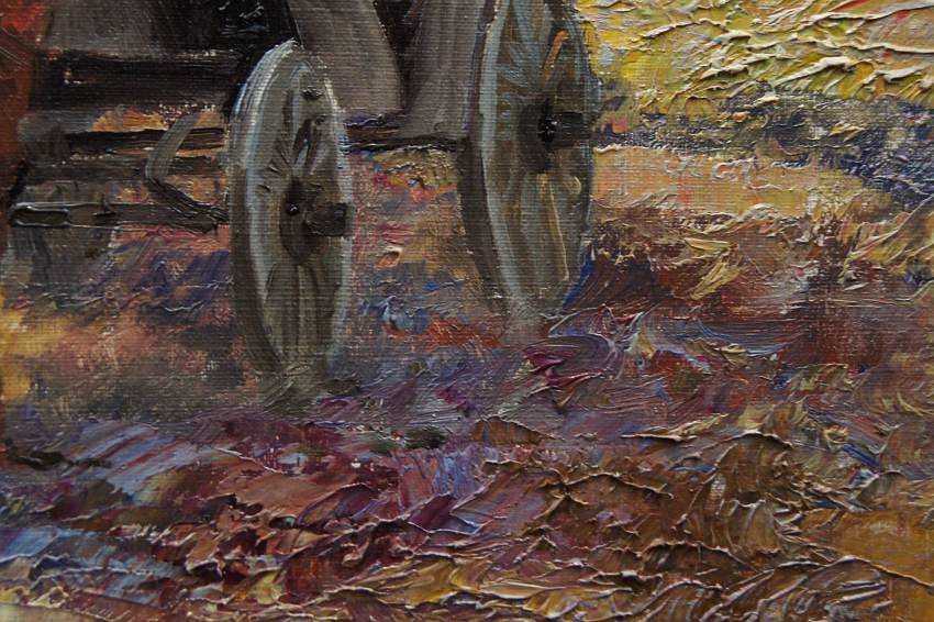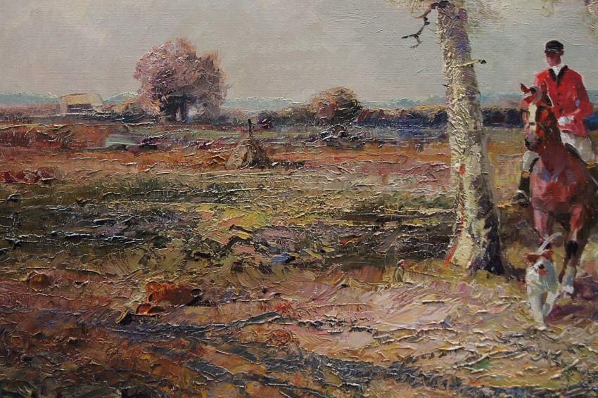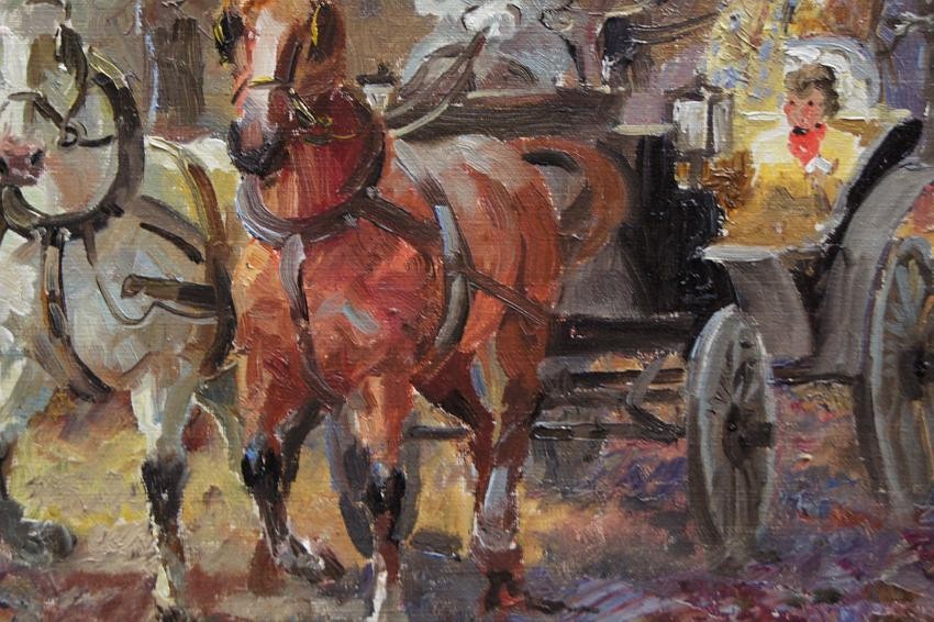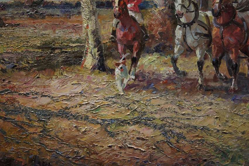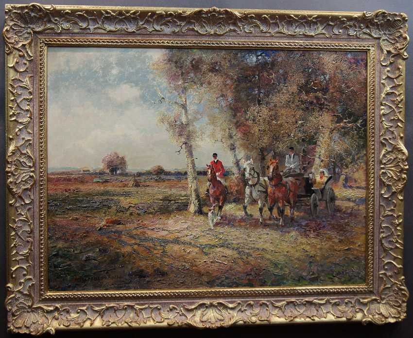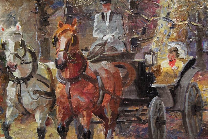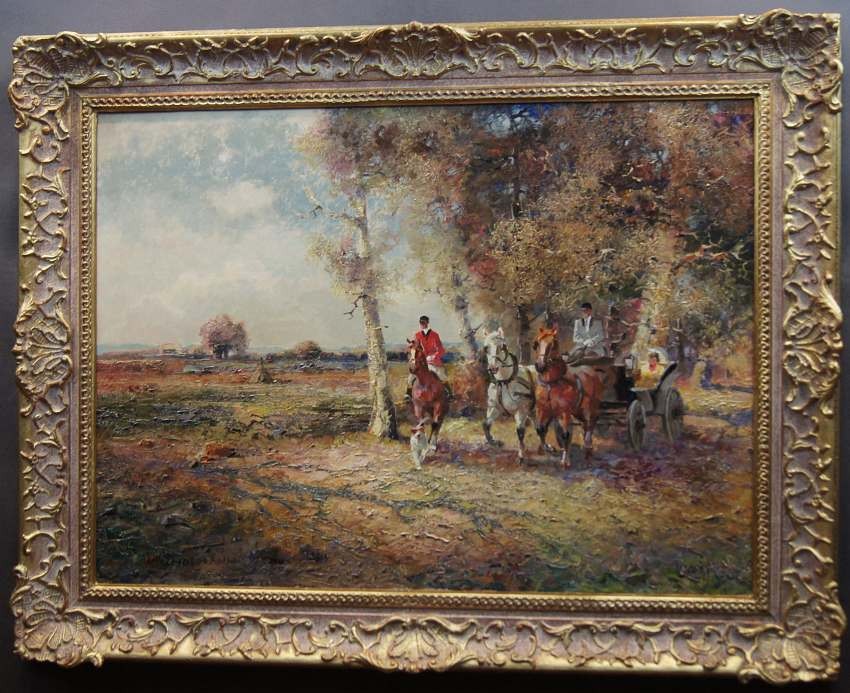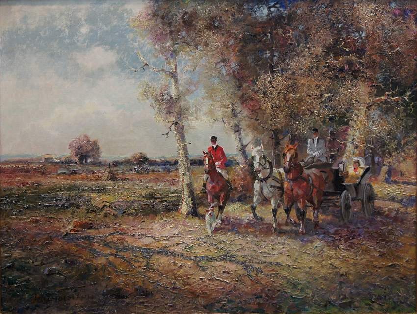 Doskonały, oryginalny obraz wybitnego artysty niemieckiego pochodzenia Ludwiga Gschossmanna. Malarz znany ze scen balowych, krajobrazów i obrazów rodzajowych, malowanych w sposób impresjonistyczny swobodnymi pociągnięciami pędzla i akcentami żywych kolorów. Malowany z ogromną perfekcją, stary obraz olejny na płótnie. Dzieło przedstawia uroczą scenę rodzajową. Na pracy uwieczniona jest przejażdżka dorożką z jeźdźcem u boku a przed nimi na przedzie biegnący pies myśliwski. Wszystko w otoczeniu uroczej przyrody.
