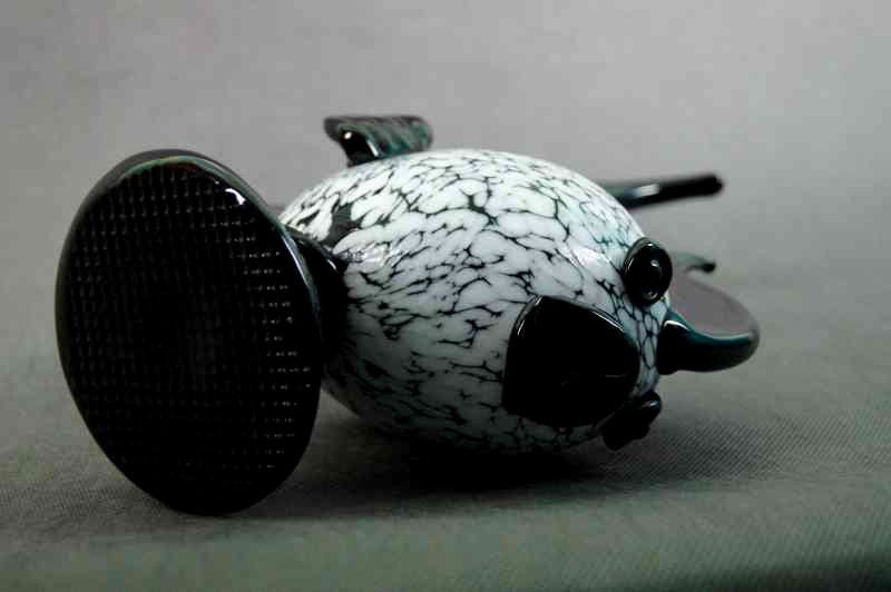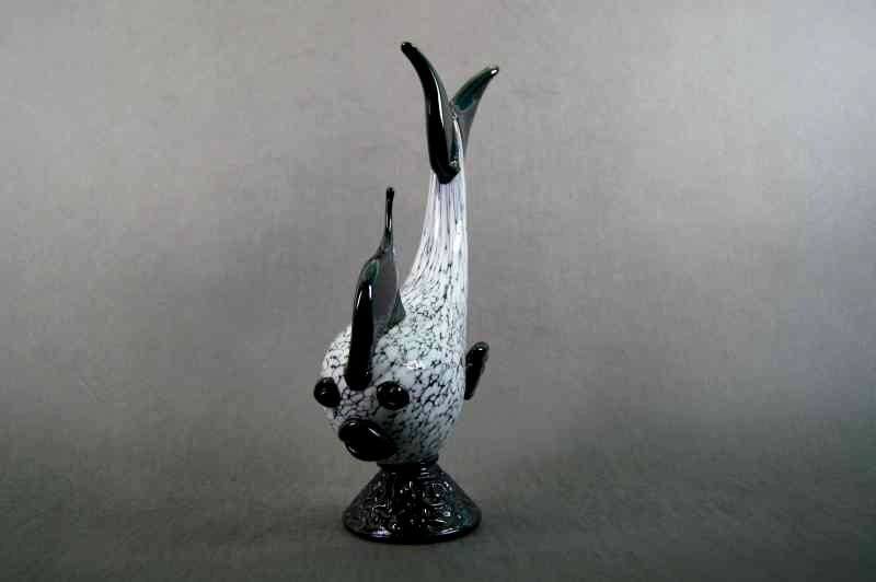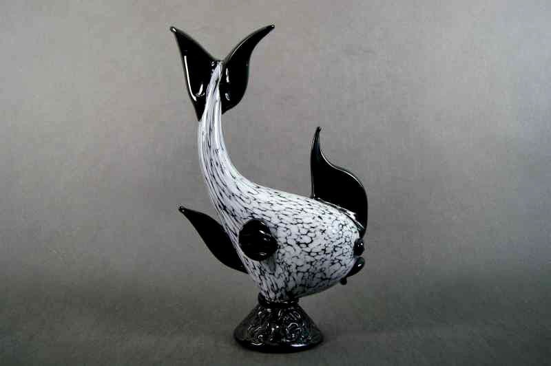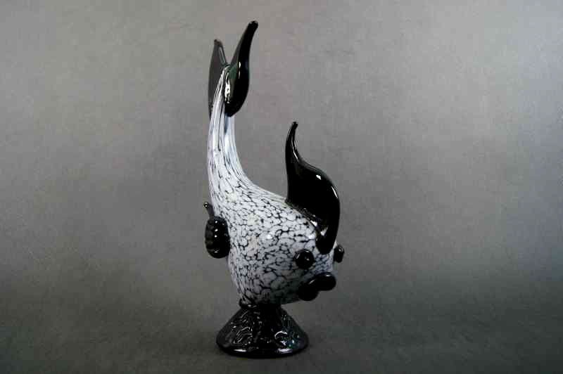 Duża oryginalna figura ryby,niezwykle dekoracyjna, kolekcjonerski przedmiot, model rzadko spotykany na rynku wtórnym Przedmiot pochodzi z włoskiej wyspy Murano i huty szkła tworzącej tam. Ryba wykonana ze szkła bezbarwnego czarnego i białego, ręcznie formowana. Stan zachowania bardzo dobry. Wymiary: wysokość 34,5 cm, długość 21 cm.