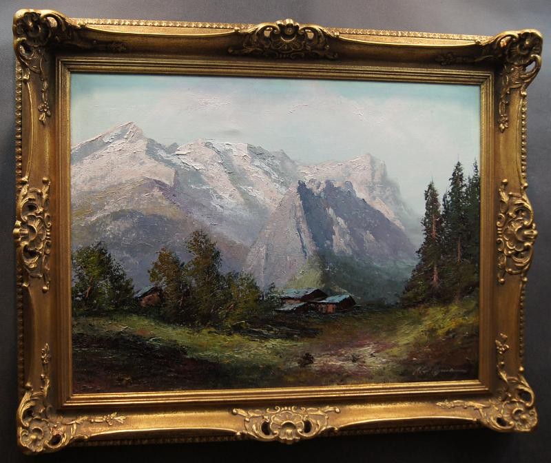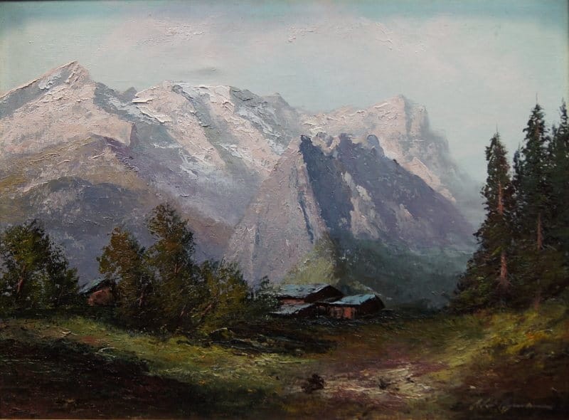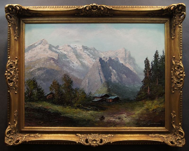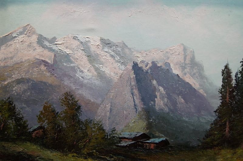 Autentyczna praca, która doskonale ukazuje grę światłem na tle krajobrazu. Duży, niezwykle dekoracyjny obraz przedstawiający krajobraz górski. Na pracy uwiecznione są Góry Wetterstein , położone w Północnych Alpach.