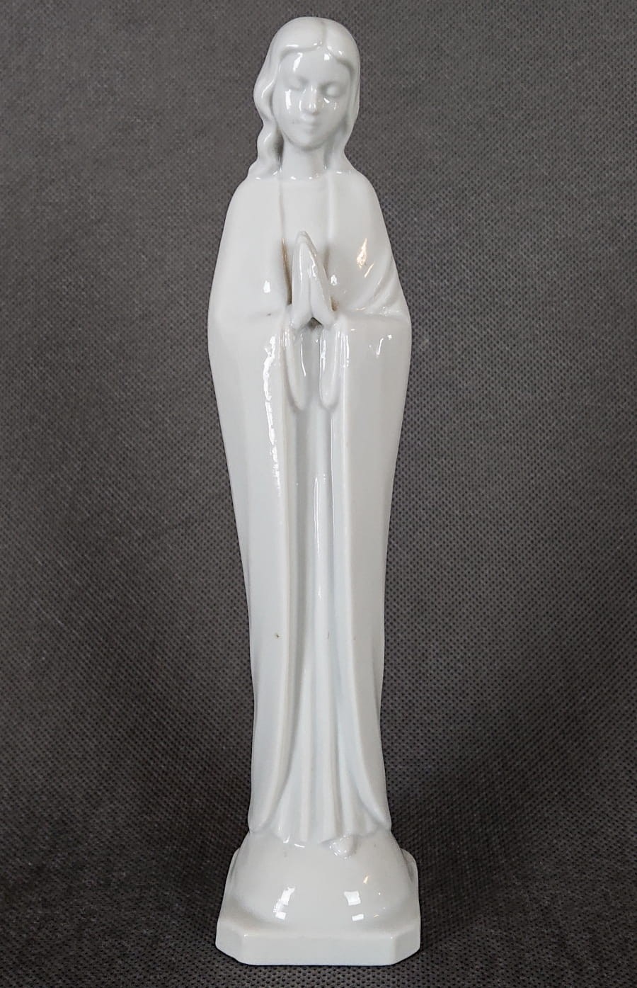 Porcelanowa figurka przedstawia postać Maryi – ubraną w długą, sięgającą do podstawy szatę z szerokimi rękawami. Sylwetka jest smukła i wyprostowana, a ręce splecione w geście modlitwy tuż pod brodą. Twarz ma łagodne, zamknięte oczy i delikatny uśmiech, co nadaje figurce wyraz spokoju i kontemplacji.