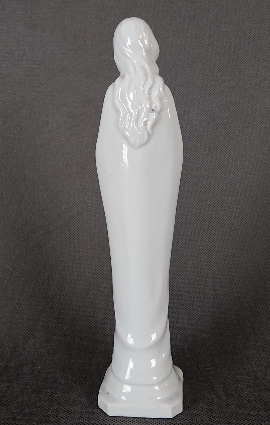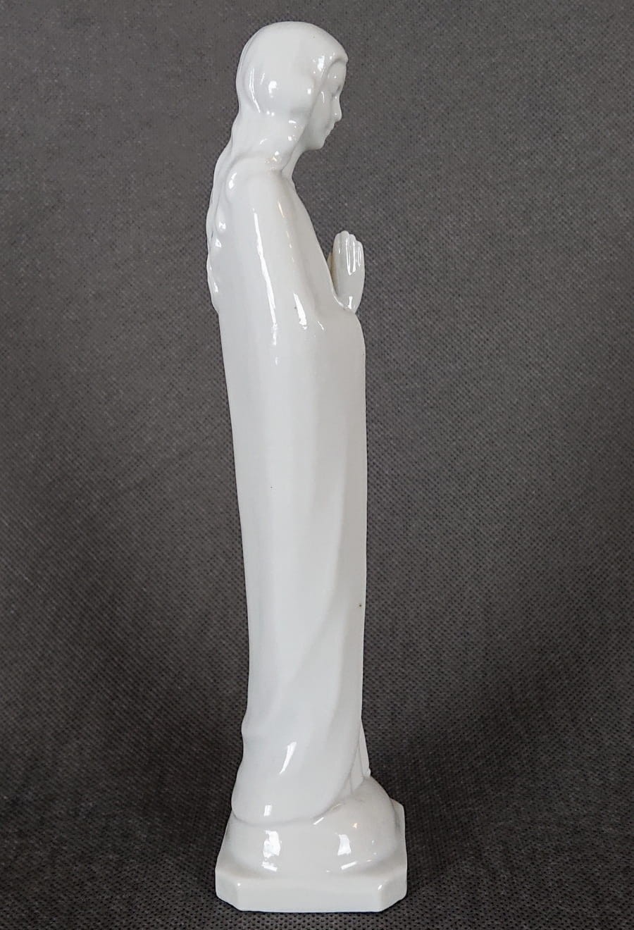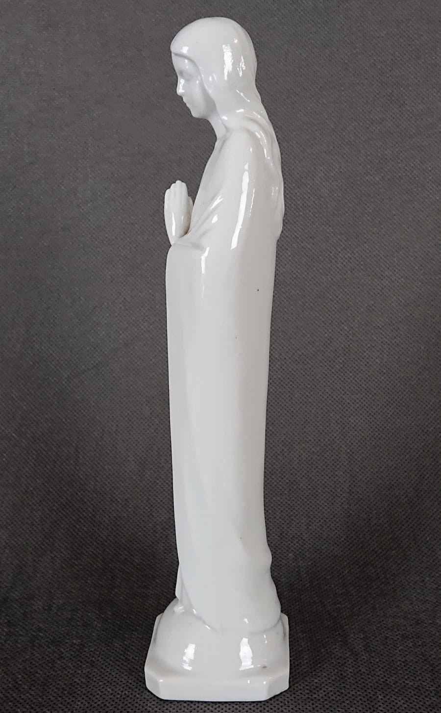 Szkliwiona powierzchnia porcelany jest gładka i odbija światło, podkreślając subtelne fałdy szaty. Brak kolorowych akcentów sprawia, że figurka ma niemal ascetyczny charakter. Podstawa jest ośmioboczna, lekko poszerzona, co stabilizuje całą kompozycję i nadaje jej harmonijną proporcję. Pomimo prostoty formy, figurka emanuje spokojnym, niemal sakralnym pięknem, idealnie wpisując się w tradycję minimalistycznych wizerunków religijnych z porcelany. Zaprojektowana i wymodelowana z dbałością o szczegóły. Kolekcjonerska porcelana o niezwykle wyszukanym i eleganckim kształcie.