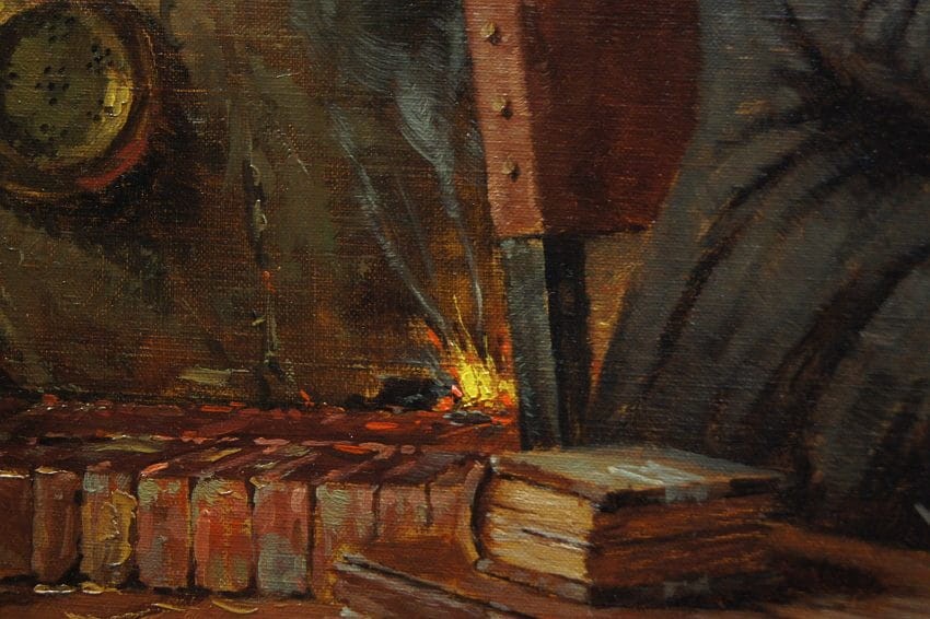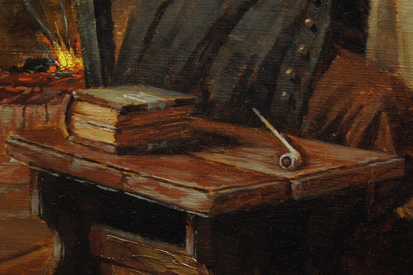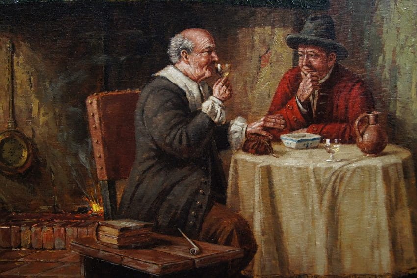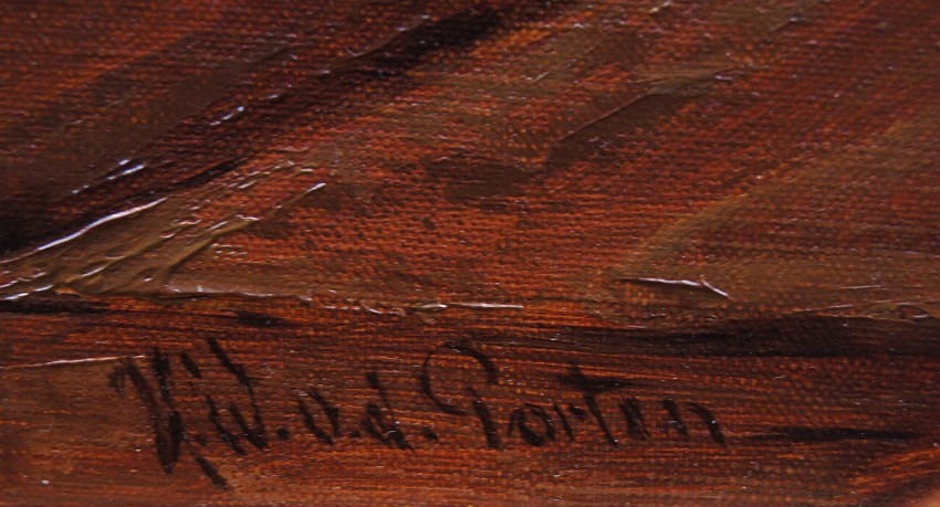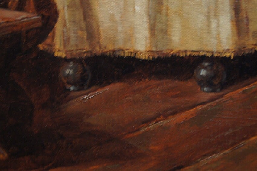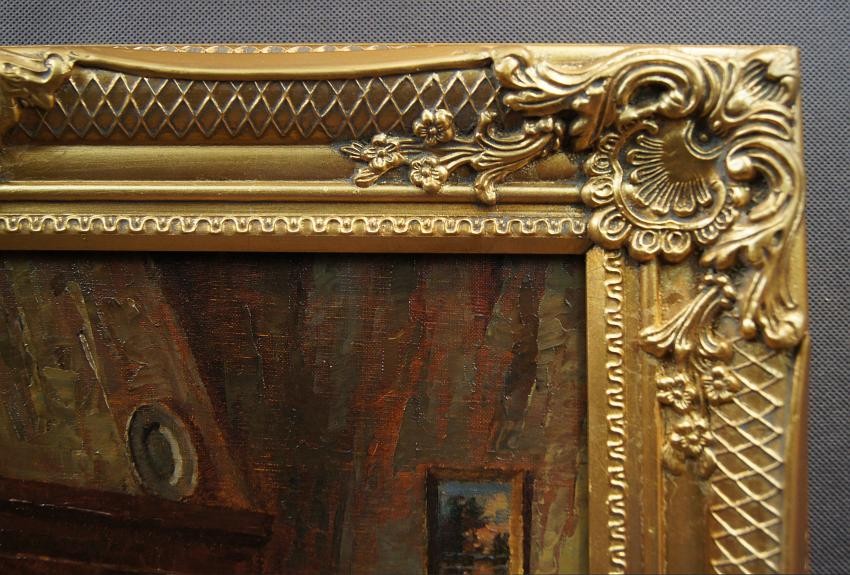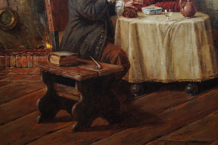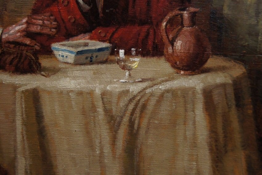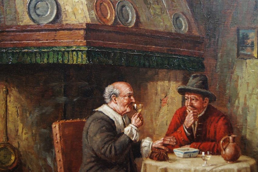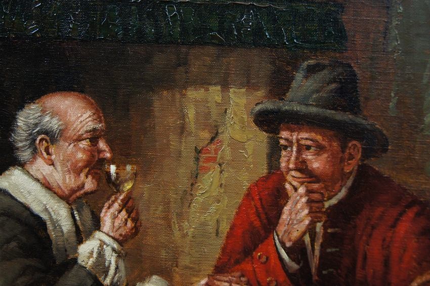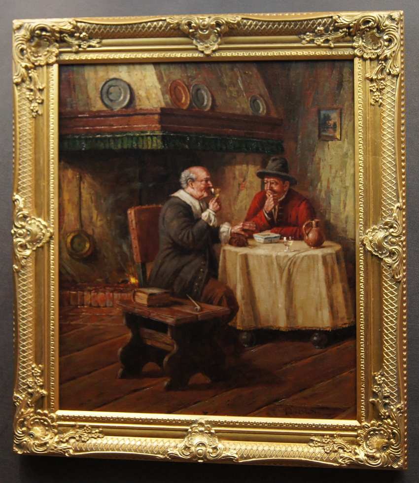 Autentyczna perfekcyjnie wykonana praca jedna z lepszych tego artysty. Obraz olejny namalowany na płótnie rozciągniętym na drewnianym krośnie. Jest to oryginalne dzieło przedstawiające klimatyczne wnętrze z początku XIX wieku z kominkiem i antycznymi meblami. Przy stole artysta uwiecznił dwie męskie postacie delektujące się wybornym trunkiem podczas dyskusji. Praca tętniąca życiem, emanująca ciepłymi kolorami w jakich została wykonana. Obraz został namalowany w drugiej połowie XX wieku. Struktura nałożonej farby jest mocno uwypuklona i wyczuwalna pod palcami. Sygnowany odręcznie przez twórcę w prawym dolnym narożniku: H. W. v. d. Porten. Zdecydowane pociągnięcia pędzla artysty, świadczą o wysokim wprawnym kunszcie malarskim.