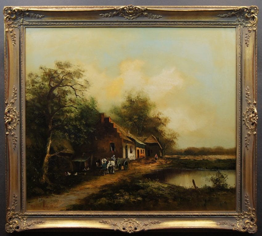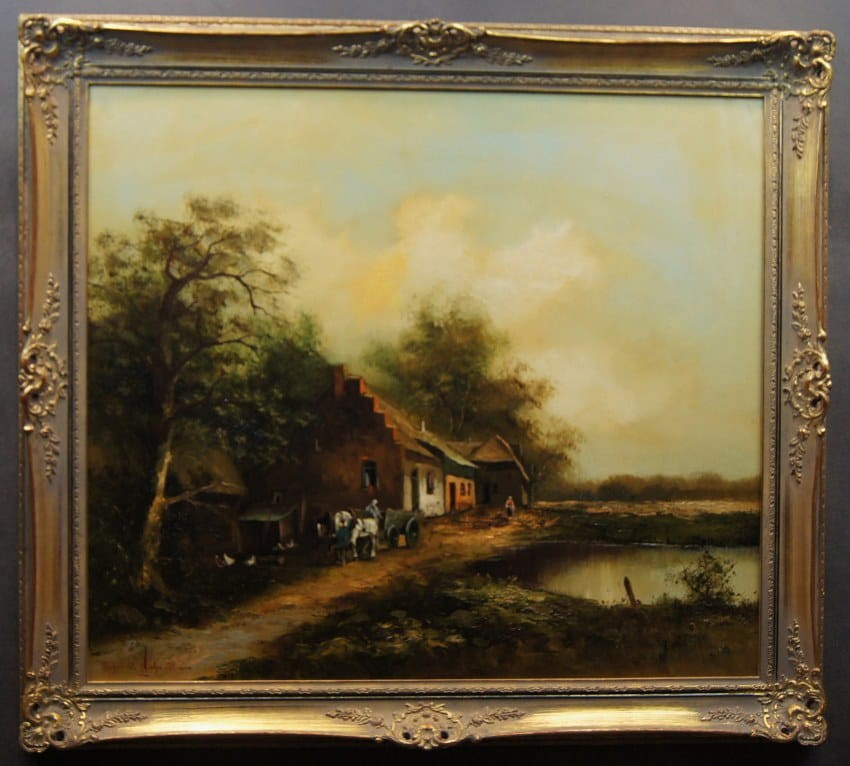 Obraz oprawiony w oryginalną przestrzenną ramę w kolorze patynowanego złota. Obrazy artysty cieszą się dużym powodzeniem i są pożądane na aukcjach sztuki ze względu na perfekcyjne pociągnięcia pędzla i styl malarski oddający klimat 19 wiecznych obrazów. Dzieło polecamy osobom poszukującym dobrego malarstwa. Całość do powieszenia na ścianie w salonie lub innym pomieszczeniu.