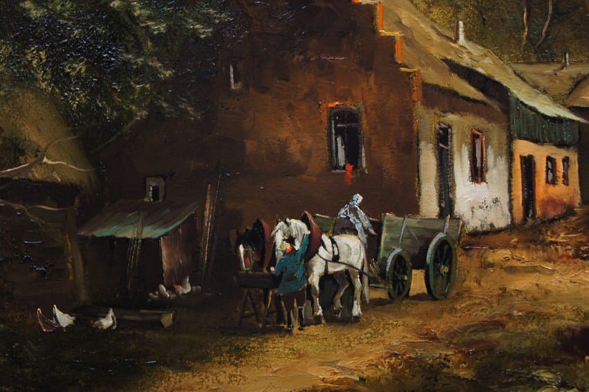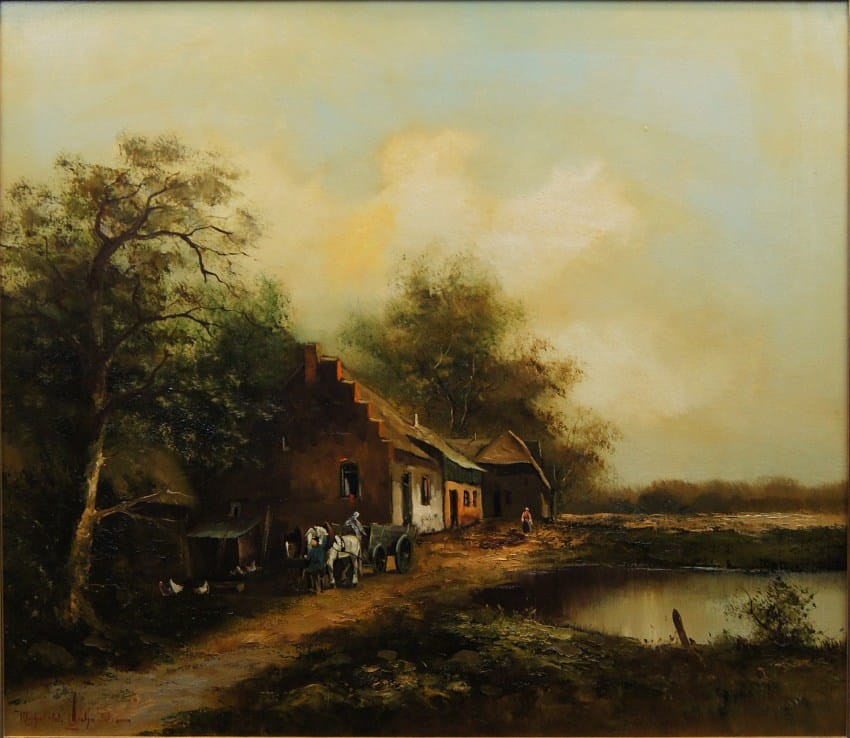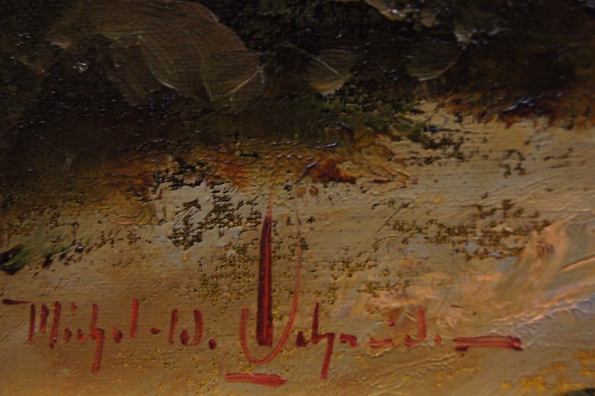 Oto przykład kolejnego dzieła tego artysty, oferowanego przez naszą galerię. Praca tętniąca życiem, emanująca ciepłymi kolorami w jakich została wykonana. Obraz został namalowany w drugiej połowie XX wieku. Struktura nałożonej farby jest mocno uwypuklona i wyczuwalna pod palcami. Bardzo dobra, perfekcyjnie wykonana praca jedna z lepszych tego artysty. Obraz olejny namalowany na płótnie rozciągniętym na drewnianym krośnie. Sygnowany odręcznie przez twórcę w lewym dolnym narożniku: Michael W. Schneider.