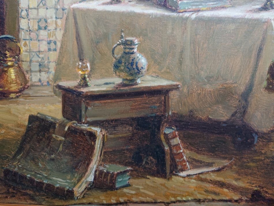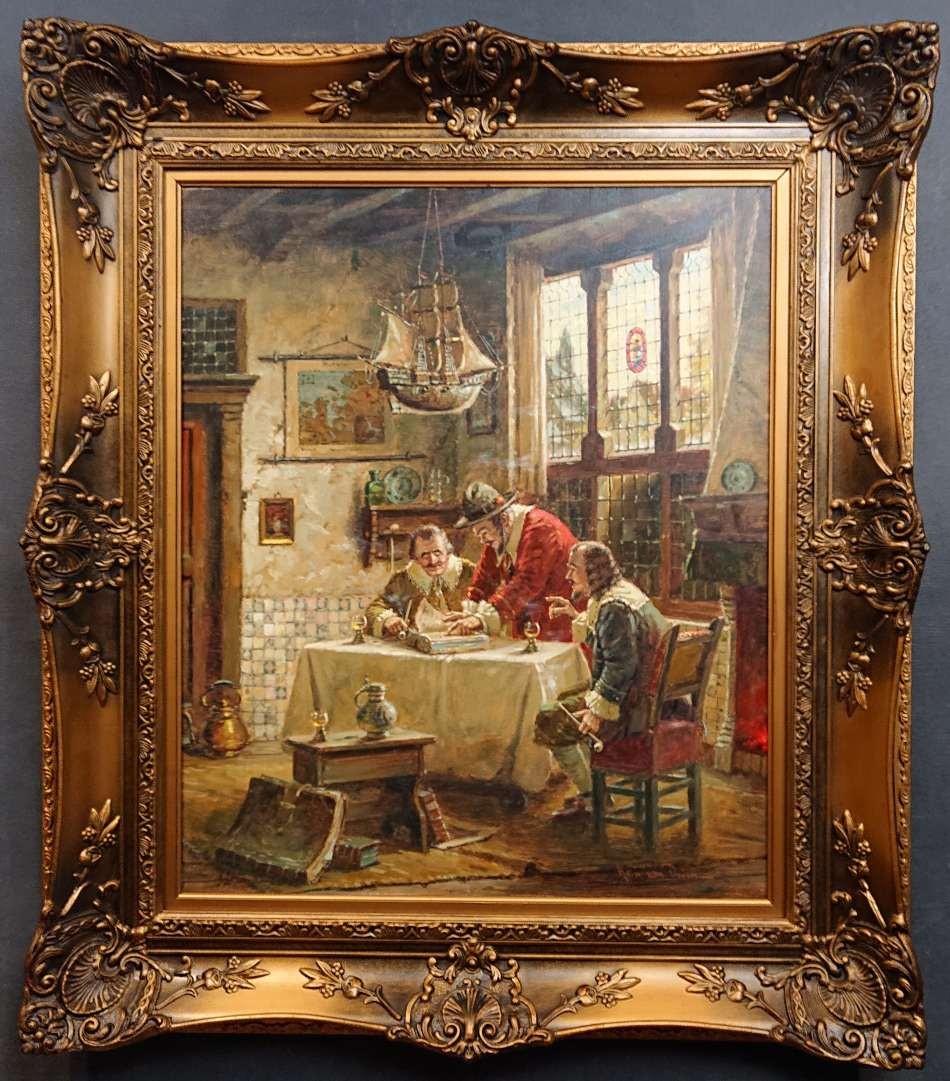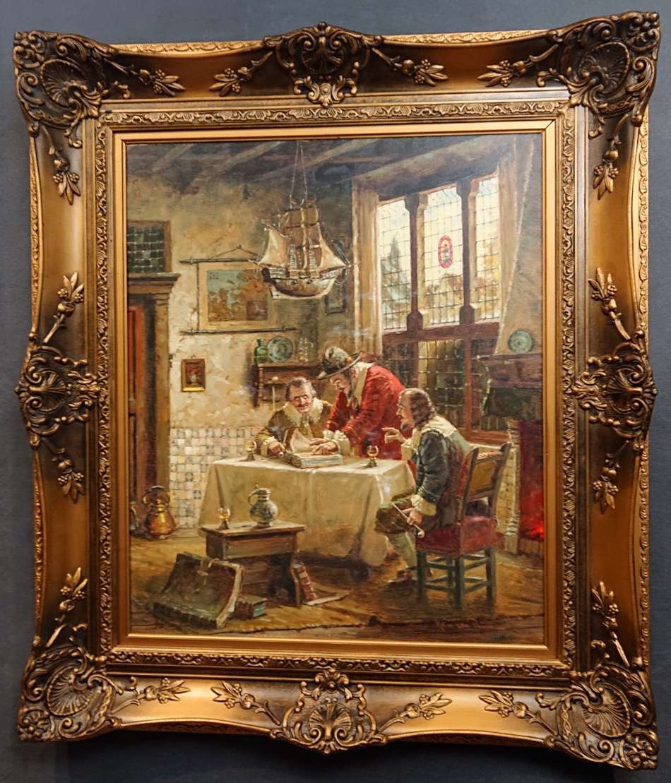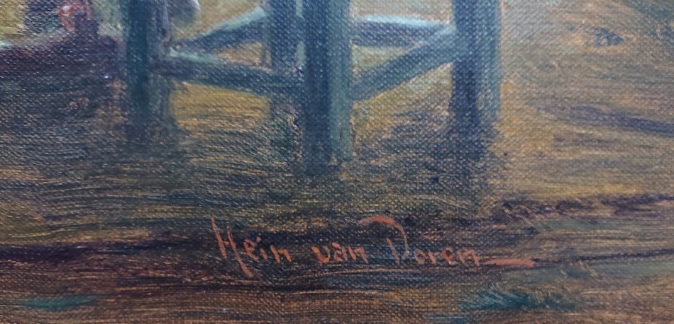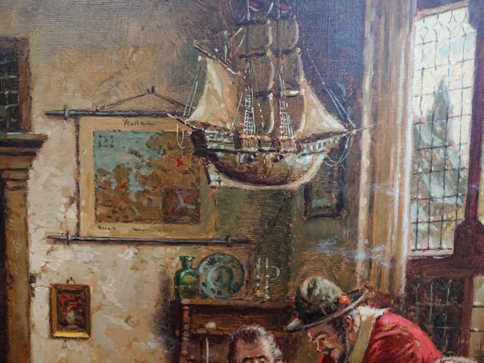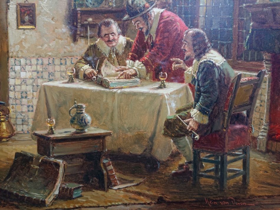 O ARTYŚCIE: Hein Van Doren - znany artysta malarz urodzony w Düsseldorfie w 1930 roku – o korzeniach holenderskich. Przez jakiś czas studiował pod kierunkiem düsseldorfskiego artysty malarza Alberta Henricha i pod jego wpływem malował początkowo głównie martwe natury i kwiaty. Późniejsze, samodzielne studia w muzeach spowodowały duże zainteresowanie się holenderskim malarstwem rodzajowym XVII i XVIII w., które stało się dlań trwałą inspiracją w dalszej twórczości. Malował historyzujące, kostiumowe sceny rodzajowe rozgrywające się w „holenderskich” wnętrzach, a jego narracyjne obrazy, oparte na czytelnej i często humorystycznie podawanej anegdocie, zyskiwały popularność. W początkowej fazie swojej twórczości prace sygnował pod pseudonimem W. Andreas. Spośród powtarzających się tytułów prac artysty wymienić można, m.in. W kantorze, Próba wina, Dyskusja przy stole, Nowe szlaki żeglugi.