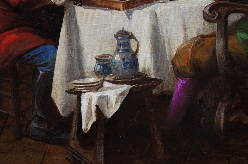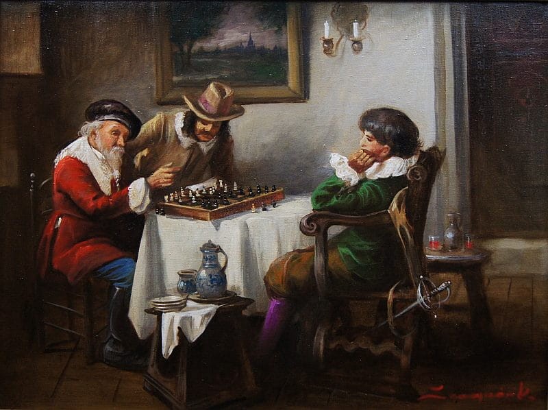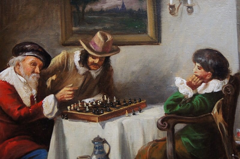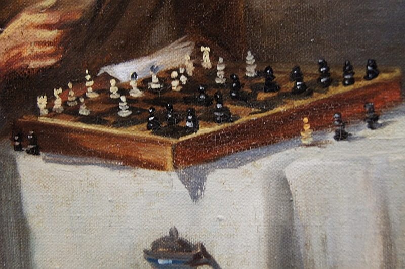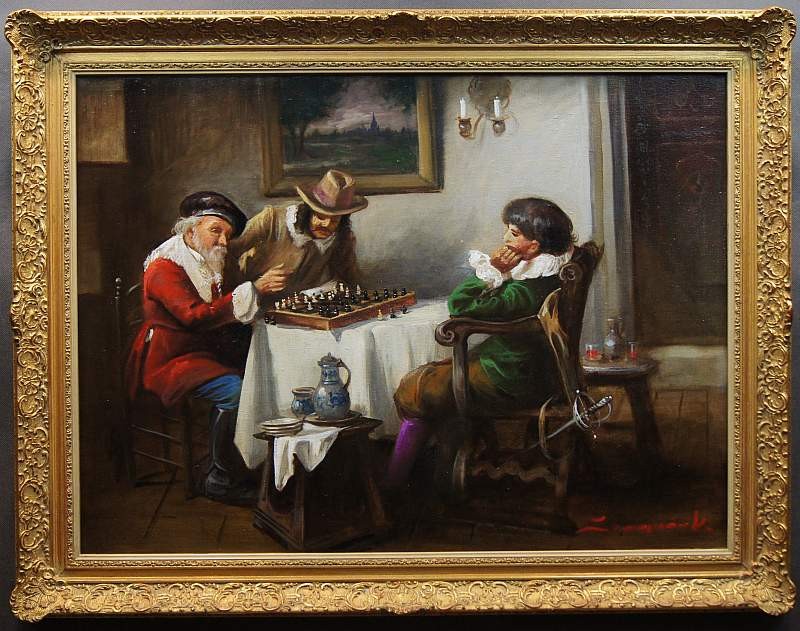 Oryginalny stary obraz olejny namalowany na płótnie. Jest to praca olejna pochodząca z lat 40 dwudziestego wieku. Na obrazie odzwierciedlona jest scena rodzajowa we wnętrzu, przedstawiająca szachową potyczkę.