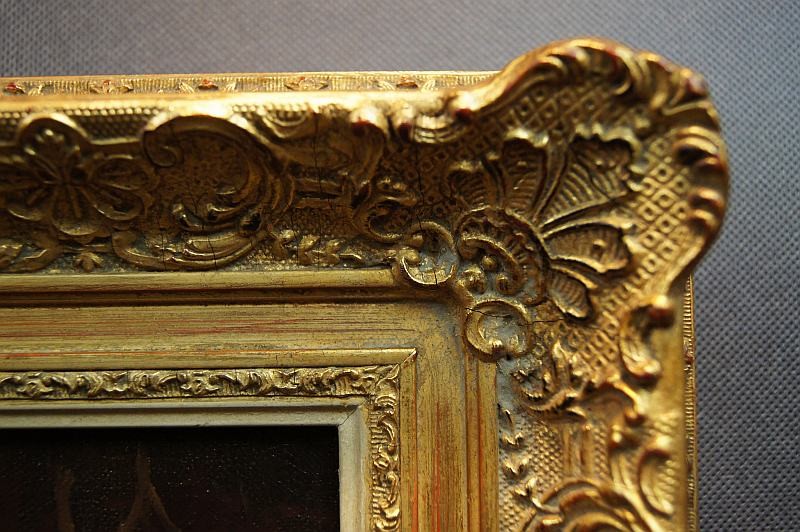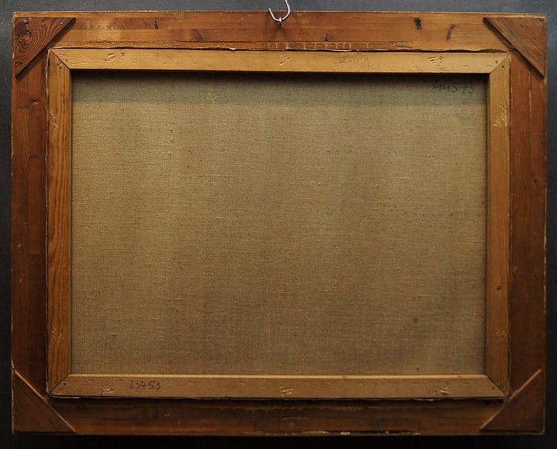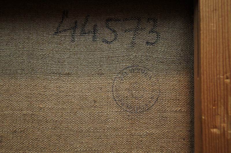 Obraz malowany w technice pędzla, a struktura nałożonej farby jest uwidoczniona i wyczuwalna pod palcem. Sygnowany odręcznie przez artystę w prawym dolnym narożniku: polsko brzmiąca sygnatura lecz nie odczytana. Na rewersie obrazu widnieje pieczęć pokazana na przedostatnim zdjęciu. Całość oprawiona w przestrzenną bogatą ramę z okresu powstania obrazu w kolorze złotym.