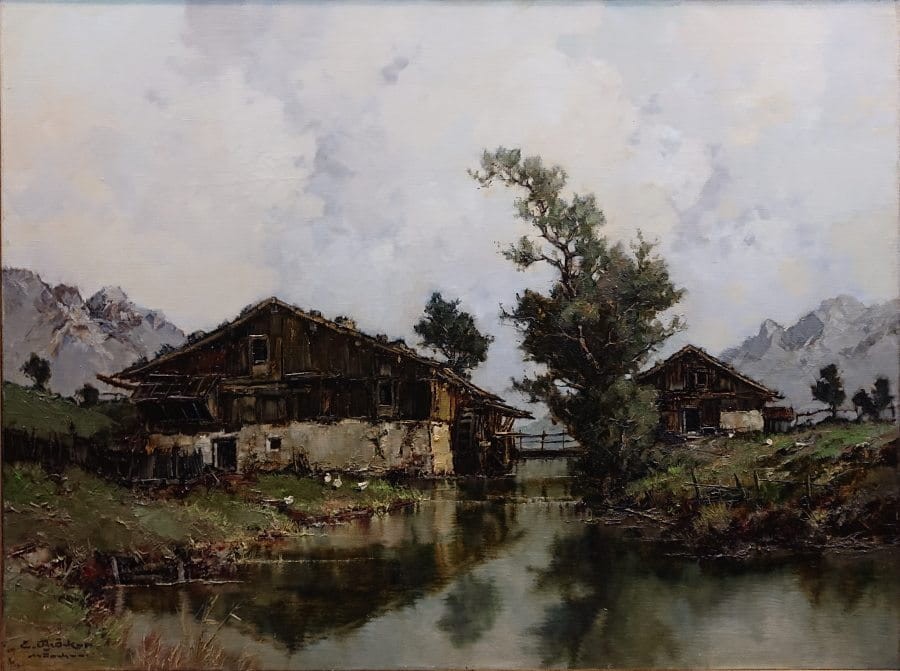 Malarstwo pejzażowe szkoły monachijskiej słynie z realistycznego podejścia do natury, dbałości o detale oraz umiejętnego operowania światłem i nastrojem. W obrazie Ernst Brocker odnajdujemy wszystkie te cechy – artysta przedstawia urokliwy młyn wodny wpisany w spokojny, podgórski krajobraz, tworząc kompozycję pełną harmonii i naturalnego piękna.