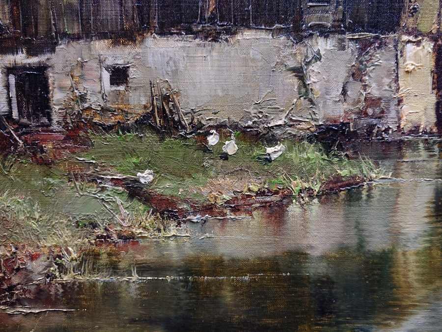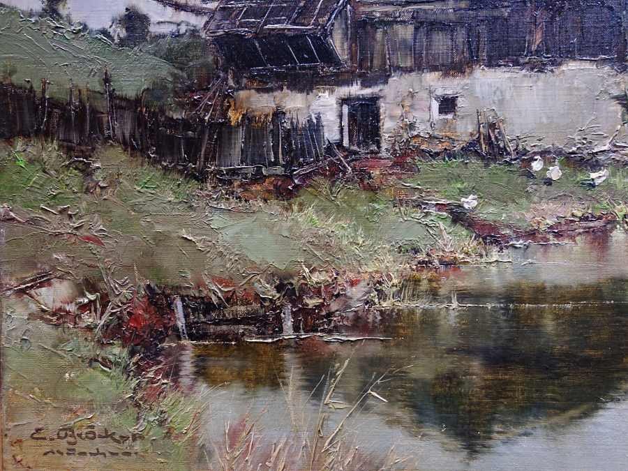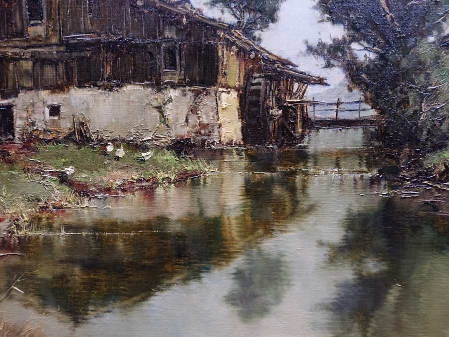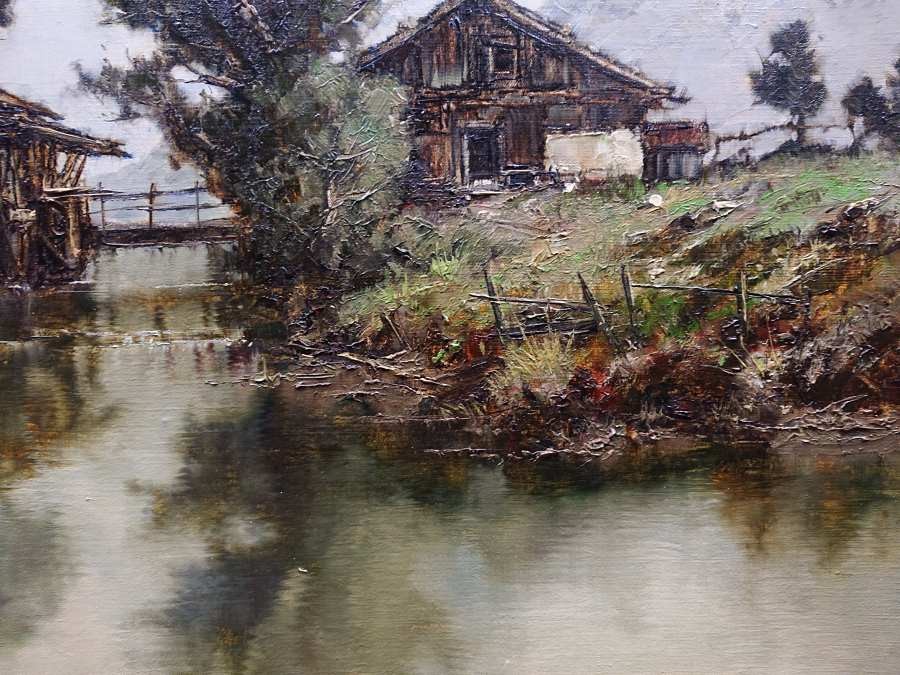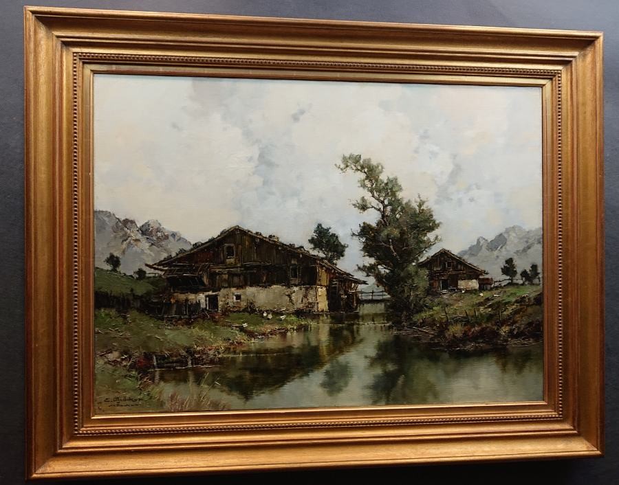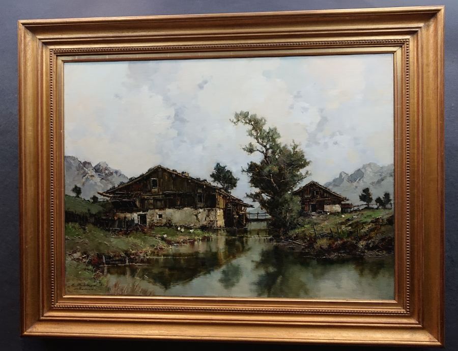 Autentyczny obraz olejny na płótnie, autorstwa niemieckiego artysty Ernsta Bröckera przedstawia malowniczą scenę wiejską, umieszczoną w górzystym krajobrazie. Na pierwszym planie widzimy spokojny strumień górski, w którego lustrzanej tafli odbijają się dwa stare, wiejskie budynki. Jednym z budynków jest młyn wodny. Chaty mają charakterystyczne, masywne ściany oraz ciemne, drewniane elementy konstrukcyjne, nadające im rustykalny urok i surowość.
