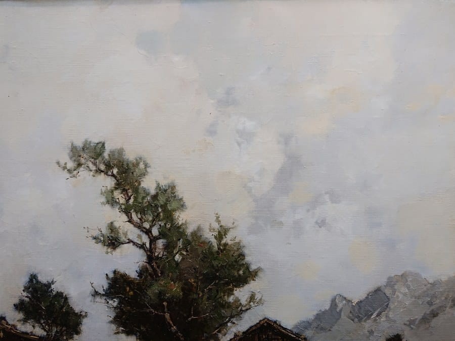 Na środku obrazu wyrasta duże drzewo, które wraz z górami w tle dodaje kompozycji głębi. W oddali widać zarysy majestatycznych, skalistych szczytów, co tworzy kontrast między spokojem doliny a surowością górskiego krajobrazu. Kolorystyka jest stonowana i chłodna, co podkreśla atmosferę tajemniczości i spokoju.