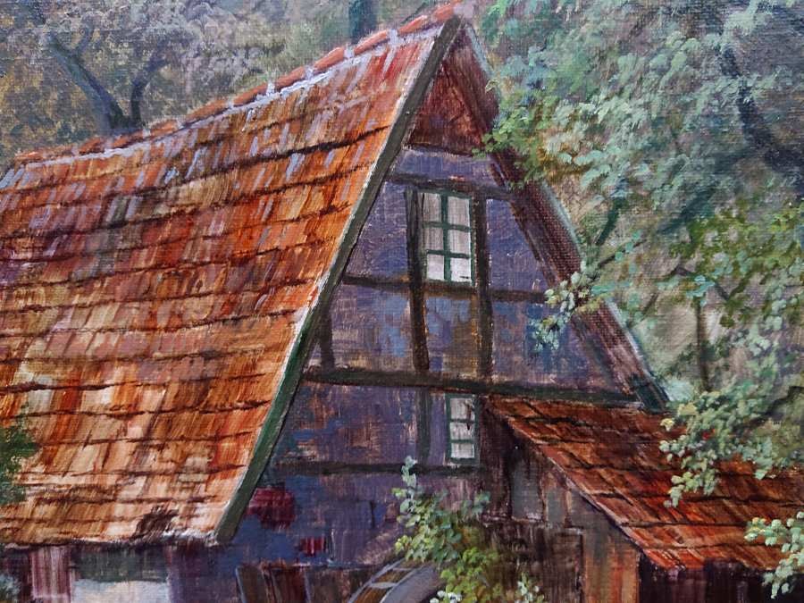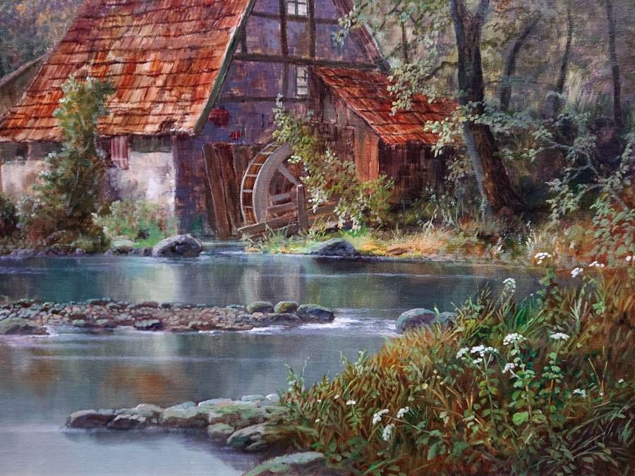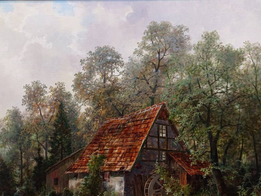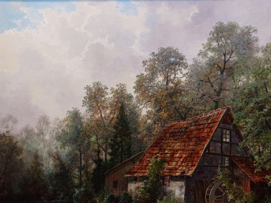 Romantyzm w malarstwie pejzażowym często ukazywał naturę jako przestrzeń tajemnicy, refleksji i emocji. W obrazie Hermann Dieste odnajdujemy właśnie tę atmosferę – ukryty wśród drzew młyn wodny staje się centralnym punktem kompozycji, przyciągając uwagę i budując nastrój niedopowiedzenia.