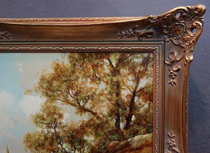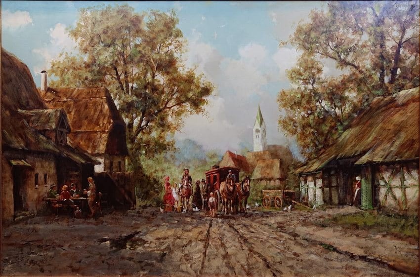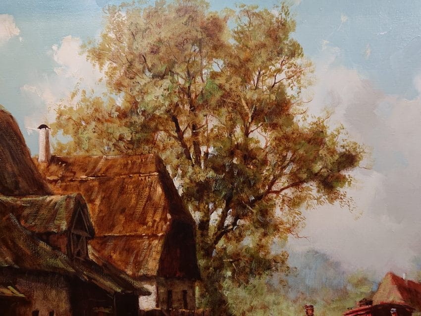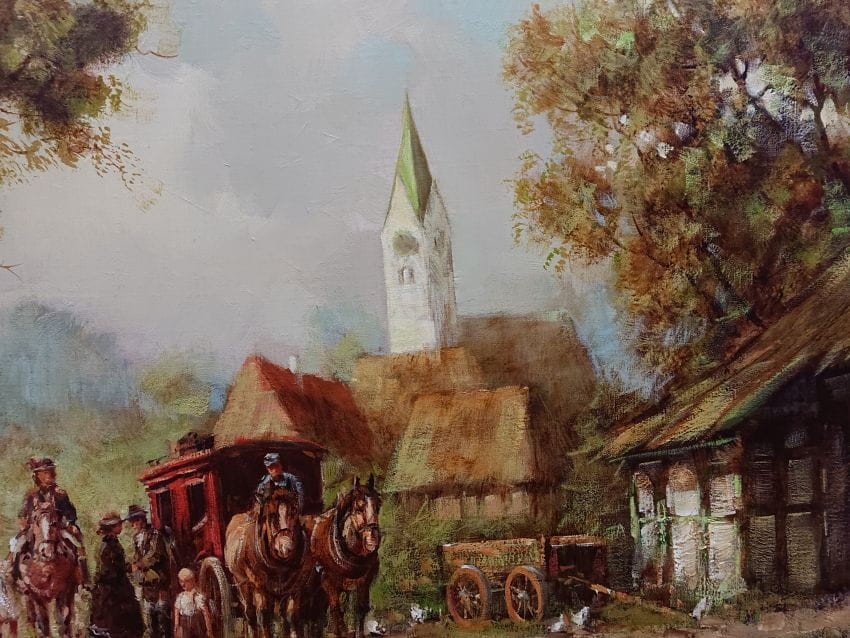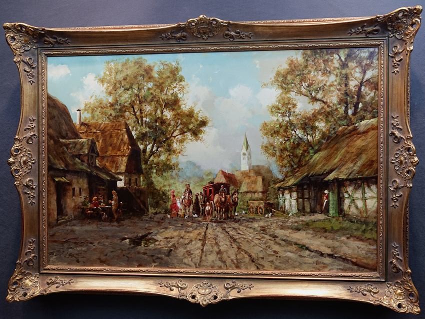 To już kolejna doskonała, autentyczna praca stworzona z niezwykłym polotem, doskonale opanowująca grę między światłem a cieniem tego artysty. Jest to duży obraz olejny na płótnie, naciągniętym na drewnianym krośnie, fazowanym, ruchom z klinami. Autorem tej pracy jest niemiecki artysty Jürgen Winter. Obraz malowany w technice pędzla. Przedstawiający scenerię wiejską z końca XIX wieku. Plan na obrazie wypełniony licznymi postaciami, zabudowaniami i roślinnością.