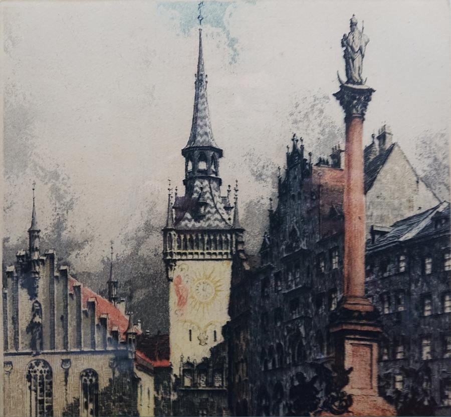 Oryginalna duża grafika wykonana w technice kolorowej akwaforty. Przedstawia widok z Monachium z historyczny Marienplatz. Akwaforta oprawiona w ramę w kolorze złotym, zabezpieczona szybą. Sygnowana odręcznie przez artystę ołówkiem w prawym dolnym narożniku. Gratka dla kolekcjonera grafika rzadko pojawia się na rynku antykwarycznym.