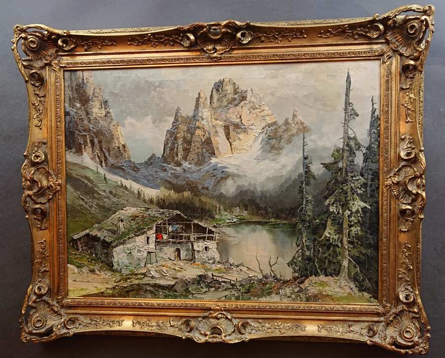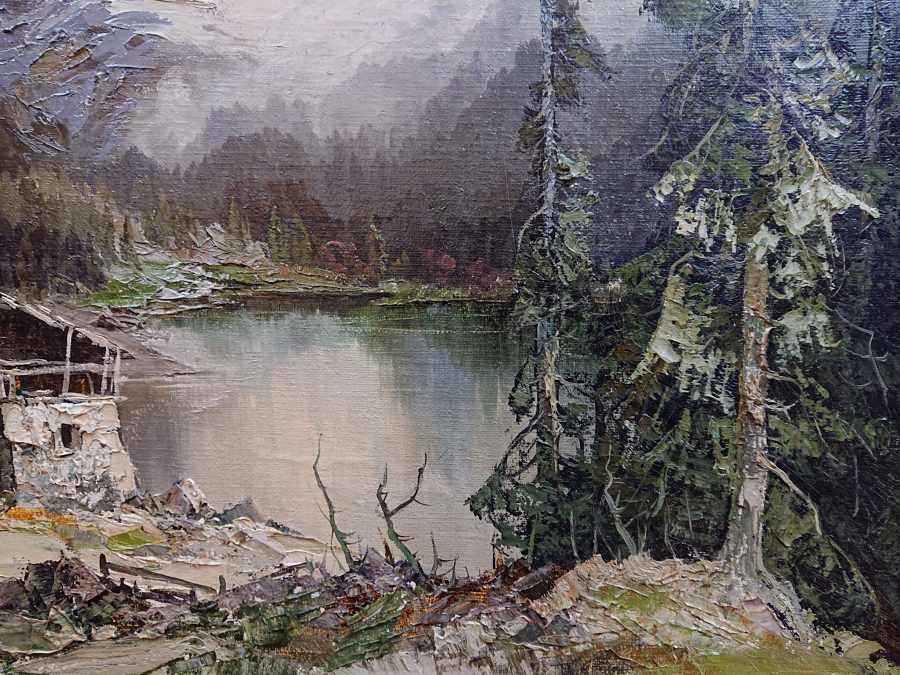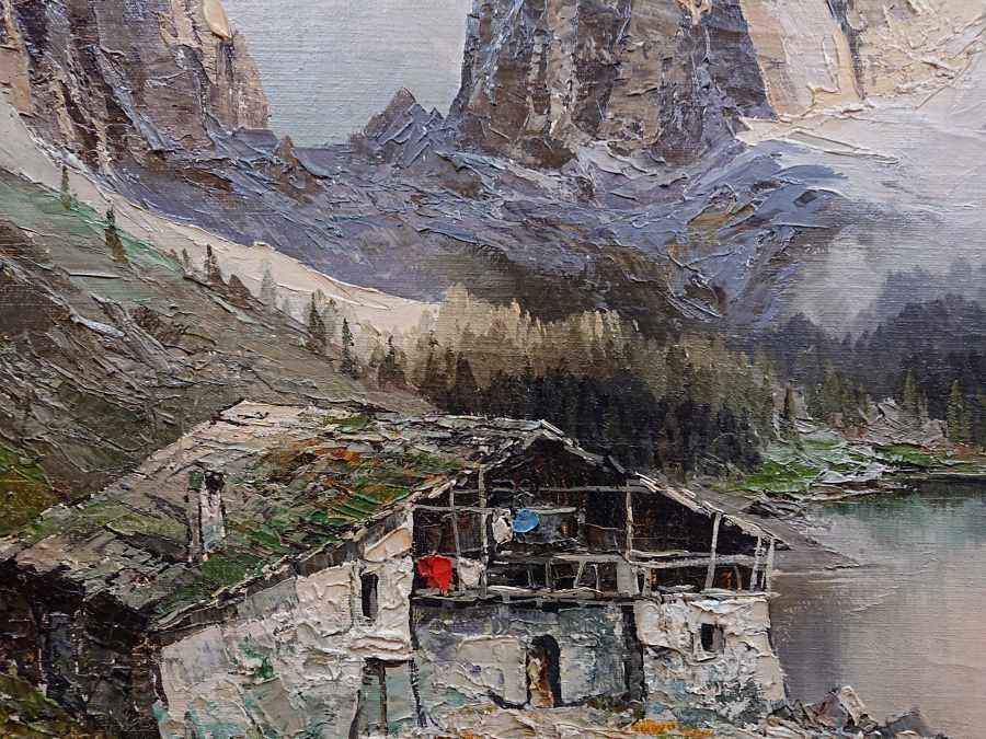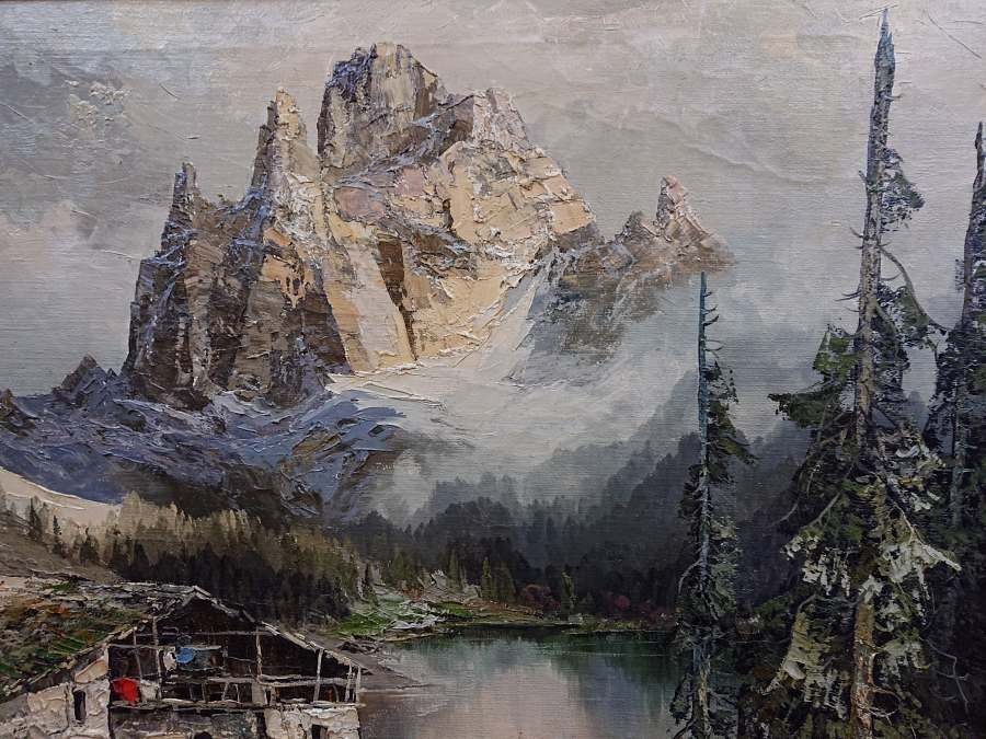 Oryginalny, wyjątkowo dekoracyjny obraz olejny, przedstawiający pejzaż górski. Praca niezwykle cenionego, niemieckiego aukcyjnego artysty Heinza Munnicha. Malarz z niebywałym polotem uwiecznił zachwycającą panoramę górską. Obraz malowany śmiałymi pociągnięciami w technice pędzla i szpachli. Wspaniała, odważna i bogata gama kolorów.