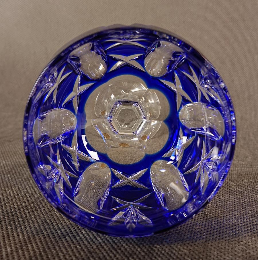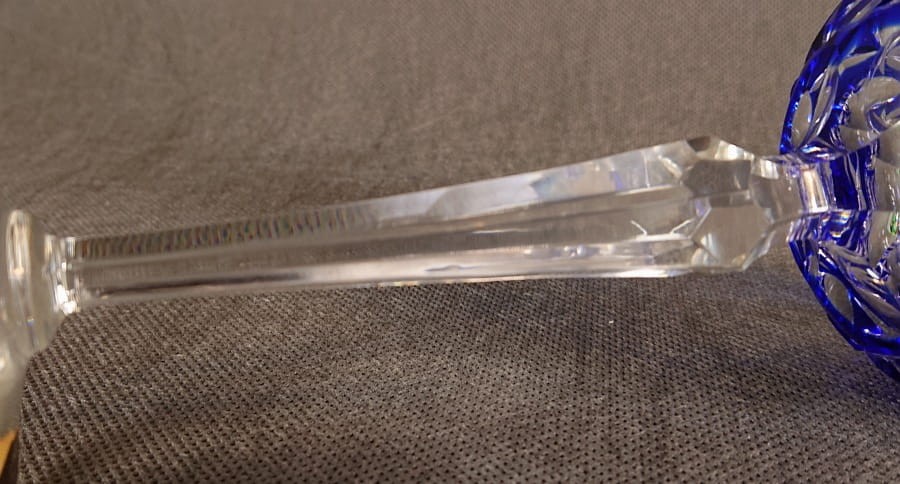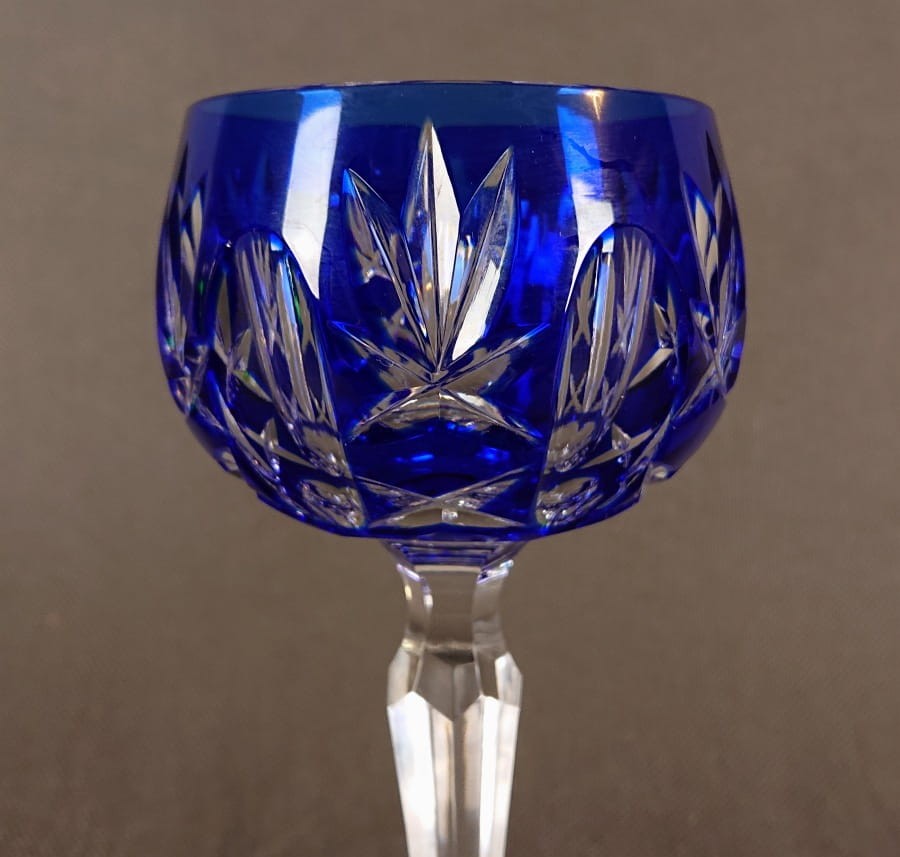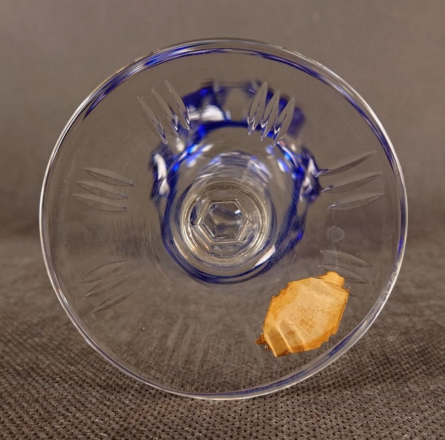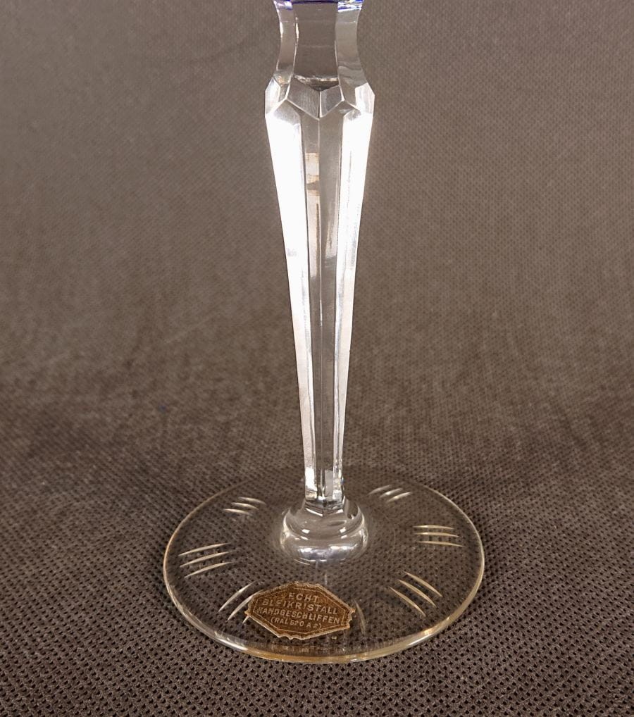 Kielich jest wykonany z wysokiej jakości szkła kryształowego. Wyróżnia go głęboki, żywy kobaltowy błękit czaszy, co jest efektem techniki szkła nakładanego (overlay), gdzie bezbarwna warstwa szkła jest pokryta barwną warstwą, a następnie szlifowana, by odsłonić przezroczyste elementy. To połączenie intensywnego koloru z krystaliczną przejrzystością szlifów nadaje kielichowi luksusowy i dekoracyjny charakter. Na stopie kielicha widoczna jest oryginalna etykieta, potwierdzająca autentyczność i wysoką jakość wykonania ("ECHT BLEIKRISTALL HANDGESCHLIFFEN" – Prawdziwy kryształ ołowiowy, ręcznie szlifowany).