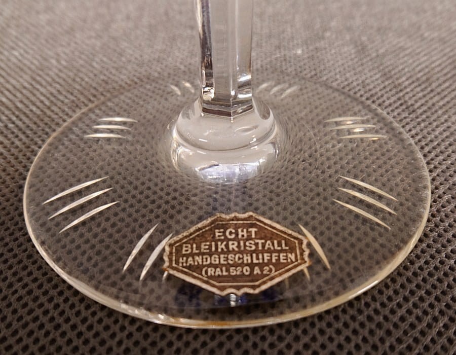 Stopa kielicha jest okrągła i solidna, zapewniająca stabilność. Wykonana z bezbarwnego szkła, jest subtelnie zdobiona krótkimi, skośnymi szlifami w postaci "nacięć" lub "kresek", które dodają jej charakteru bez przeciążania wzoru. Co najważniejsze, na stopie znajduje się oryginalna, prostokątna etykieta z napisem "ECHT BLEIKRISTALL HANDGESCHLIFFEN (RAL 520 A 2)", co potwierdza autentyczność kryształu ołowiowego, ręcznego szlifowania oraz prawdopodobnie wskazuje na specyficzny odcień barwy (RAL 520 A 2 - kobaltowy błękit).