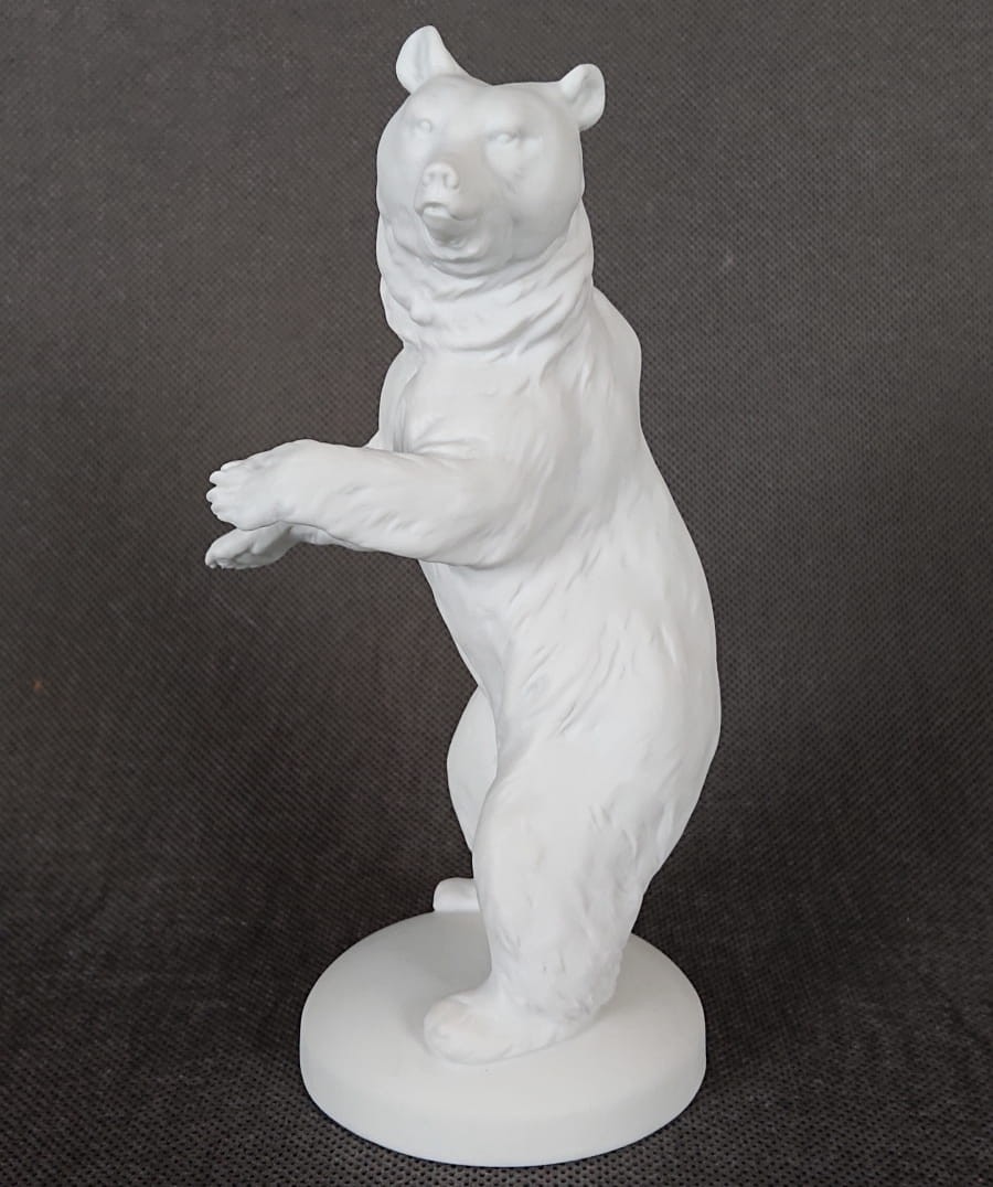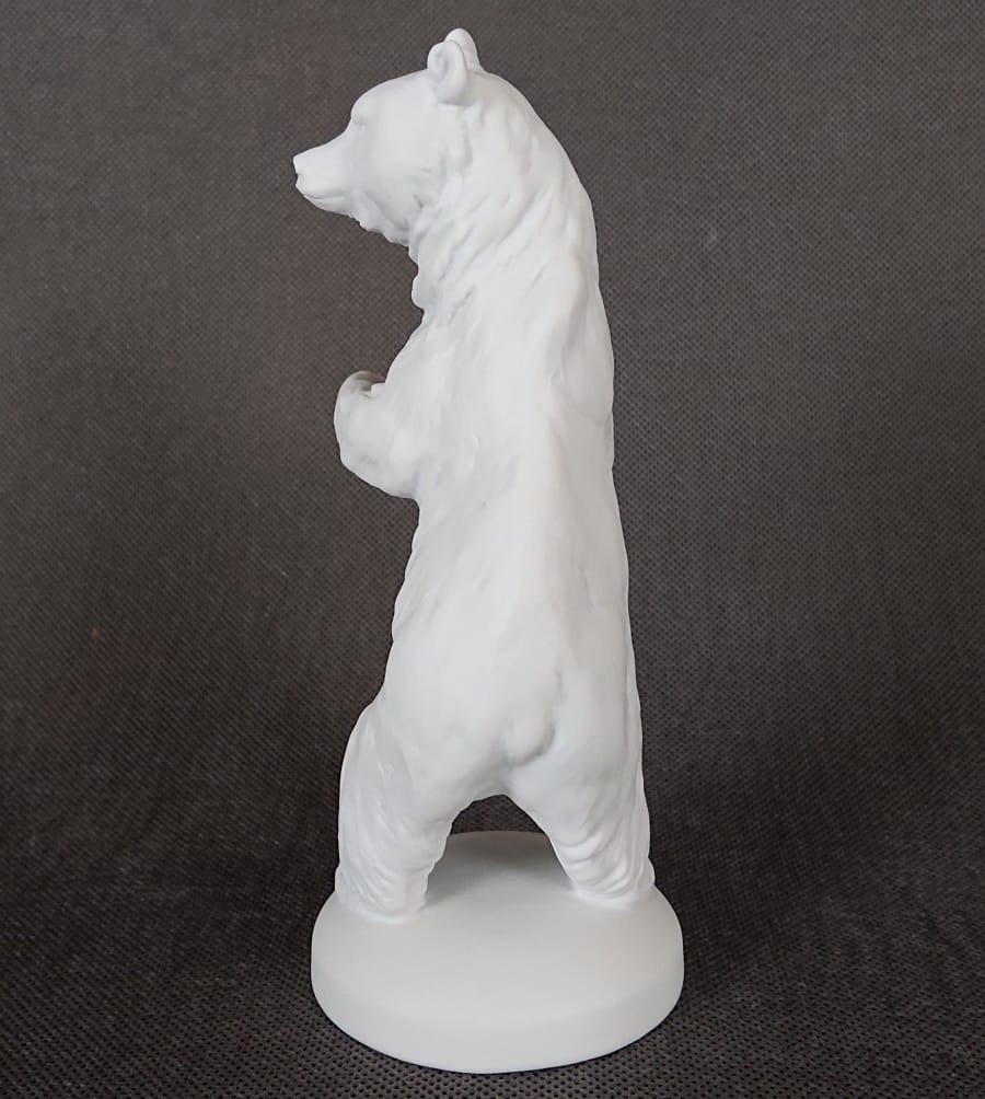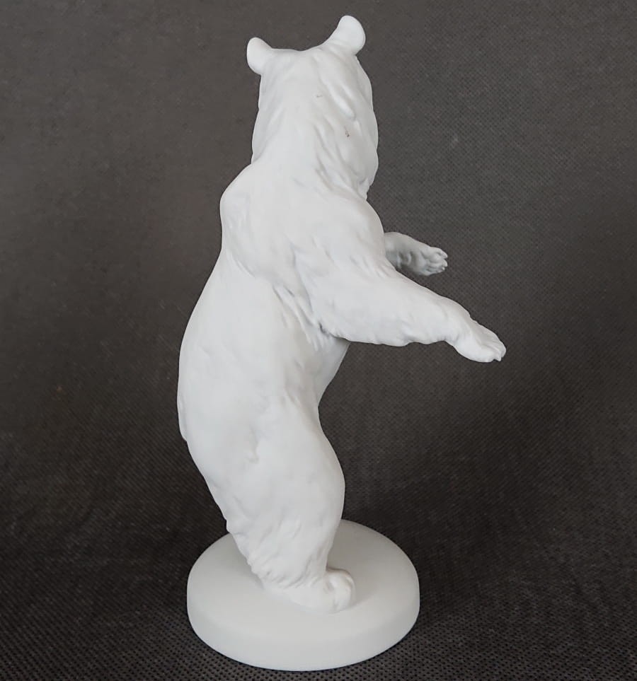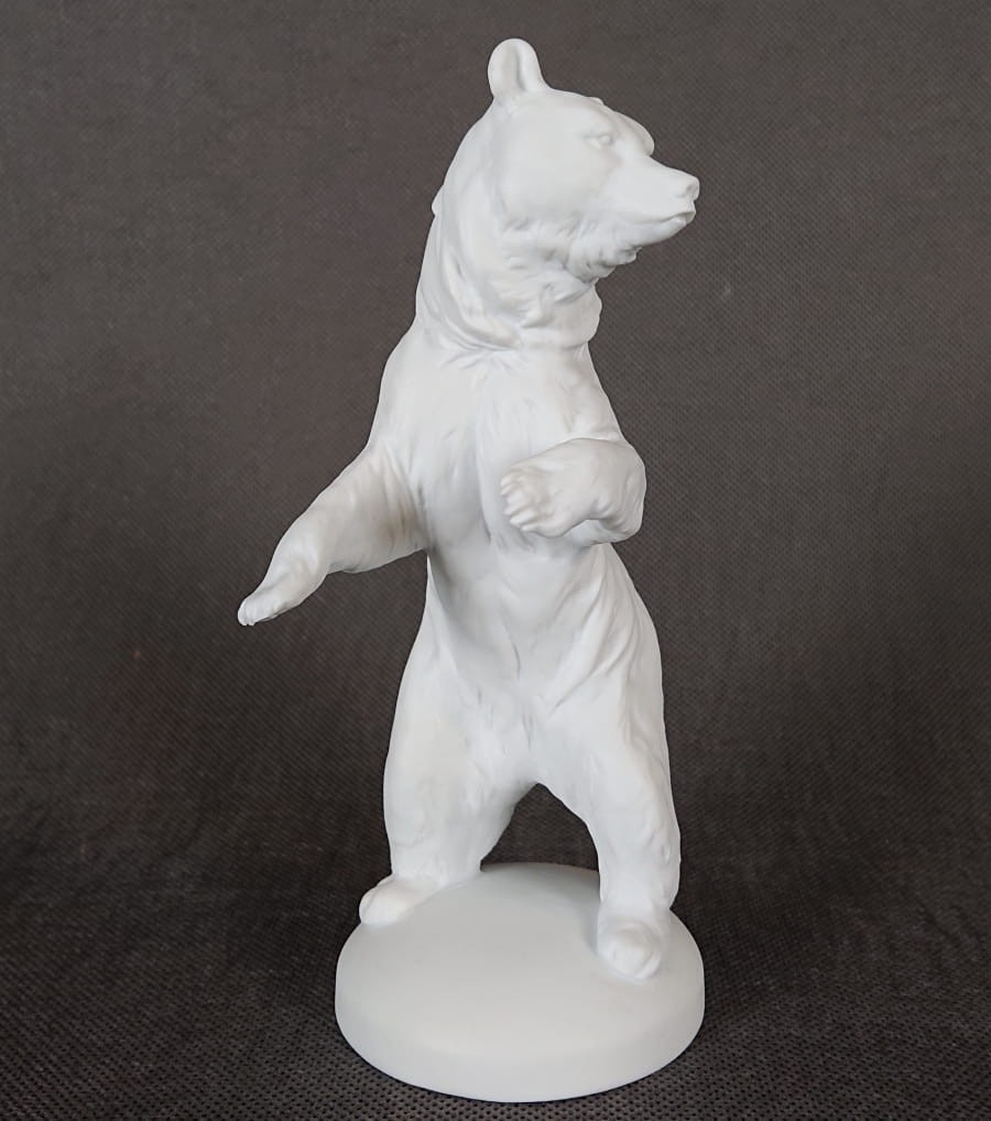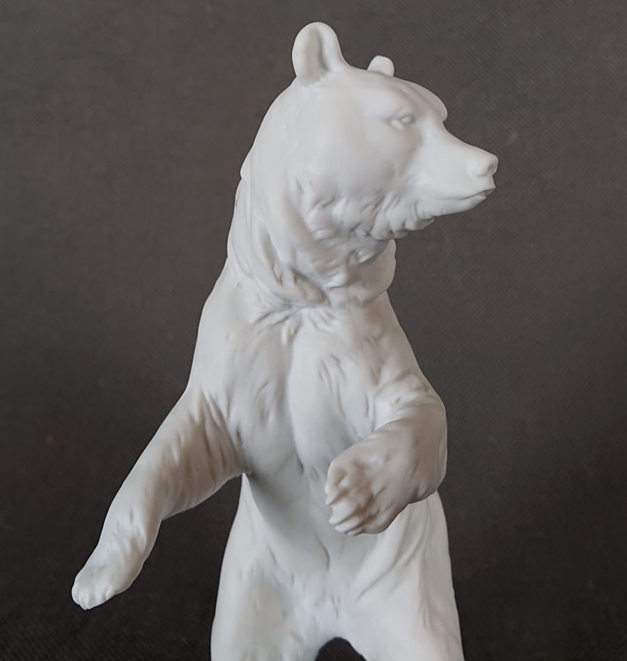 Oryginalna figurka przedstawiająca niedźwiedzia w pozycji stojącej. Wykonana ze śnieżnobiałej porcelany nie glazurowanej - tak zwany (biskwit). Zaprojektowana przez światowej sławy niemieckiego artystę co jest gwarancją perfekcyjnego wymodelowania i dbałością o szczegóły. Sygnowana wyciskiem model: 793, dodatkowo znakiem firmowym od dołu podstawy. Kolekcjonerska porcelana o niezwykle wyszukanym i eleganckim kształcie i znanej marce.