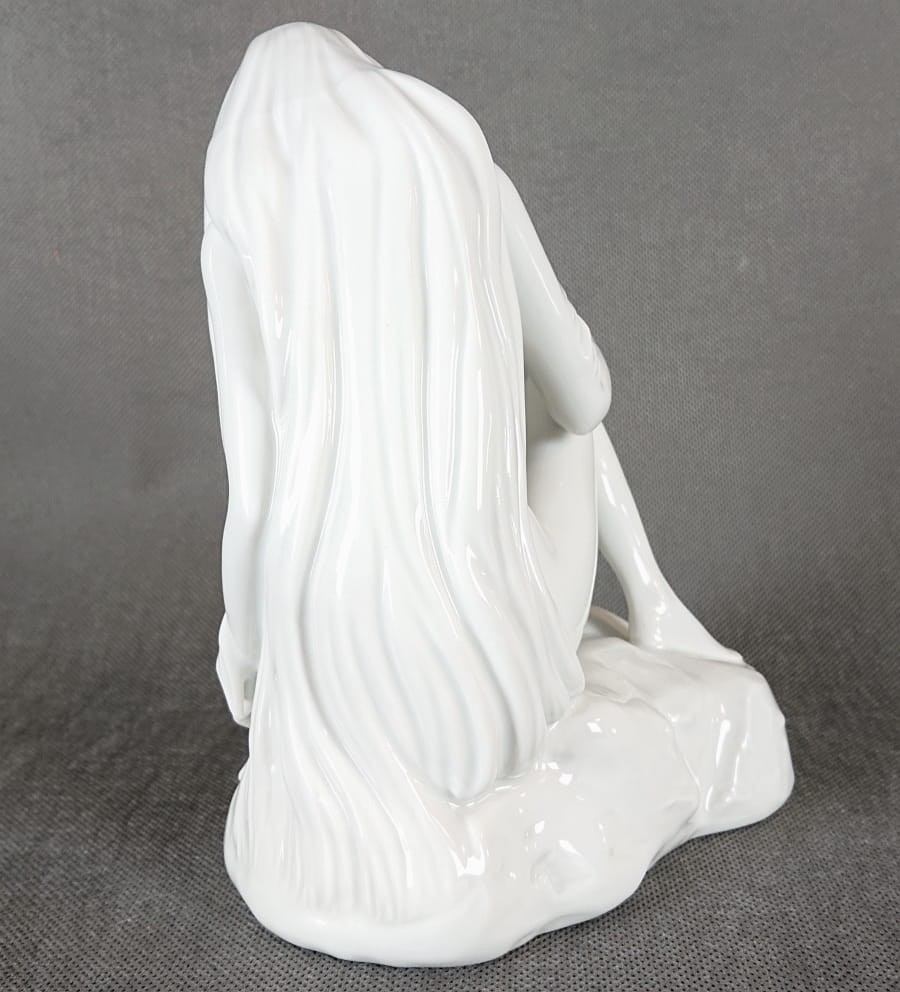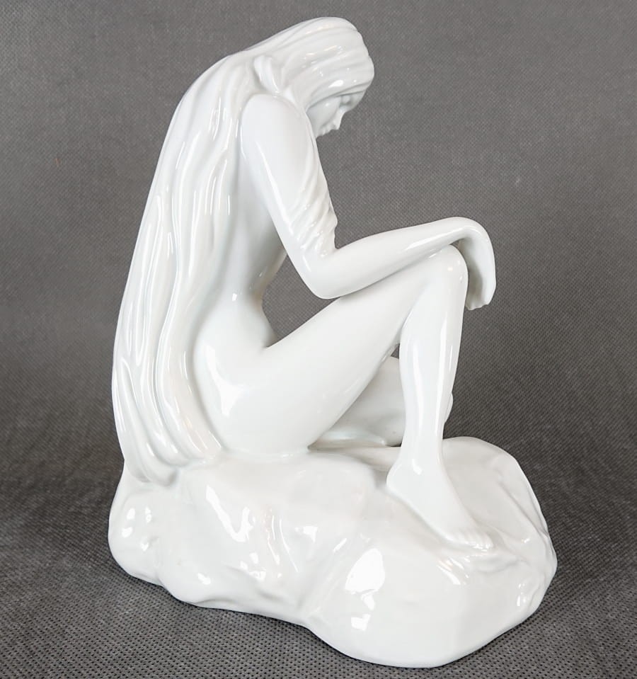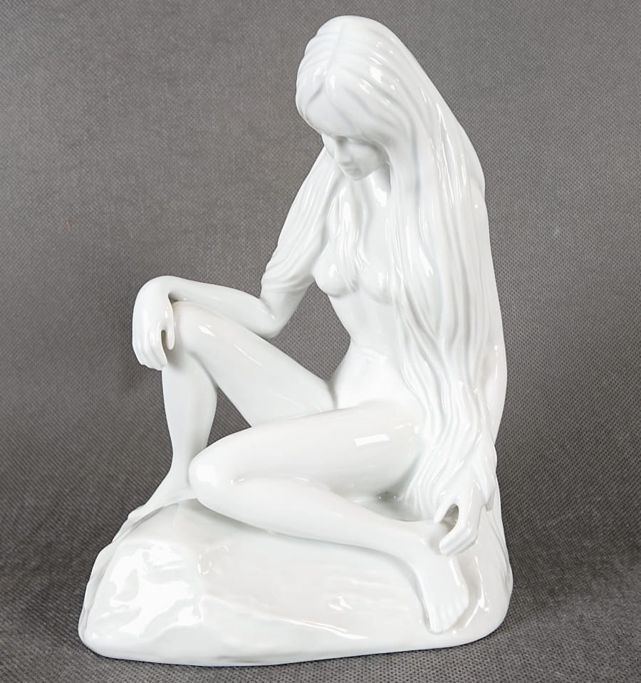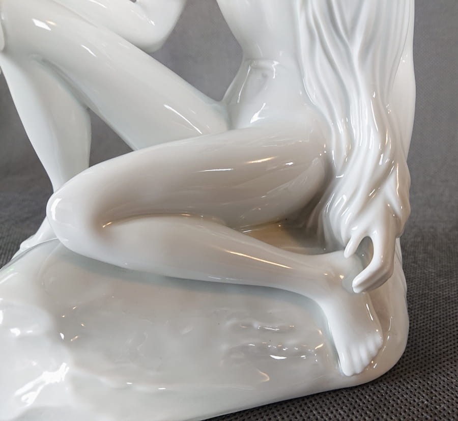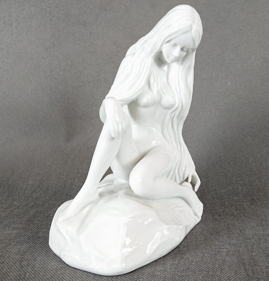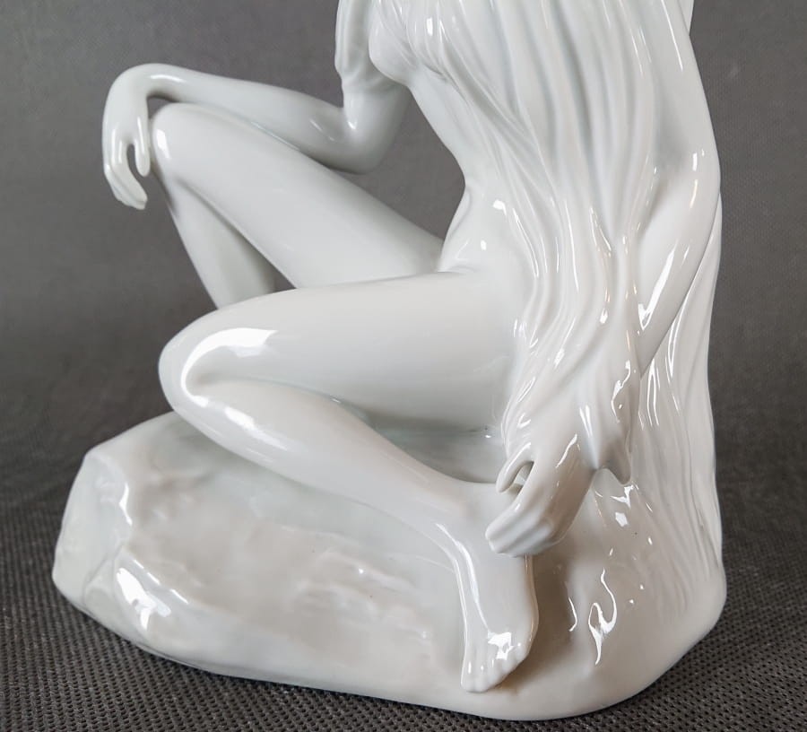 Porcelanowa figurka niemieckiej marki Höchst przedstawia siedzącą, północną nimfę o długich, swobodnie opadających włosach. Całość wykonana jest z cienkościennej, śnieżnobiałej porcelany o wysokim połysku. Figurkę wyrzeźbiono z zachowaniem harmonijnych, miękkich linii i naturalistycznych proporcji: ciało kobiety ma subtelnie zarysowane mięśnie i zaokrąglone kształty, a dłonie i stopy – delikatne, niemal filigranowe.