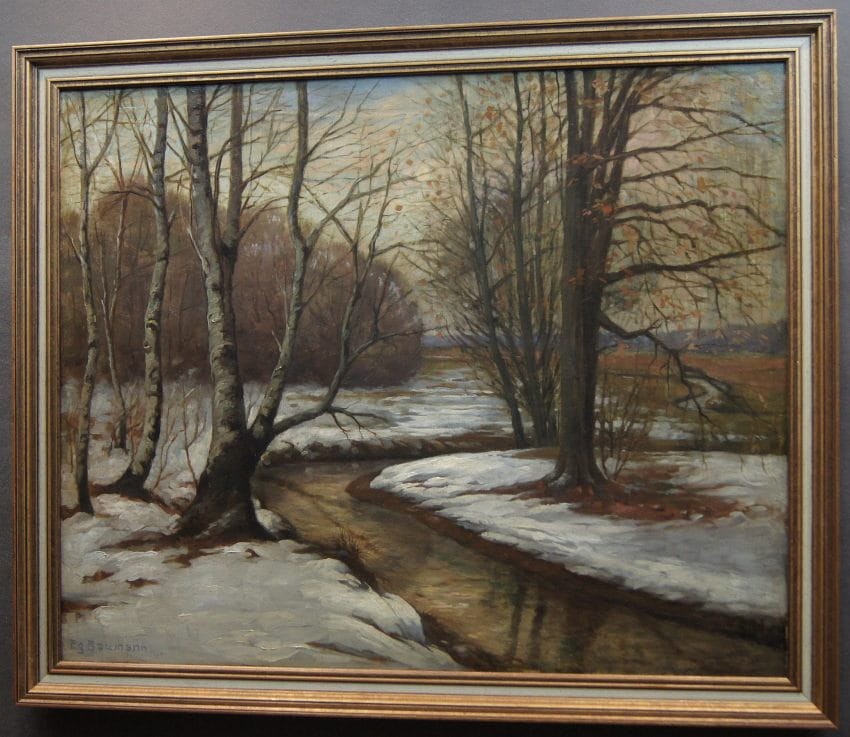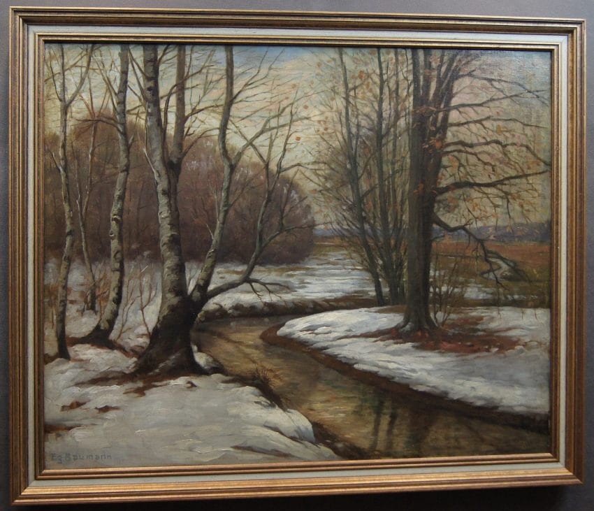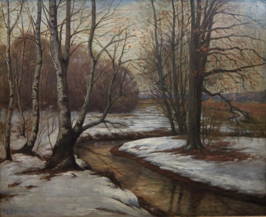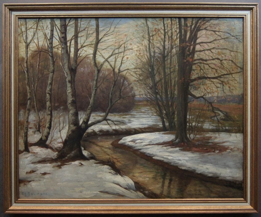 Kolejny z twórczości niemieckiego artysty Egona Baumanna oryginalny pejzaż olejny na płótnie. Obraz stworzony w mistrzowskim wydaniu. Malarz bardzo realistycznie ukazuje scenerię krajobrazową i niezwykle precyzyjnie przedstawia panujące warunki świetlne i pogodowe. Charakterystyczna twórczość dla akademickiego malarstwa plenerowego. Jest to jedno z ciekawszych dzieł tego artysty.