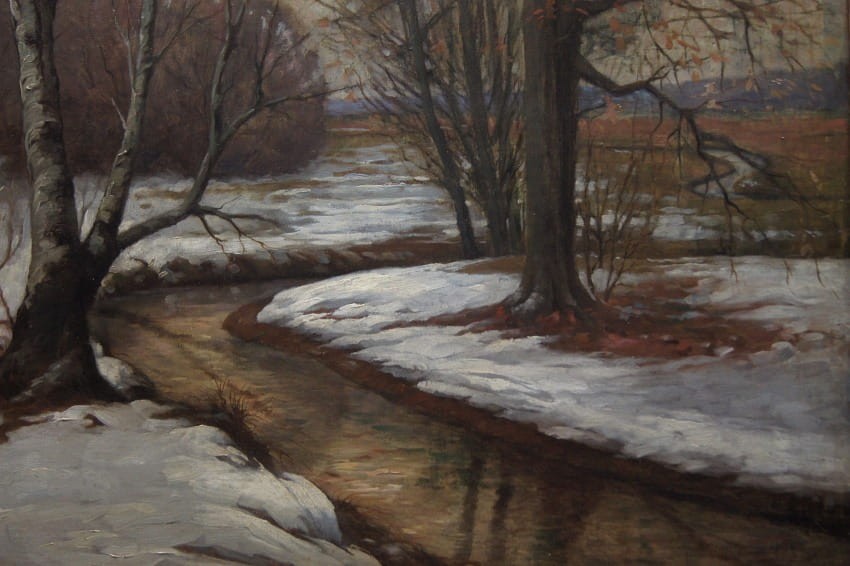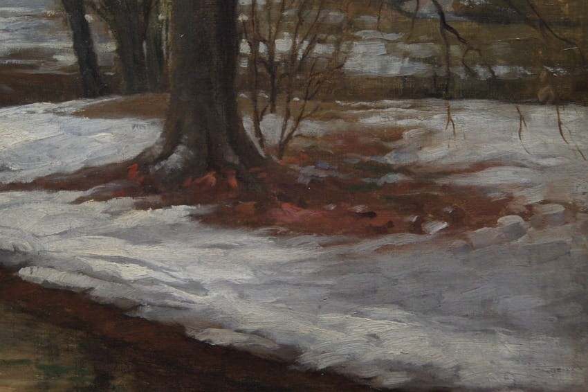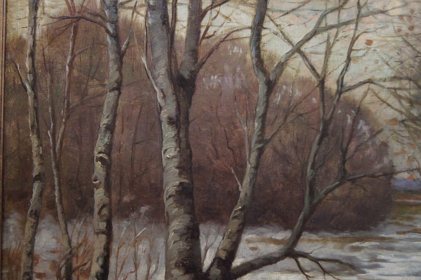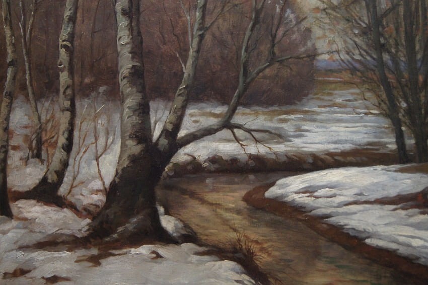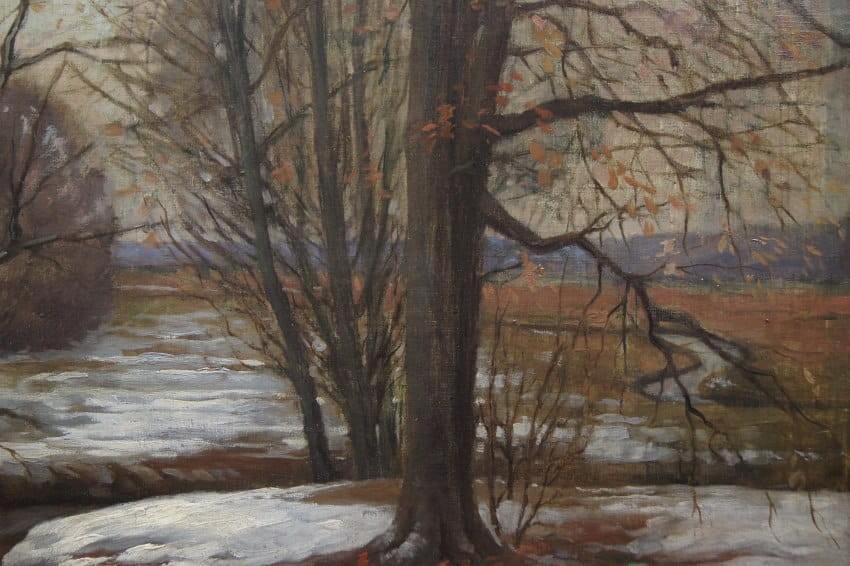 Nostalgiczny zimowy pejzaż olejny Egon Baumann