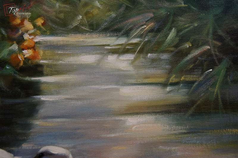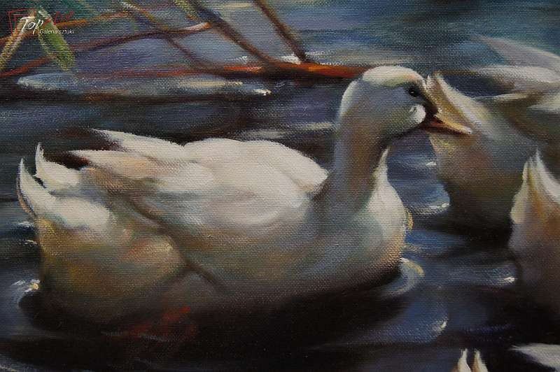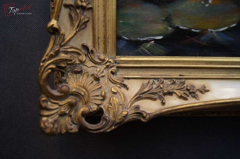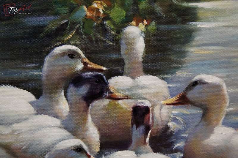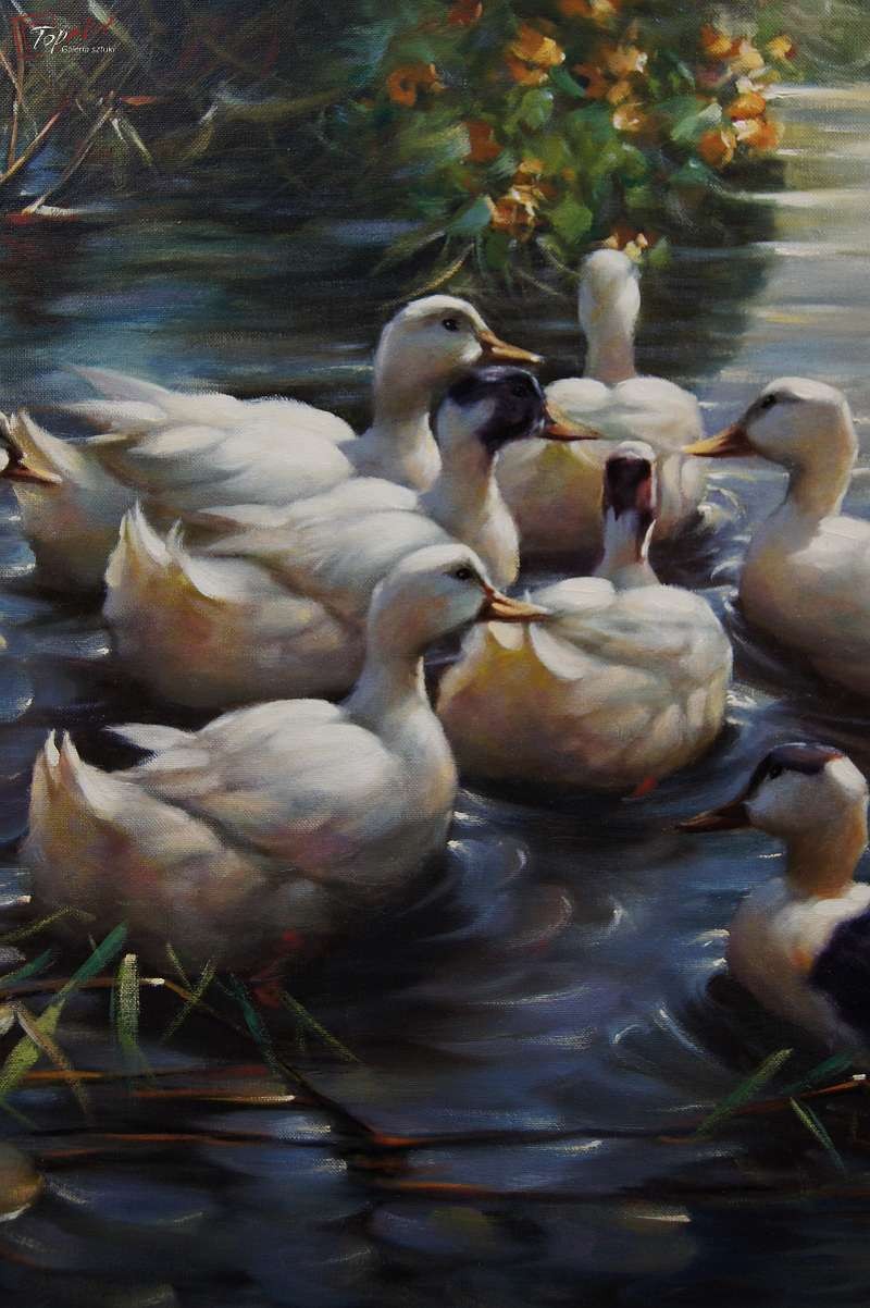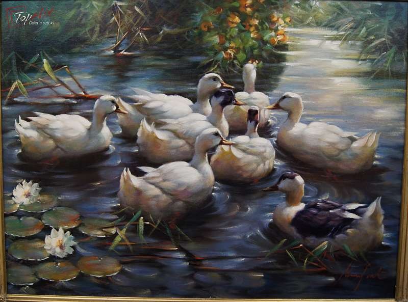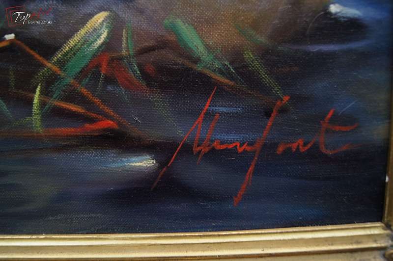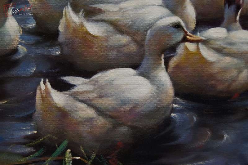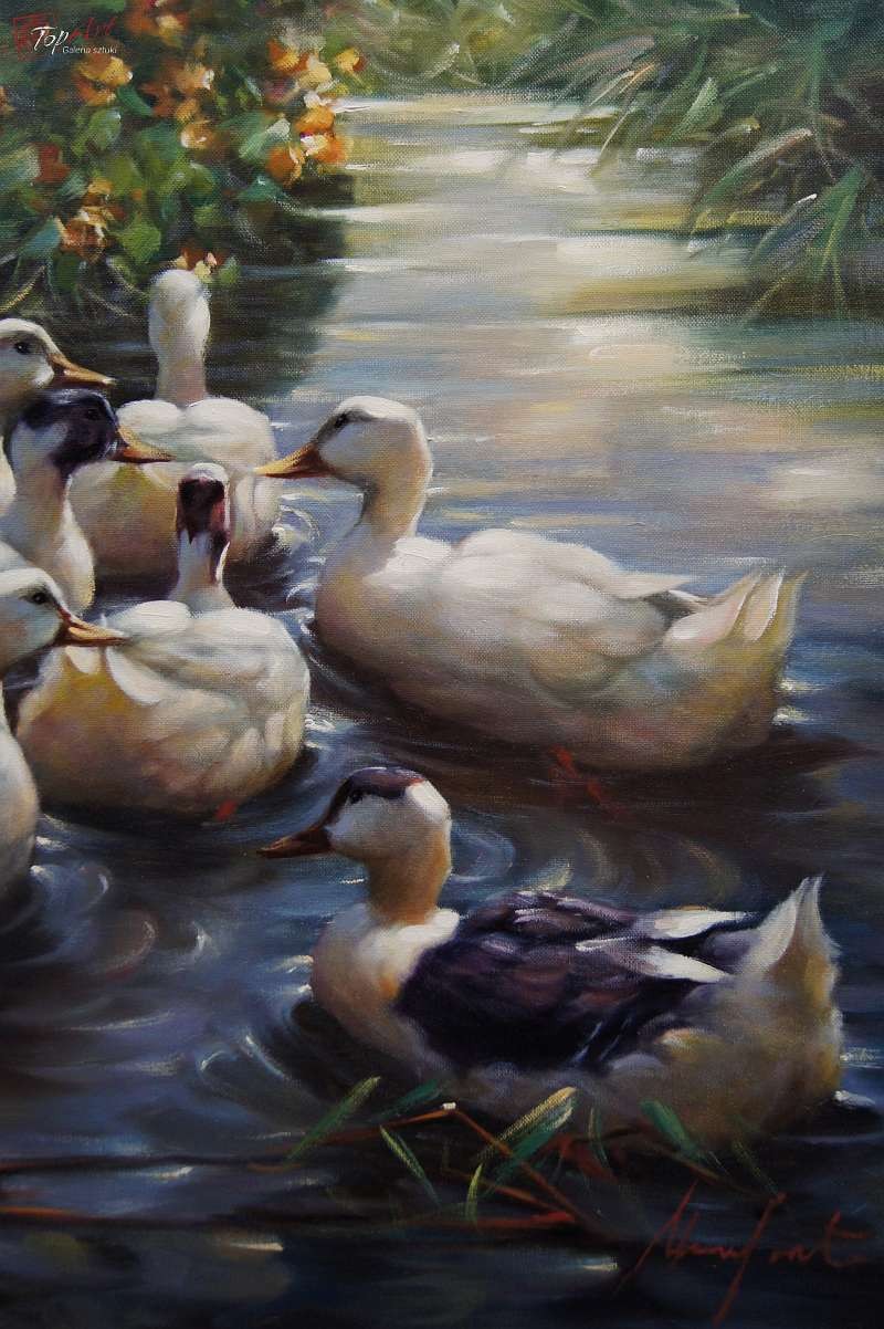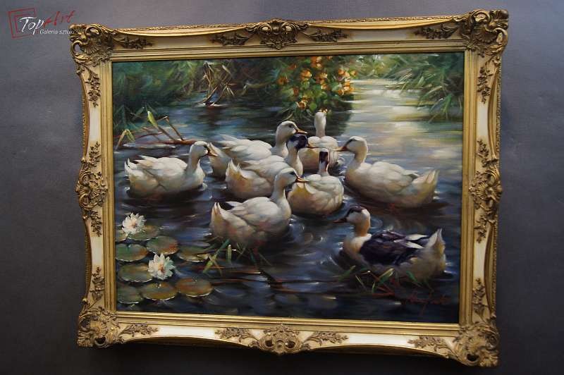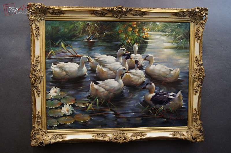 Duży autentyczny, niezwykle dekoracyjny malowany z wielkim polotem, oryginalny obraz olejny malowany na płótnie przedstawiający kaczki na stawie., Dzieło.pochodzi z lat 60 - XX wieku. Autorem tej pracy jest Gerhard Merfort. Obraz malowany w technice pędzla. Sygnowany prawy dół Merfort. Całość oprawiona w oryginalną przestrzenną ramę. Dzieło polecamy - jest niezwykle dekoracyjne. Obrazy artysty cieszą się dużym powodzeniem i są pożądane na aukcjach sztuki. Obraz do powieszenia na ścianie. Stan zachowania - bardzo dobry. Wymiary: całości z ramą 74 cm x 94 cm, płótno 60 cm x 80 cm.
