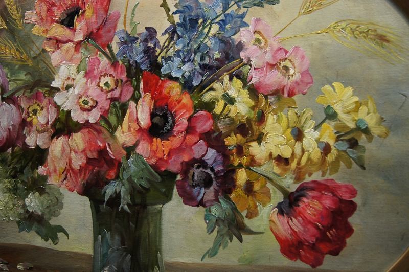 Subtelna owalna praca autorstwa znanej niemieckiej malarki Hedwig Petermann. Przedstawia wspaniałą kompozycję barwnych ogrodowych kwiatów, wyróżniających się swoją dekoracyjnością, łagodnym kolorytem oraz delikatnym nastrojem.