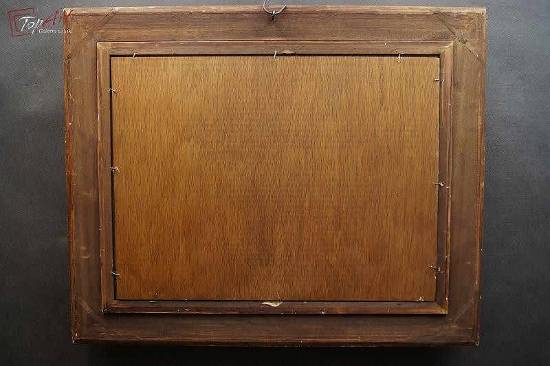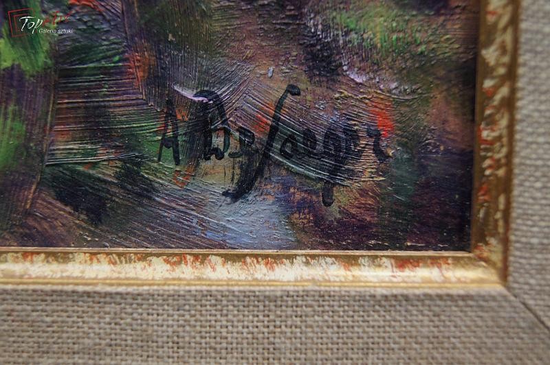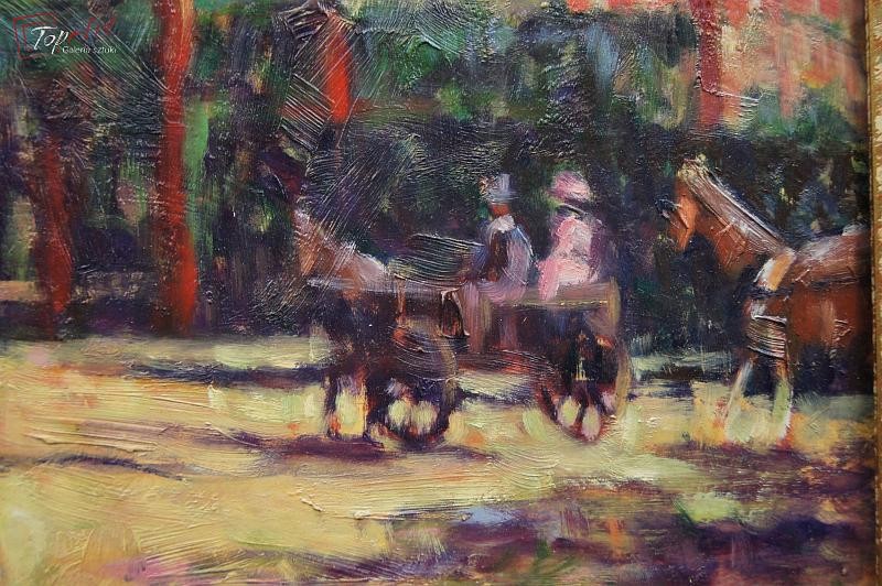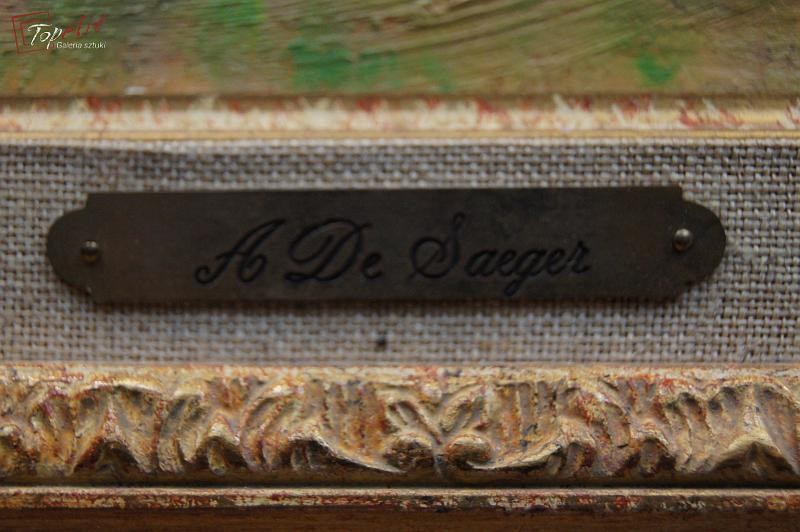 Przepiękny obraz, niezwykle dekoracyjny oryginalny, namalowany na sklejce przedstawiający scenę z życia spacer w parku, Autorem tej pracy jest Anna de Saeger. Obraz malowany w technice pędzla. Sygnowany prawy dół A de Saeger. Całość oprawiona w oryginalną przestrzenną ramę. Obrazy artystki cieszą się dużym powodzeniem i są pożądane na aukcjach sztuki. Portal Artprice notuje 111 sprzedanych dzieł ceny obrazów malarki kształtują się od kilkuset do kilku tysięcy euro. Obraz do powieszenia na ścianie. Stan zachowania - bardzo dobry. Wymiary: całości z ramą 66 cm x 80 cm, płótno 46 cm x 61 cm.