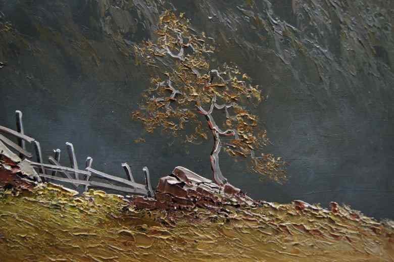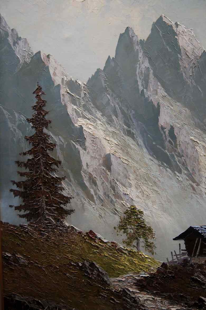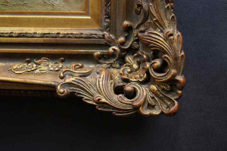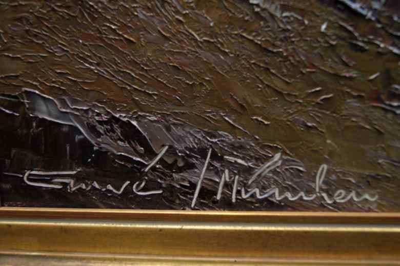 Oryginalny niezwykle dekoracyjny duży obraz malowany farbami olejnymi na płótnie. Zastosowana technika malarska: szpachla, pędzel. Sygnowany lewy dół: GUWE / Munchen. Całość oprawiona w oryginalną,starą,okazałą przestrzenną ramę. iStan zachowania bardzo dobry nie wymaga jakichkolwiek interwencji. Wymiary: całości z ramą 92 cm x 122 cm, płótno 70 cm x 100 cm.