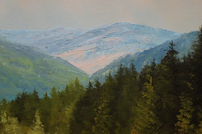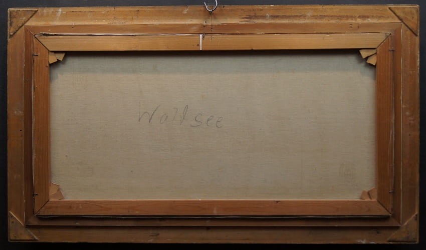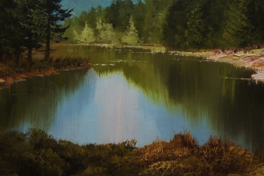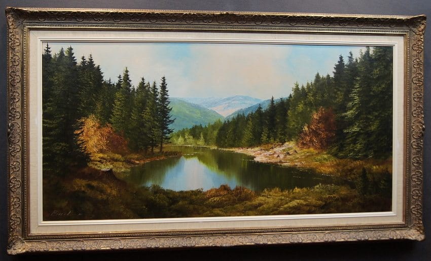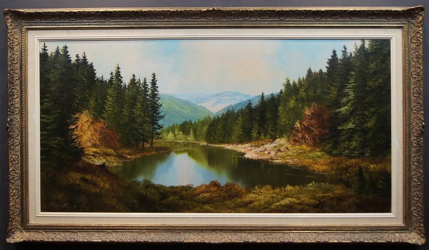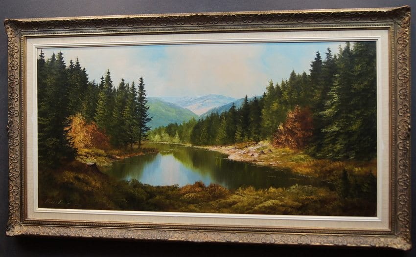 Oryginalny, dużych rozmiarów obraz olejny, mistrzowsko namalowany na płótnie, przedstawiający niezwykle barwne przedgórze z jeziorem na pierwszym planie i gęstą roślinnością. Wspaniała gra pastelowych kolorów. Autorem tej pracy jest Heinrich Bachmann.
